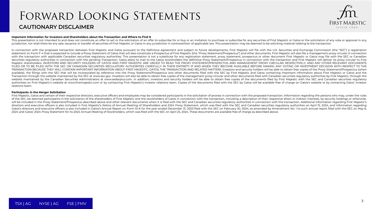 CAUTIONARY DISCLAIMER Important Information for Investors and Shareholders about the Transaction and Where to Find It This presentation is not intended to and does not constitute an offer to sell or the solicitation of an offer to subscribe for or buy or an invitation to purchase or subscribe for any securities of First Majestic or Gatos or the solicitation of any vote or approval in any jurisdiction, nor shall there be any sale, issuance or transfer of securities of First Majestic or Gatos in any jurisdiction in contravention of applicable law. This presentation may be deemed to be soliciting material relating to the transaction. In connection with the proposed transaction between First Majestic and Gatos pursuant to the Definitive Agreement and subject to future developments, First Majestic will file with the U.S. Securities and Exchange Commission (the “SEC”) a registration statement on Form F-4 that is expected to include a Proxy Statement of Gatos that will also constitute a Prospectus of First Majestic (the “Proxy Statement/Prospectus”) and other documents. First Majestic will also file a management proxy circular in connection with the transaction with applicable Canadian securities regulatory authorities. This presentation is not a substitute for any registration statement, proxy statement, prospectus or other document First Majestic or Gatos may file with the SEC or Canadian securities regulatory authorities in connection with the pending Transaction. Gatos plans to mail to the Gatos stockholders the definitive Proxy Statement/Prospectus in connection with the transaction and First Majestic will deliver its proxy circular to First Majestic shareholders. INVESTORS AND SECURITY HOLDERS OF GATOS AND FIRST MAJESTIC ARE URGED TO READ THE PROXY STATEMENT/PROSPECTUS AND MANAGEMENT PROXY CIRCULAR, RESPECTIVELY, AND ANY OTHER RELEVANT DOCUMENTS FILED OR TO BE FILED WITH THE SEC OR CANADIAN SECURITIES REGULATORY AUTHORITIES CAREFULLY IN THEIR ENTIRETY IF AND WHEN THEY BECOME AVAILABLE BEFORE MAKING ANY VOTING OR INVESTMENT DECISION WITH RESPECT TO THE TRANSACTION BECAUSE THEY WILL CONTAIN IMPORTANT INFORMATION ABOUT FIRST MAJESTIC, GATOS, THE TRANSACTION AND RELATED MATTERS. Investors and security holders will be able to obtain free copies of the Proxy Statement/Prospectus (when available), the filings with the SEC that will be incorporated by reference into the Proxy Statement/Prospectus and other documents filed with the SEC by First Majestic and Gatos containing important information about First Majestic or Gatos and the Transaction through the website maintained by the SEC at www.sec.gov. Investors will also be able to obtain free copies of the management proxy circular and other documents filed with Canadian securities regulatory authorities by First Majestic, through the website maintained by the Canadian Securities Administrators at www.sedarplus.com. In addition, investors and security holders will be able to obtain free copies of the documents filed by First Majestic with the SEC and Canadian securities regulatory authorities on First Majestic’s website at www.firstmajestic.com or by contacting First Majestic’s investor relations team. Copies of the documents filed with the SEC by Gatos will be available free of charge on Gatos’s website or by contacting Gatos’ investor relations team. Participants in the Merger Solicitation First Majestic, Gatos and certain of their respective directors, executive officers and employees may be considered participants in the solicitation of proxies in connection with the proposed transaction. Information regarding the persons who may, under the rules of the SEC, be deemed participants in the solicitation of the shareholders of First Majestic and the stockholders of Gatos in connection with the transaction, including a description of their respective direct or indirect interests, by security holdings or otherwise, will be included in the Proxy Statement/Prospectus described above and other relevant documents when it is filed with the SEC and Canadian securities regulatory authorities in connection with the transaction. Additional information regarding First Majestic’s directors and executive officers is also included in First Majestic’s Notice of Annual Meeting of Shareholders and 2024 Proxy Statement, which was filed with the SEC and Canadian securities regulatory authorities on April 15, 2024, and information regarding Gatos’s directors and executive officers is also included in Gatos’s Annual Report on Form 10-K for the year ended December 31, 2023 filed with the SEC on February 20, 2024, as amended by Amendment No. 1 to such annual report filed with the SEC on May 6, 2024 and Gatos’ 2024 Proxy Statement for its 2024 Annual Meeting of Stockholders, which was filed with the SEC on April 25, 2024. These documents are available free of charge as described above. 3 TSX | AG NYSE | AG FSE | FMV