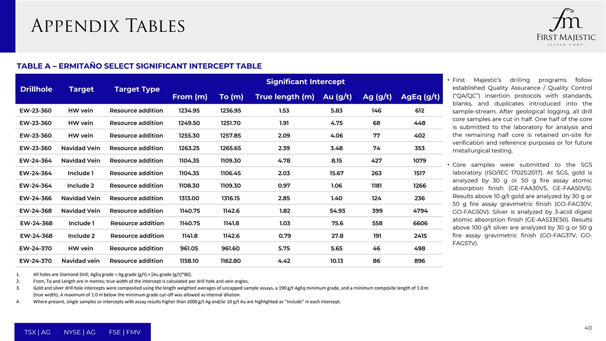 TABLE A – ERMITAÑO SELECT SIGNIFICANT INTERCEPT TABLE • First Majestic’s drilling programs follow Significant Intercept established Quality Assurance / Quality Control Drillhole Target Target Type (“QA/QC”) insertion protocols with standards, From (m) To (m) True length (m) Au (g/t) Ag (g/t) AgEq (g/t) blanks, and duplicates introduced into the EW-23-360 HW vein Resource addition 1234.95 1236.95 1.53 5.83 146 612 sample-stream. After geological logging, all drill core samples are cut in half. One half of the core EW-23-360 HW vein Resource addition 1249.50 1251.70 1.91 4.75 68 448 is submitted to the laboratory for analysis and the remaining half core is retained on-site for EW-23-360 HW vein Resource addition 1255.30 1257.85 2.09 4.06 77 402 verification and reference purposes or for future EW-23-360 Navidad Vein Resource addition 1263.25 1265.65 2.39 3.48 74 353 metallurgical testing. EW-24-364 Navidad Vein Resource addition 1104.35 1109.30 4.78 8.15 427 1079 • Core samples were submitted to the SGS laboratory (ISO/IEC 17025:2017). At SGS, gold is EW-24-364 Include 1 Resource addition 1104.35 1106.45 2.03 15.67 263 1517 analyzed by 30 g or 50 g fire assay atomic EW-24-364 Include 2 Resource addition 1108.30 1109.30 0.97 1.06 1181 1266 absorption finish (GE-FAA30V5, GE-FAA50V5). Results above 10 g/t gold are analyzed by 30 g or EW-24-366 Navidad Vein Resource addition 1313.00 1316.15 2.85 1.40 124 236 50 g fire assay gravimetric finish (GO-FAG30V, EW-24-368 Navidad Vein Resource addition 1140.75 1142.6 1.82 54.93 399 4794 GO-FAG50V). Silver is analyzed by 3-acid digest atomic absorption finish (GE-AAS33E50). Results EW-24-368 Include 1 Resource addition 1140.75 1141.8 1.03 75.6 558 6606 above 100 g/t silver are analyzed by 30 g or 50 g fire assay gravimetric finish (GO-FAG37V, GO- EW-24-368 Include 2 Resource addition 1141.8 1142.6 0.79 27.8 191 2415 FAG57V). EW-24-370 HW vein Resource addition 961.05 961.60 5.75 5.65 46 498 EW-24-370 Navidad vein Resource addition 1158.10 1162.80 4.42 10.13 86 896 1. All holes are Diamond Drill; AgEq grade = Ag grade (g/t) + [Au grade (g/t)*80]. 2. From, To and Length are in metres; true width of the intercept is calculated per drill hole and vein angles. 3. Gold and silver drill hole intercepts were composited using the length weighted averages of uncapped sample assays, a 190 g/t AgEq minimum grade, and a minimum composite length of 1.0 m (true width). A maximum of 1.0 m below the minimum grade cut-off was allowed as internal dilution. 4. Where present, single samples or intercepts with assay results higher than 1000 g/t Ag and/or 10 g/t Au are highlighted as “Include” in each intercept. 40 TSX | AG NYSE | AG FSE | FMV