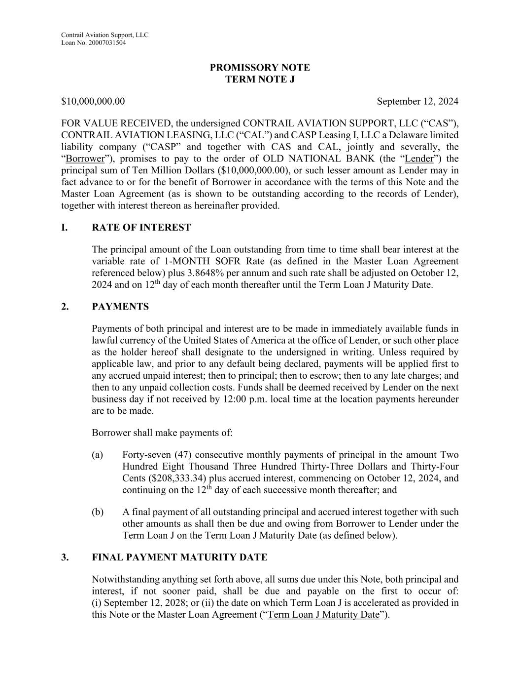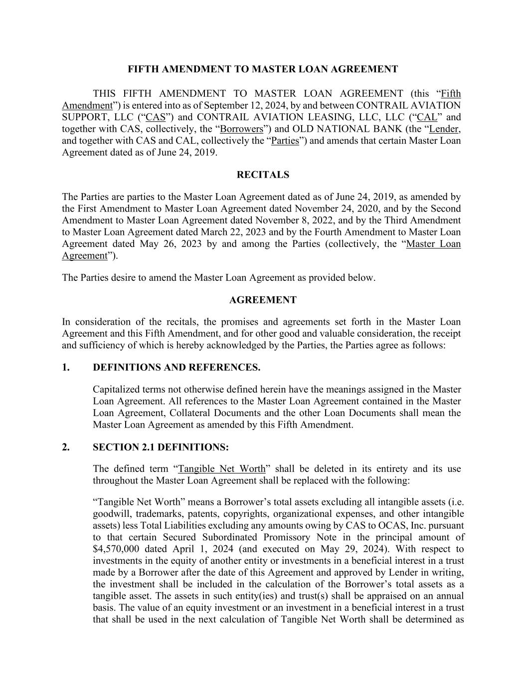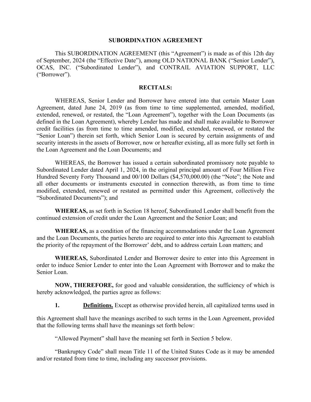 SUBORDINATION AGREEMENT This SUBORDINATION AGREEMENT (this “Agreement”) is made as of this 12th day of September, 2024 (the “Effective Date”), among OLD NATIONAL BANK (“Senior Lender”), OCAS, INC. (“Subordinated Lender”), and CONTRAIL AVIATION SUPPORT, LLC (“Borrower”). RECITALS: WHEREAS, Senior Lender and Borrower have entered into that certain Master Loan Agreement, dated June 24, 2019 (as from time to time supplemented, amended, modified, extended, renewed, or restated, the “Loan Agreement”), together with the Loan Documents (as defined in the Loan Agreement), whereby Lender has made and shall make available to Borrower credit facilities (as from time to time amended, modified, extended, renewed, or restated the “Senior Loan”) therein set forth, which Senior Loan is secured by certain assignments of and security interests in the assets of Borrower, now or hereafter existing, all as more fully set forth in the Loan Agreement and the Loan Documents; and WHEREAS, the Borrower has issued a certain subordinated promissory note payable to Subordinated Lender dated April 1, 2024, in the original principal amount of Four Million Five Hundred Seventy Forty Thousand and 00/100 Dollars ($4,570,000.00) (the “Note”; the Note and all other documents or instruments executed in connection therewith, as from time to time modified, extended, renewed or restated as permitted under this Agreement, collectively the “Subordinated Documents”); and WHEREAS, as set forth in Section 18 hereof, Subordinated Lender shall benefit from the continued extension of credit under the Loan Agreement and the Senior Loan; and WHEREAS, as a condition of the financing accommodations under the Loan Agreement and the Loan Documents, the parties hereto are required to enter into this Agreement to establish the priority of the repayment of the Borrower’ debt, and to address certain Loan matters; and WHEREAS, Subordinated Lender and Borrower desire to enter into this Agreement in order to induce Senior Lender to enter into the Loan Agreement with Borrower and to make the Senior Loan. NOW, THEREFORE, for good and valuable consideration, the sufficiency of which is hereby acknowledged, the parties agree as follows: 1. Definitions. Except as otherwise provided herein, all capitalized terms used in this Agreement shall have the meanings ascribed to such terms in the Loan Agreement, provided that the following terms shall have the meanings set forth below: “Allowed Payment” shall have the meaning set forth in Section 5 below. “Bankruptcy Code” shall mean Title 11 of the United States Code as it may be amended and/or restated from time to time, including any successor provisions.