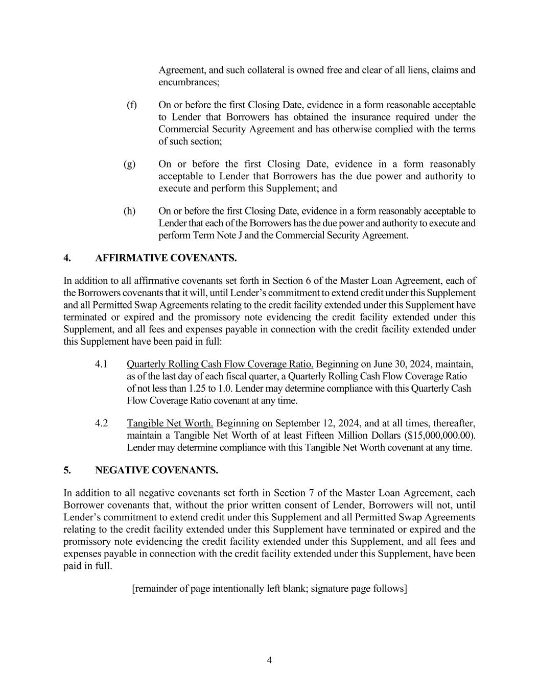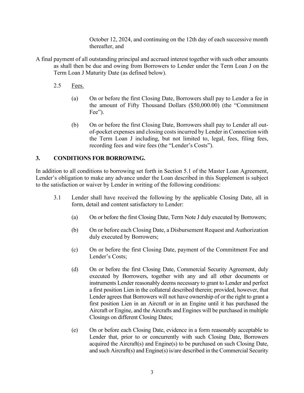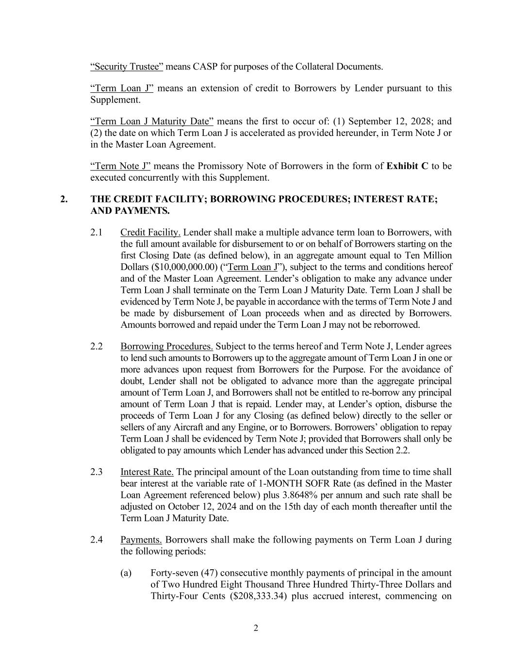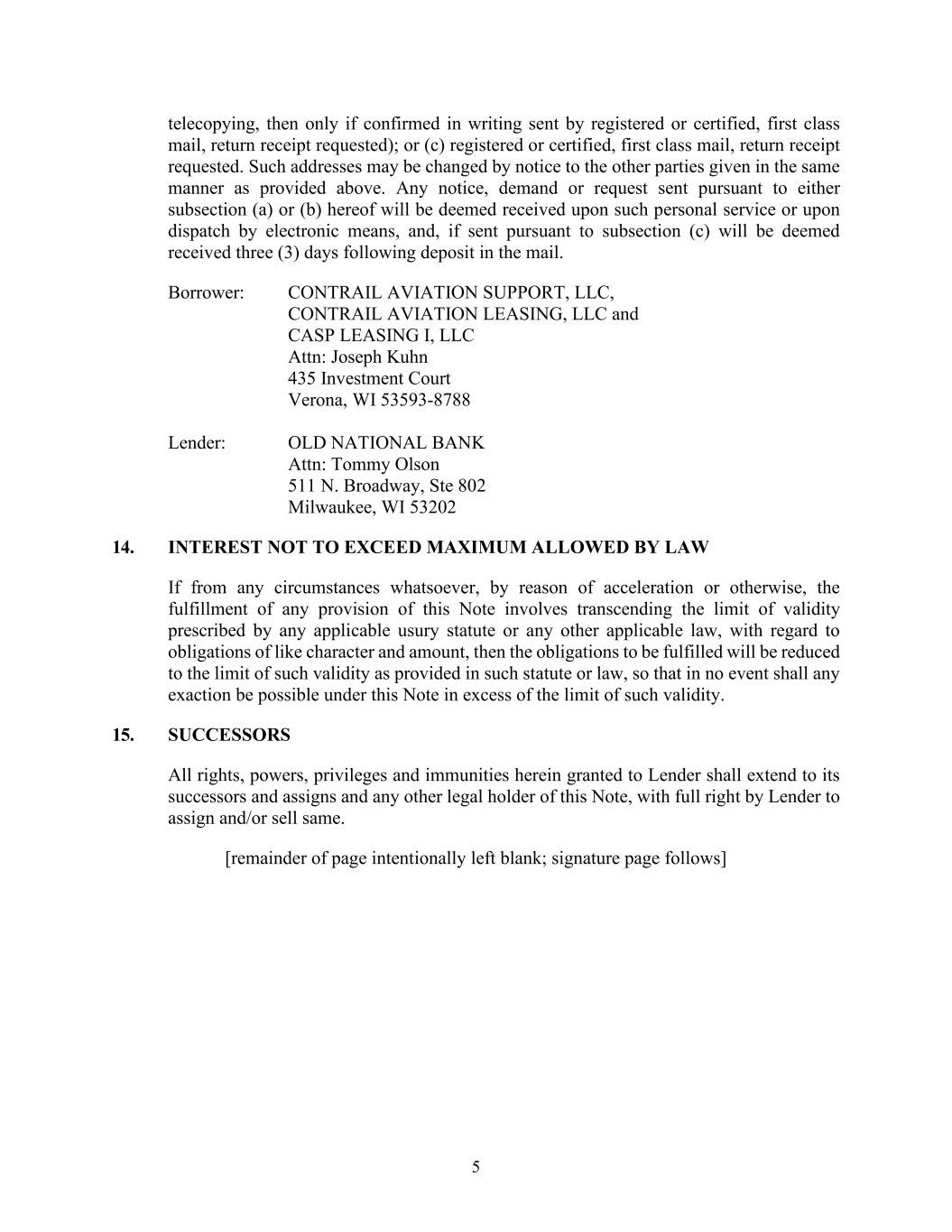 SUBORDINATION AGREEMENT This SUBORDINATION AGREEMENT (this “Agreement”) is made as of this 12th day of September, 2024 (the “Effective Date”), among OLD NATIONAL BANK (“Senior Lender”), OCAS, INC. (“Subordinated Lender”), and CONTRAIL AVIATION SUPPORT, LLC (“Borrower”). RECITALS: WHEREAS, Senior Lender and Borrower have entered into that certain Master Loan Agreement, dated June 24, 2019 (as from time to time supplemented, amended, modified, extended, renewed, or restated, the “Loan Agreement”), together with the Loan Documents (as defined in the Loan Agreement), whereby Lender has made and shall make available to Borrower credit facilities (as from time to time amended, modified, extended, renewed, or restated the “Senior Loan”) therein set forth, which Senior Loan is secured by certain assignments of and security interests in the assets of Borrower, now or hereafter existing, all as more fully set forth in the Loan Agreement and the Loan Documents; and WHEREAS, the Borrower has issued a certain subordinated promissory note payable to Subordinated Lender dated April 1, 2024, in the original principal amount of Four Million Five Hundred Seventy Forty Thousand and 00/100 Dollars ($4,570,000.00) (the “Note”; the Note and all other documents or instruments executed in connection therewith, as from time to time modified, extended, renewed or restated as permitted under this Agreement, collectively the “Subordinated Documents”); and WHEREAS, as set forth in Section 18 hereof, Subordinated Lender shall benefit from the continued extension of credit under the Loan Agreement and the Senior Loan; and WHEREAS, as a condition of the financing accommodations under the Loan Agreement and the Loan Documents, the parties hereto are required to enter into this Agreement to establish the priority of the repayment of the Borrower’ debt, and to address certain Loan matters; and WHEREAS, Subordinated Lender and Borrower desire to enter into this Agreement in order to induce Senior Lender to enter into the Loan Agreement with Borrower and to make the Senior Loan. NOW, THEREFORE, for good and valuable consideration, the sufficiency of which is hereby acknowledged, the parties agree as follows: 1. Definitions. Except as otherwise provided herein, all capitalized terms used in this Agreement shall have the meanings ascribed to such terms in the Loan Agreement, provided that the following terms shall have the meanings set forth below: “Allowed Payment” shall have the meaning set forth in Section 5 below. “Bankruptcy Code” shall mean Title 11 of the United States Code as it may be amended and/or restated from time to time, including any successor provisions.