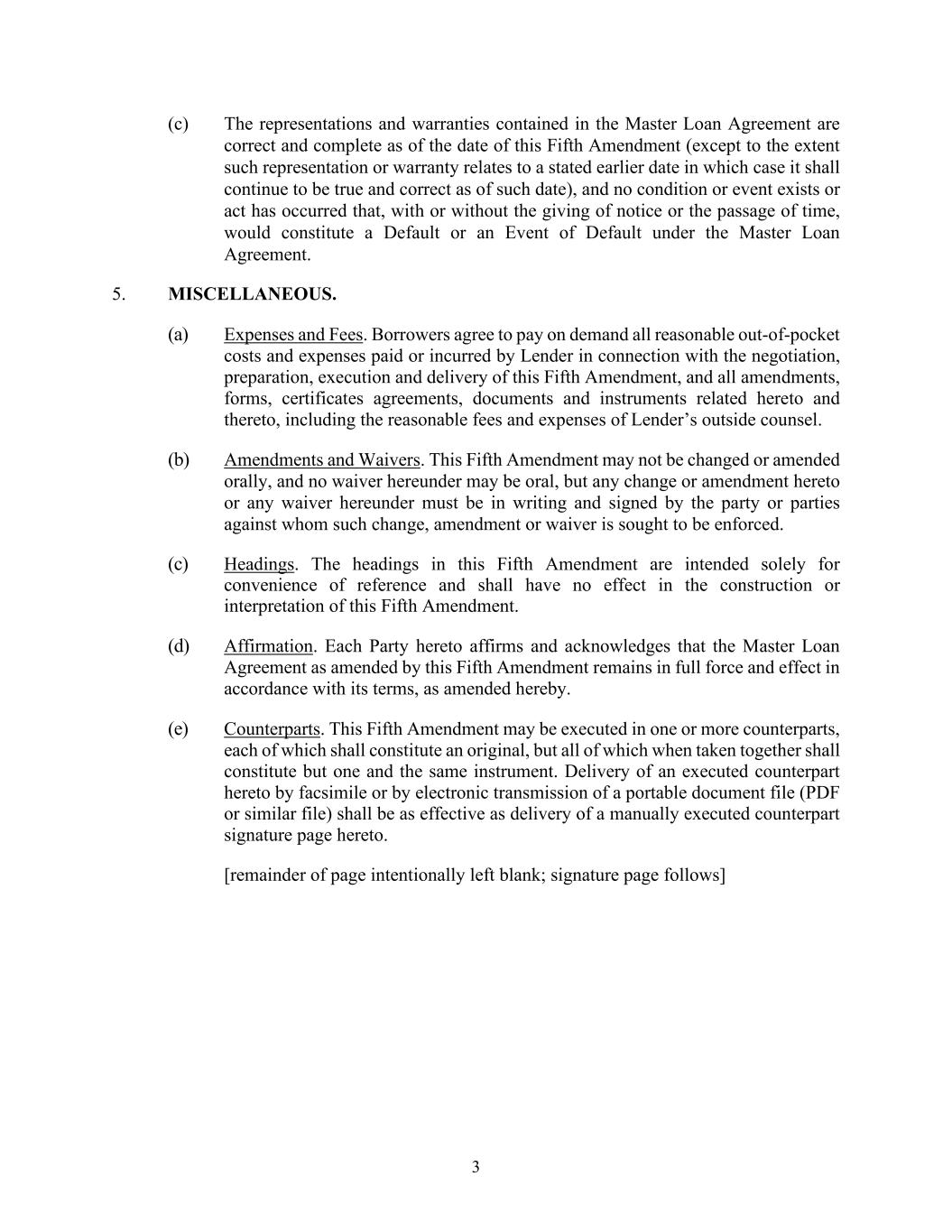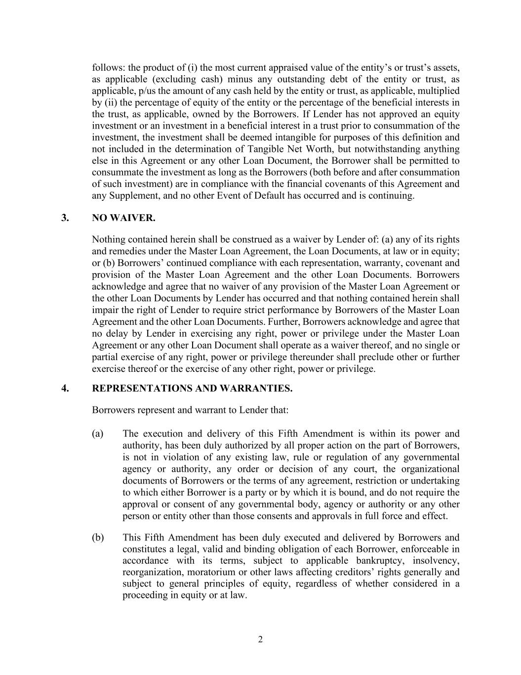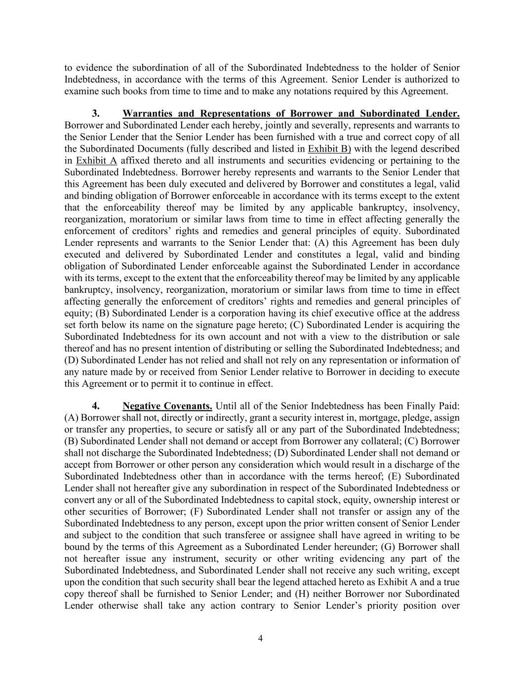 4 to evidence the subordination of all of the Subordinated Indebtedness to the holder of Senior Indebtedness, in accordance with the terms of this Agreement. Senior Lender is authorized to examine such books from time to time and to make any notations required by this Agreement. 3. Warranties and Representations of Borrower and Subordinated Lender. Borrower and Subordinated Lender each hereby, jointly and severally, represents and warrants to the Senior Lender that the Senior Lender has been furnished with a true and correct copy of all the Subordinated Documents (fully described and listed in Exhibit B) with the legend described in Exhibit A affixed thereto and all instruments and securities evidencing or pertaining to the Subordinated Indebtedness. Borrower hereby represents and warrants to the Senior Lender that this Agreement has been duly executed and delivered by Borrower and constitutes a legal, valid and binding obligation of Borrower enforceable in accordance with its terms except to the extent that the enforceability thereof may be limited by any applicable bankruptcy, insolvency, reorganization, moratorium or similar laws from time to time in effect affecting generally the enforcement of creditors’ rights and remedies and general principles of equity. Subordinated Lender represents and warrants to the Senior Lender that: (A) this Agreement has been duly executed and delivered by Subordinated Lender and constitutes a legal, valid and binding obligation of Subordinated Lender enforceable against the Subordinated Lender in accordance with its terms, except to the extent that the enforceability thereof may be limited by any applicable bankruptcy, insolvency, reorganization, moratorium or similar laws from time to time in effect affecting generally the enforcement of creditors’ rights and remedies and general principles of equity; (B) Subordinated Lender is a corporation having its chief executive office at the address set forth below its name on the signature page hereto; (C) Subordinated Lender is acquiring the Subordinated Indebtedness for its own account and not with a view to the distribution or sale thereof and has no present intention of distributing or selling the Subordinated Indebtedness; and (D) Subordinated Lender has not relied and shall not rely on any representation or information of any nature made by or received from Senior Lender relative to Borrower in deciding to execute this Agreement or to permit it to continue in effect. 4. Negative Covenants. Until all of the Senior Indebtedness has been Finally Paid: (A) Borrower shall not, directly or indirectly, grant a security interest in, mortgage, pledge, assign or transfer any properties, to secure or satisfy all or any part of the Subordinated Indebtedness; (B) Subordinated Lender shall not demand or accept from Borrower any collateral; (C) Borrower shall not discharge the Subordinated Indebtedness; (D) Subordinated Lender shall not demand or accept from Borrower or other person any consideration which would result in a discharge of the Subordinated Indebtedness other than in accordance with the terms hereof; (E) Subordinated Lender shall not hereafter give any subordination in respect of the Subordinated Indebtedness or convert any or all of the Subordinated Indebtedness to capital stock, equity, ownership interest or other securities of Borrower; (F) Subordinated Lender shall not transfer or assign any of the Subordinated Indebtedness to any person, except upon the prior written consent of Senior Lender and subject to the condition that such transferee or assignee shall have agreed in writing to be bound by the terms of this Agreement as a Subordinated Lender hereunder; (G) Borrower shall not hereafter issue any instrument, security or other writing evidencing any part of the Subordinated Indebtedness, and Subordinated Lender shall not receive any such writing, except upon the condition that such security shall bear the legend attached hereto as Exhibit A and a true copy thereof shall be furnished to Senior Lender; and (H) neither Borrower nor Subordinated Lender otherwise shall take any action contrary to Senior Lender’s priority position over