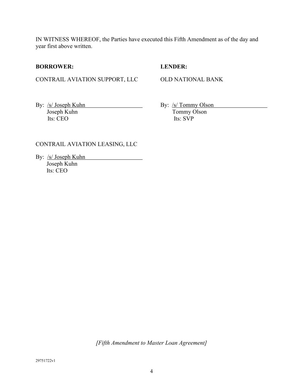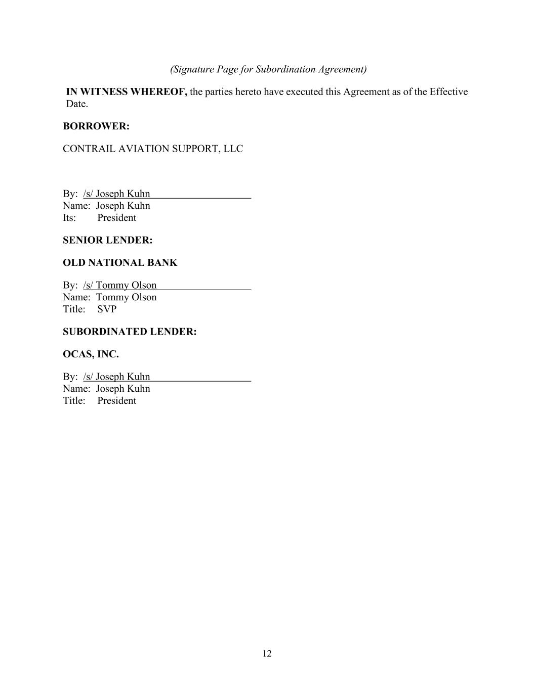 12 (Signature Page for Subordination Agreement) IN WITNESS WHEREOF, the parties hereto have executed this Agreement as of the Effective Date. BORROWER: CONTRAIL AVIATION SUPPORT, LLC By: /s/ Joseph Kuhn Name: Joseph Kuhn Its: President SENIOR LENDER: OLD NATIONAL BANK By: /s/ Tommy Olson Name: Tommy Olson Title: SVP SUBORDINATED LENDER: OCAS, INC. By: /s/ Joseph Kuhn Name: Joseph Kuhn Title: President