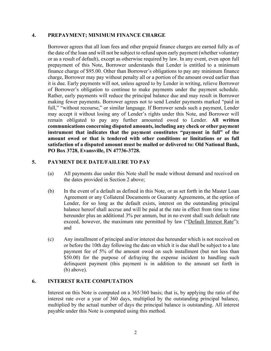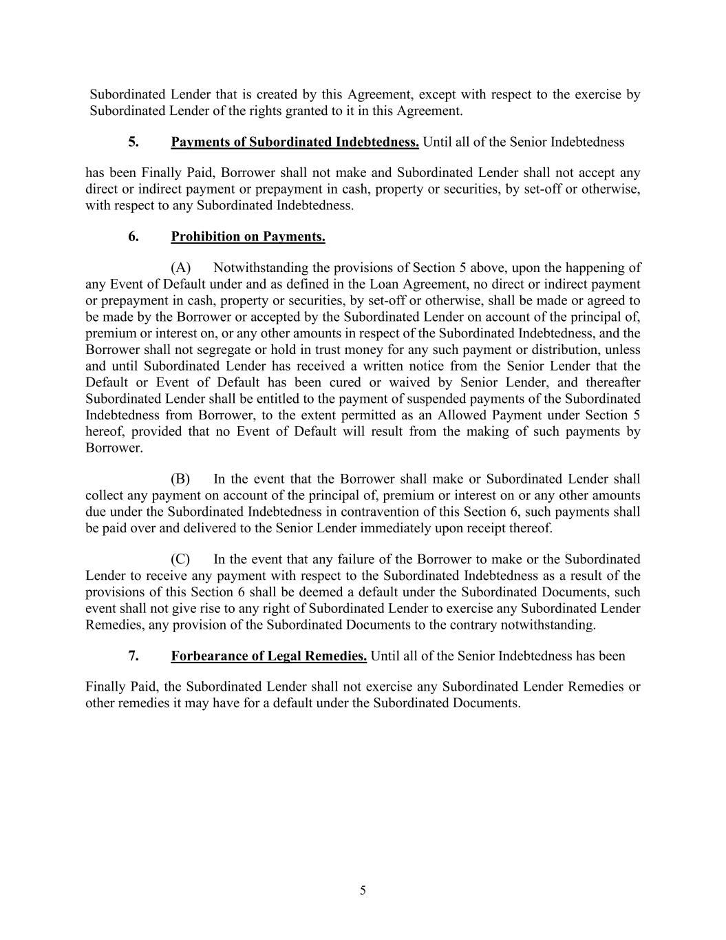 5 Subordinated Lender that is created by this Agreement, except with respect to the exercise by Subordinated Lender of the rights granted to it in this Agreement. 5. Payments of Subordinated Indebtedness. Until all of the Senior Indebtedness has been Finally Paid, Borrower shall not make and Subordinated Lender shall not accept any direct or indirect payment or prepayment in cash, property or securities, by set-off or otherwise, with respect to any Subordinated Indebtedness. 6. Prohibition on Payments. (A) Notwithstanding the provisions of Section 5 above, upon the happening of any Event of Default under and as defined in the Loan Agreement, no direct or indirect payment or prepayment in cash, property or securities, by set-off or otherwise, shall be made or agreed to be made by the Borrower or accepted by the Subordinated Lender on account of the principal of, premium or interest on, or any other amounts in respect of the Subordinated Indebtedness, and the Borrower shall not segregate or hold in trust money for any such payment or distribution, unless and until Subordinated Lender has received a written notice from the Senior Lender that the Default or Event of Default has been cured or waived by Senior Lender, and thereafter Subordinated Lender shall be entitled to the payment of suspended payments of the Subordinated Indebtedness from Borrower, to the extent permitted as an Allowed Payment under Section 5 hereof, provided that no Event of Default will result from the making of such payments by Borrower. (B) In the event that the Borrower shall make or Subordinated Lender shall collect any payment on account of the principal of, premium or interest on or any other amounts due under the Subordinated Indebtedness in contravention of this Section 6, such payments shall be paid over and delivered to the Senior Lender immediately upon receipt thereof. (C) In the event that any failure of the Borrower to make or the Subordinated Lender to receive any payment with respect to the Subordinated Indebtedness as a result of the provisions of this Section 6 shall be deemed a default under the Subordinated Documents, such event shall not give rise to any right of Subordinated Lender to exercise any Subordinated Lender Remedies, any provision of the Subordinated Documents to the contrary notwithstanding. 7. Forbearance of Legal Remedies. Until all of the Senior Indebtedness has been Finally Paid, the Subordinated Lender shall not exercise any Subordinated Lender Remedies or other remedies it may have for a default under the Subordinated Documents.