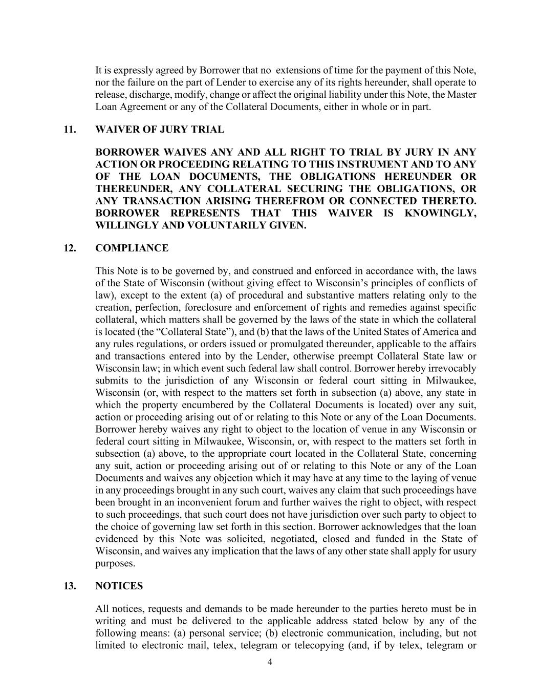 11 WISCONSIN, IN AND FOR DANE COUNTY, OR, IF SENIOR LENDER INITIATES SUCH ACTION, IN ADDITION TO THE FOREGOING COURTS, ANY COURT IN WHICH SENIOR LENDER SHALL INITIATE SUCH ACTION, TO THE EXTENT SUCH COURT HAS JURISDICTION. BORROWER AND SUBORDINATED LENDER HEREBY EXPRESSLY SUBMIT AND CONSENT IN ADVANCE TO SUCH JURISDICTION IN ANY ACTION OR PROCEEDING COMMENCED BY SENIOR LENDER AND HEREBY WAIVES ANY CLAIM THAT SUCH COURTS ARE AN INCONVENIENT FORUM OR AN IMPROPER FORUM BASED UPON LACK OF VENUE. THE EXCLUSIVE CHOICE OF FORUM AS SET FORTH IN THIS SECTION SHALL NOT BE DEEMED TO PRECLUDE THE ENFORCEMENT, BY SENIOR LENDER, OF ANY JUDGMENT OBTAINED IN ANY OTHER FORUM OR THE TAKING, BY SENIOR LENDER, OF ANY ACTION TO ENFORCE THE SAME IN ANY OTHER APPROPRIATE JURISDICTION, AND BORROWER AND SUBORDINATED LENDER HEREBY WAIVE THE RIGHT TO COLLATERALLY ATTACK SUCH JUDGMENT OR ACTION. 27. Waiver of Right to Jury Trial. SENIOR LENDER, SUBORDINATED LENDER AND BORROWER EACH WAIVE TRIAL BY JURY IN ANY DISPUTE ARISING FROM, UNDER OR IN CONNECTION WITH THIS AGREEMENT AND AGREE THAT ANY AND ALL DISPUTES SHALL BE RESOLVED THROUGH A TRIAL TO THE COURT. 28. Severability. The provisions of this Agreement are independent of and separable from each other. If any provision hereof shall for any reason be held invalid or unenforceable, it is the intent of the parties that such invalidity or unenforceability shall not affect the validity or enforceability of any other provision hereof, and that this Agreement shall be construed as if such invalid or unenforceable provision had never been contained herein. 29. Construction. The parties acknowledge that each party and its counsel have reviewed this Agreement and have participated jointly in the negotiations and drafting of this Agreement and hereby agree that the normal rule of construction to the effect that any ambiguities are to be resolved against the drafting party shall not be employed in the interpretation of this Agreement or any amendments or exhibits hereto. 30. Counterparts; Electronic Signatures. This Agreement may be executed in any number of separate counterparts, all of which, when taken together, shall constitute one and the same instrument, notwithstanding the fact that all parties did not sign the same counterpart. Each of the parties agrees that a signature transmitted to the other parties or their respective counsel by email transmission shall be effective to bind the party whose signature was transmitted, as a duly executed and delivered original. Each party further agrees to promptly deliver its original signature pages to this Agreement to counsel for the other parties promptly following execution, but any failure to do so shall not affect the binding effect of such signature. (Signature Page for Subordination Agreement follows)