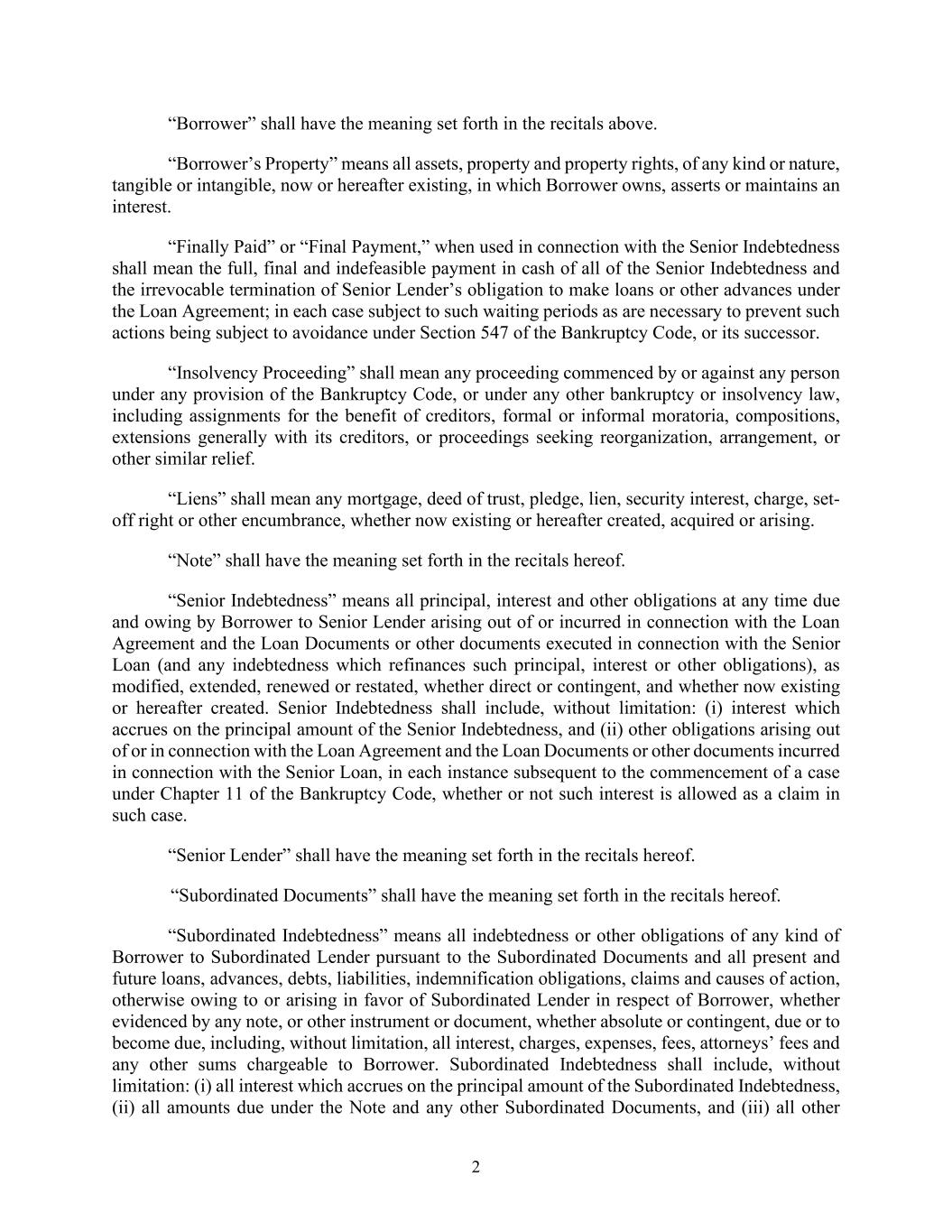2 “Borrower” shall have the meaning set forth in the recitals above. “Borrower’s Property” means all assets, property and property rights, of any kind or nature, tangible or intangible, now or hereafter existing, in which Borrower owns, asserts or maintains an interest. “Finally Paid” or “Final Payment,” when used in connection with the Senior Indebtedness shall mean the full, final and indefeasible payment in cash of all of the Senior Indebtedness and the irrevocable termination of Senior Lender’s obligation to make loans or other advances under the Loan Agreement; in each case subject to such waiting periods as are necessary to prevent such actions being subject to avoidance under Section 547 of the Bankruptcy Code, or its successor. “Insolvency Proceeding” shall mean any proceeding commenced by or against any person under any provision of the Bankruptcy Code, or under any other bankruptcy or insolvency law, including assignments for the benefit of creditors, formal or informal moratoria, compositions, extensions generally with its creditors, or proceedings seeking reorganization, arrangement, or other similar relief. “Liens” shall mean any mortgage, deed of trust, pledge, lien, security interest, charge, set- off right or other encumbrance, whether now existing or hereafter created, acquired or arising. “Note” shall have the meaning set forth in the recitals hereof. “Senior Indebtedness” means all principal, interest and other obligations at any time due and owing by Borrower to Senior Lender arising out of or incurred in connection with the Loan Agreement and the Loan Documents or other documents executed in connection with the Senior Loan (and any indebtedness which refinances such principal, interest or other obligations), as modified, extended, renewed or restated, whether direct or contingent, and whether now existing or hereafter created. Senior Indebtedness shall include, without limitation: (i) interest which accrues on the principal amount of the Senior Indebtedness, and (ii) other obligations arising out of or in connection with the Loan Agreement and the Loan Documents or other documents incurred in connection with the Senior Loan, in each instance subsequent to the commencement of a case under Chapter 11 of the Bankruptcy Code, whether or not such interest is allowed as a claim in such case. “Senior Lender” shall have the meaning set forth in the recitals hereof. “Subordinated Documents” shall have the meaning set forth in the recitals hereof. “Subordinated Indebtedness” means all indebtedness or other obligations of any kind of Borrower to Subordinated Lender pursuant to the Subordinated Documents and all present and future loans, advances, debts, liabilities, indemnification obligations, claims and causes of action, otherwise owing to or arising in favor of Subordinated Lender in respect of Borrower, whether evidenced by any note, or other instrument or document, whether absolute or contingent, due or to become due, including, without limitation, all interest, charges, expenses, fees, attorneys’ fees and any other sums chargeable to Borrower. Subordinated Indebtedness shall include, without limitation: (i) all interest which accrues on the principal amount of the Subordinated Indebtedness, (ii) all amounts due under the Note and any other Subordinated Documents, and (iii) all other