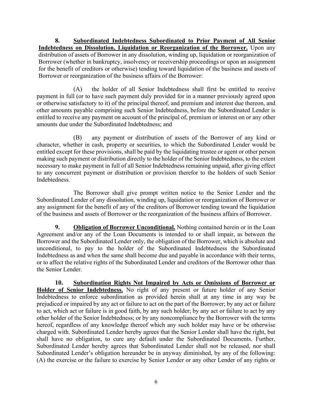 6 8. Subordinated Indebtedness Subordinated to Prior Payment of All Senior Indebtedness on Dissolution, Liquidation or Reorganization of the Borrower. Upon any distribution of assets of Borrower in any dissolution, winding up, liquidation or reorganization of Borrower (whether in bankruptcy, insolvency or receivership proceedings or upon an assignment for the benefit of creditors or otherwise) tending toward liquidation of the business and assets of Borrower or reorganization of the business affairs of the Borrower: (A) the holder of all Senior Indebtedness shall first be entitled to receive payment in full (or to have such payment duly provided for in a manner previously agreed upon or otherwise satisfactory to it) of the principal thereof, and premium and interest due thereon, and other amounts payable comprising such Senior Indebtedness, before the Subordinated Lender is entitled to receive any payment on account of the principal of, premium or interest on or any other amounts due under the Subordinated Indebtedness; and (B) any payment or distribution of assets of the Borrower of any kind or character, whether in cash, property or securities, to which the Subordinated Lender would be entitled except for these provisions, shall be paid by the liquidating trustee or agent or other person making such payment or distribution directly to the holder of the Senior Indebtedness, to the extent necessary to make payment in full of all Senior Indebtedness remaining unpaid, after giving effect to any concurrent payment or distribution or provision therefor to the holders of such Senior Indebtedness. The Borrower shall give prompt written notice to the Senior Lender and the Subordinated Lender of any dissolution, winding up, liquidation or reorganization of Borrower or any assignment for the benefit of any of the creditors of Borrower tending toward the liquidation of the business and assets of Borrower or the reorganization of the business affairs of Borrower. 9. Obligation of Borrower Unconditional. Nothing contained herein or in the Loan Agreement and/or any of the Loan Documents is intended to or shall impair, as between the Borrower and the Subordinated Lender only, the obligation of the Borrower, which is absolute and unconditional, to pay to the holder of the Subordinated Indebtedness the Subordinated Indebtedness as and when the same shall become due and payable in accordance with their terms, or to affect the relative rights of the Subordinated Lender and creditors of the Borrower other than the Senior Lender. 10. Subordination Rights Not Impaired by Acts or Omissions of Borrower or Holder of Senior Indebtedness. No right of any present or future holder of any Senior Indebtedness to enforce subordination as provided herein shall at any time in any way be prejudiced or impaired by any act or failure to act on the part of the Borrower; by any act or failure to act, which act or failure is in good faith, by any such holder; by any act or failure to act by any other holder of the Senior Indebtedness; or by any noncompliance by the Borrower with the terms hereof, regardless of any knowledge thereof which any such holder may have or be otherwise charged with. Subordinated Lender hereby agrees that the Senior Lender shall have the right, but shall have no obligation, to cure any default under the Subordinated Documents. Further, Subordinated Lender hereby agrees that Subordinated Lender shall not be released, nor shall Subordinated Lender’s obligation hereunder be in anyway diminished, by any of the following: (A) the exercise or the failure to exercise by Senior Lender or any other Lender of any rights or