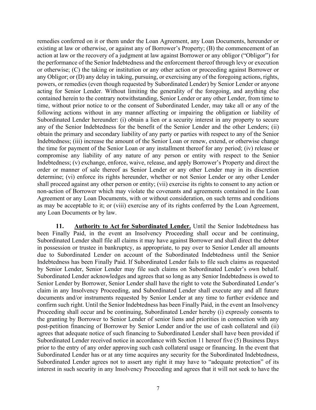 7 remedies conferred on it or them under the Loan Agreement, any Loan Documents, hereunder or existing at law or otherwise, or against any of Borrower’s Property; (B) the commencement of an action at law or the recovery of a judgment at law against Borrower or any obligor (“Obligor”) for the performance of the Senior Indebtedness and the enforcement thereof through levy or execution or otherwise; (C) the taking or institution or any other action or proceeding against Borrower or any Obligor; or (D) any delay in taking, pursuing, or exercising any of the foregoing actions, rights, powers, or remedies (even though requested by Subordinated Lender) by Senior Lender or anyone acting for Senior Lender. Without limiting the generality of the foregoing, and anything else contained herein to the contrary notwithstanding, Senior Lender or any other Lender, from time to time, without prior notice to or the consent of Subordinated Lender, may take all or any of the following actions without in any manner affecting or impairing the obligation or liability of Subordinated Lender hereunder: (i) obtain a lien or a security interest in any property to secure any of the Senior Indebtedness for the benefit of the Senior Lender and the other Lenders; (ii) obtain the primary and secondary liability of any party or parties with respect to any of the Senior Indebtedness; (iii) increase the amount of the Senior Loan or renew, extend, or otherwise change the time for payment of the Senior Loan or any installment thereof for any period; (iv) release or compromise any liability of any nature of any person or entity with respect to the Senior Indebtedness; (v) exchange, enforce, waive, release, and apply Borrower’s Property and direct the order or manner of sale thereof as Senior Lender or any other Lender may in its discretion determine; (vi) enforce its rights hereunder, whether or not Senior Lender or any other Lender shall proceed against any other person or entity; (vii) exercise its rights to consent to any action or non-action of Borrower which may violate the covenants and agreements contained in the Loan Agreement or any Loan Documents, with or without consideration, on such terms and conditions as may be acceptable to it; or (viii) exercise any of its rights conferred by the Loan Agreement, any Loan Documents or by law. 11. Authority to Act for Subordinated Lender. Until the Senior Indebtedness has been Finally Paid, in the event an Insolvency Proceeding shall occur and be continuing, Subordinated Lender shall file all claims it may have against Borrower and shall direct the debtor in possession or trustee in bankruptcy, as appropriate, to pay over to Senior Lender all amounts due to Subordinated Lender on account of the Subordinated Indebtedness until the Senior Indebtedness has been Finally Paid. If Subordinated Lender fails to file such claims as requested by Senior Lender, Senior Lender may file such claims on Subordinated Lender’s own behalf. Subordinated Lender acknowledges and agrees that so long as any Senior Indebtedness is owed to Senior Lender by Borrower, Senior Lender shall have the right to vote the Subordinated Lender’s claim in any Insolvency Proceeding, and Subordinated Lender shall execute any and all future documents and/or instruments requested by Senior Lender at any time to further evidence and confirm such right. Until the Senior Indebtedness has been Finally Paid, in the event an Insolvency Proceeding shall occur and be continuing, Subordinated Lender hereby (i) expressly consents to the granting by Borrower to Senior Lender of senior liens and priorities in connection with any post-petition financing of Borrower by Senior Lender and/or the use of cash collateral and (ii) agrees that adequate notice of such financing to Subordinated Lender shall have been provided if Subordinated Lender received notice in accordance with Section 11 hereof five (5) Business Days prior to the entry of any order approving such cash collateral usage or financing. In the event that Subordinated Lender has or at any time acquires any security for the Subordinated Indebtedness, Subordinated Lender agrees not to assert any right it may have to “adequate protection” of its interest in such security in any Insolvency Proceeding and agrees that it will not seek to have the