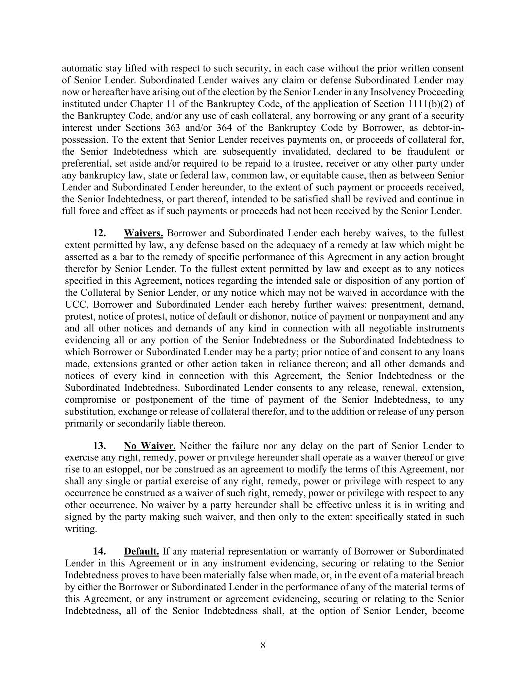8 automatic stay lifted with respect to such security, in each case without the prior written consent of Senior Lender. Subordinated Lender waives any claim or defense Subordinated Lender may now or hereafter have arising out of the election by the Senior Lender in any Insolvency Proceeding instituted under Chapter 11 of the Bankruptcy Code, of the application of Section 1111(b)(2) of the Bankruptcy Code, and/or any use of cash collateral, any borrowing or any grant of a security interest under Sections 363 and/or 364 of the Bankruptcy Code by Borrower, as debtor-in- possession. To the extent that Senior Lender receives payments on, or proceeds of collateral for, the Senior Indebtedness which are subsequently invalidated, declared to be fraudulent or preferential, set aside and/or required to be repaid to a trustee, receiver or any other party under any bankruptcy law, state or federal law, common law, or equitable cause, then as between Senior Lender and Subordinated Lender hereunder, to the extent of such payment or proceeds received, the Senior Indebtedness, or part thereof, intended to be satisfied shall be revived and continue in full force and effect as if such payments or proceeds had not been received by the Senior Lender. 12. Waivers. Borrower and Subordinated Lender each hereby waives, to the fullest extent permitted by law, any defense based on the adequacy of a remedy at law which might be asserted as a bar to the remedy of specific performance of this Agreement in any action brought therefor by Senior Lender. To the fullest extent permitted by law and except as to any notices specified in this Agreement, notices regarding the intended sale or disposition of any portion of the Collateral by Senior Lender, or any notice which may not be waived in accordance with the UCC, Borrower and Subordinated Lender each hereby further waives: presentment, demand, protest, notice of protest, notice of default or dishonor, notice of payment or nonpayment and any and all other notices and demands of any kind in connection with all negotiable instruments evidencing all or any portion of the Senior Indebtedness or the Subordinated Indebtedness to which Borrower or Subordinated Lender may be a party; prior notice of and consent to any loans made, extensions granted or other action taken in reliance thereon; and all other demands and notices of every kind in connection with this Agreement, the Senior Indebtedness or the Subordinated Indebtedness. Subordinated Lender consents to any release, renewal, extension, compromise or postponement of the time of payment of the Senior Indebtedness, to any substitution, exchange or release of collateral therefor, and to the addition or release of any person primarily or secondarily liable thereon. 13. No Waiver. Neither the failure nor any delay on the part of Senior Lender to exercise any right, remedy, power or privilege hereunder shall operate as a waiver thereof or give rise to an estoppel, nor be construed as an agreement to modify the terms of this Agreement, nor shall any single or partial exercise of any right, remedy, power or privilege with respect to any occurrence be construed as a waiver of such right, remedy, power or privilege with respect to any other occurrence. No waiver by a party hereunder shall be effective unless it is in writing and signed by the party making such waiver, and then only to the extent specifically stated in such writing. 14. Default. If any material representation or warranty of Borrower or Subordinated Lender in this Agreement or in any instrument evidencing, securing or relating to the Senior Indebtedness proves to have been materially false when made, or, in the event of a material breach by either the Borrower or Subordinated Lender in the performance of any of the material terms of this Agreement, or any instrument or agreement evidencing, securing or relating to the Senior Indebtedness, all of the Senior Indebtedness shall, at the option of Senior Lender, become