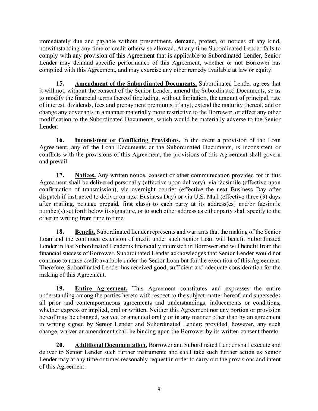 9 immediately due and payable without presentment, demand, protest, or notices of any kind, notwithstanding any time or credit otherwise allowed. At any time Subordinated Lender fails to comply with any provision of this Agreement that is applicable to Subordinated Lender, Senior Lender may demand specific performance of this Agreement, whether or not Borrower has complied with this Agreement, and may exercise any other remedy available at law or equity. 15. Amendment of the Subordinated Documents. Subordinated Lender agrees that it will not, without the consent of the Senior Lender, amend the Subordinated Documents, so as to modify the financial terms thereof (including, without limitation, the amount of principal, rate of interest, dividends, fees and prepayment premiums, if any), extend the maturity thereof, add or change any covenants in a manner materially more restrictive to the Borrower, or effect any other modification to the Subordinated Documents, which would be materially adverse to the Senior Lender. 16. Inconsistent or Conflicting Provisions. In the event a provision of the Loan Agreement, any of the Loan Documents or the Subordinated Documents, is inconsistent or conflicts with the provisions of this Agreement, the provisions of this Agreement shall govern and prevail. 17. Notices. Any written notice, consent or other communication provided for in this Agreement shall be delivered personally (effective upon delivery), via facsimile (effective upon confirmation of transmission), via overnight courier (effective the next Business Day after dispatch if instructed to deliver on next Business Day) or via U.S. Mail (effective three (3) days after mailing, postage prepaid, first class) to each party at its address(es) and/or facsimile number(s) set forth below its signature, or to such other address as either party shall specify to the other in writing from time to time. 18. Benefit. Subordinated Lender represents and warrants that the making of the Senior Loan and the continued extension of credit under such Senior Loan will benefit Subordinated Lender in that Subordinated Lender is financially interested in Borrower and will benefit from the financial success of Borrower. Subordinated Lender acknowledges that Senior Lender would not continue to make credit available under the Senior Loan but for the execution of this Agreement. Therefore, Subordinated Lender has received good, sufficient and adequate consideration for the making of this Agreement. 19. Entire Agreement. This Agreement constitutes and expresses the entire understanding among the parties hereto with respect to the subject matter hereof, and supersedes all prior and contemporaneous agreements and understandings, inducements or conditions, whether express or implied, oral or written. Neither this Agreement nor any portion or provision hereof may be changed, waived or amended orally or in any manner other than by an agreement in writing signed by Senior Lender and Subordinated Lender; provided, however, any such change, waiver or amendment shall be binding upon the Borrower by its written consent thereto. 20. Additional Documentation. Borrower and Subordinated Lender shall execute and deliver to Senior Lender such further instruments and shall take such further action as Senior Lender may at any time or times reasonably request in order to carry out the provisions and intent of this Agreement.