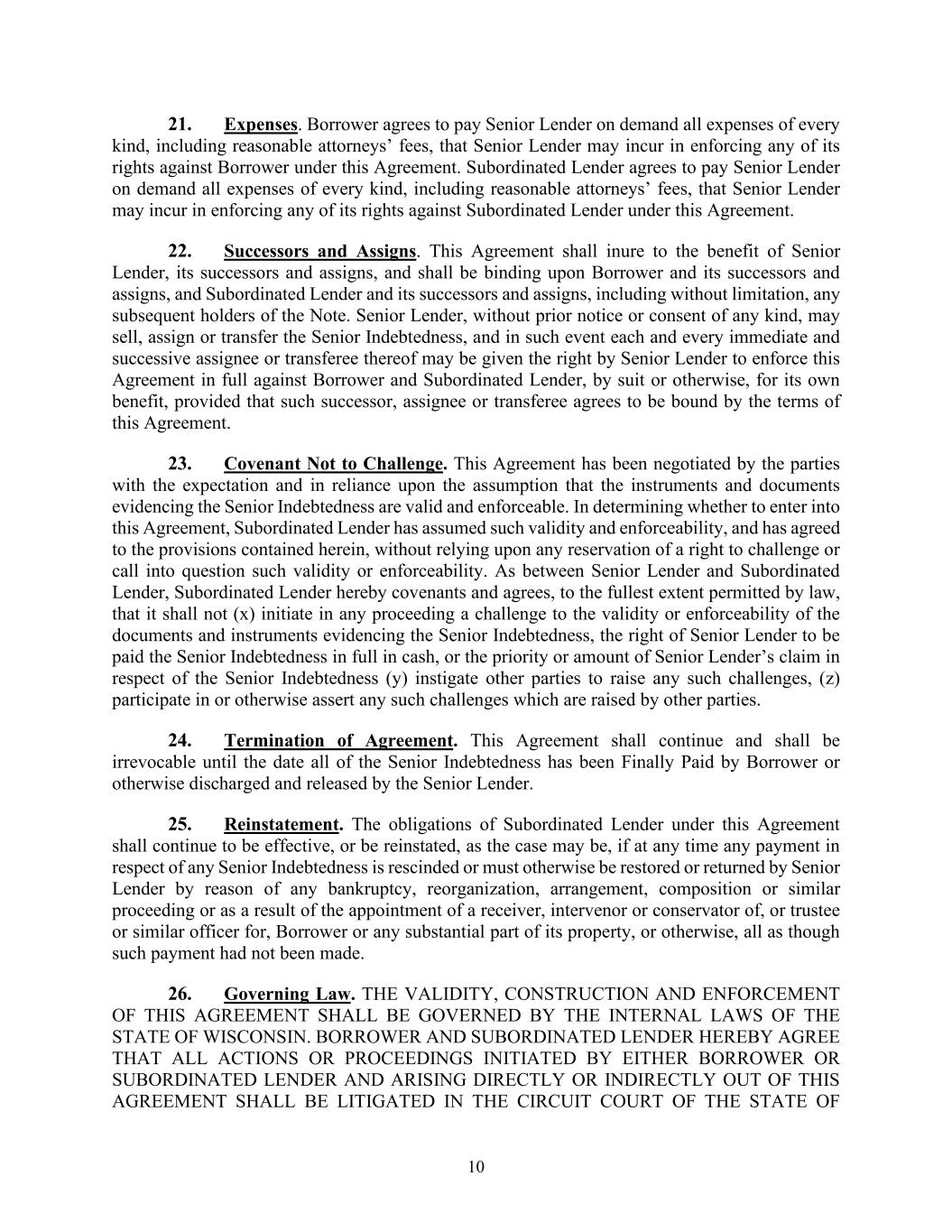 10 21. Expenses. Borrower agrees to pay Senior Lender on demand all expenses of every kind, including reasonable attorneys’ fees, that Senior Lender may incur in enforcing any of its rights against Borrower under this Agreement. Subordinated Lender agrees to pay Senior Lender on demand all expenses of every kind, including reasonable attorneys’ fees, that Senior Lender may incur in enforcing any of its rights against Subordinated Lender under this Agreement. 22. Successors and Assigns. This Agreement shall inure to the benefit of Senior Lender, its successors and assigns, and shall be binding upon Borrower and its successors and assigns, and Subordinated Lender and its successors and assigns, including without limitation, any subsequent holders of the Note. Senior Lender, without prior notice or consent of any kind, may sell, assign or transfer the Senior Indebtedness, and in such event each and every immediate and successive assignee or transferee thereof may be given the right by Senior Lender to enforce this Agreement in full against Borrower and Subordinated Lender, by suit or otherwise, for its own benefit, provided that such successor, assignee or transferee agrees to be bound by the terms of this Agreement. 23. Covenant Not to Challenge. This Agreement has been negotiated by the parties with the expectation and in reliance upon the assumption that the instruments and documents evidencing the Senior Indebtedness are valid and enforceable. In determining whether to enter into this Agreement, Subordinated Lender has assumed such validity and enforceability, and has agreed to the provisions contained herein, without relying upon any reservation of a right to challenge or call into question such validity or enforceability. As between Senior Lender and Subordinated Lender, Subordinated Lender hereby covenants and agrees, to the fullest extent permitted by law, that it shall not (x) initiate in any proceeding a challenge to the validity or enforceability of the documents and instruments evidencing the Senior Indebtedness, the right of Senior Lender to be paid the Senior Indebtedness in full in cash, or the priority or amount of Senior Lender’s claim in respect of the Senior Indebtedness (y) instigate other parties to raise any such challenges, (z) participate in or otherwise assert any such challenges which are raised by other parties. 24. Termination of Agreement. This Agreement shall continue and shall be irrevocable until the date all of the Senior Indebtedness has been Finally Paid by Borrower or otherwise discharged and released by the Senior Lender. 25. Reinstatement. The obligations of Subordinated Lender under this Agreement shall continue to be effective, or be reinstated, as the case may be, if at any time any payment in respect of any Senior Indebtedness is rescinded or must otherwise be restored or returned by Senior Lender by reason of any bankruptcy, reorganization, arrangement, composition or similar proceeding or as a result of the appointment of a receiver, intervenor or conservator of, or trustee or similar officer for, Borrower or any substantial part of its property, or otherwise, all as though such payment had not been made. 26. Governing Law. THE VALIDITY, CONSTRUCTION AND ENFORCEMENT OF THIS AGREEMENT SHALL BE GOVERNED BY THE INTERNAL LAWS OF THE STATE OF WISCONSIN. BORROWER AND SUBORDINATED LENDER HEREBY AGREE THAT ALL ACTIONS OR PROCEEDINGS INITIATED BY EITHER BORROWER OR SUBORDINATED LENDER AND ARISING DIRECTLY OR INDIRECTLY OUT OF THIS AGREEMENT SHALL BE LITIGATED IN THE CIRCUIT COURT OF THE STATE OF