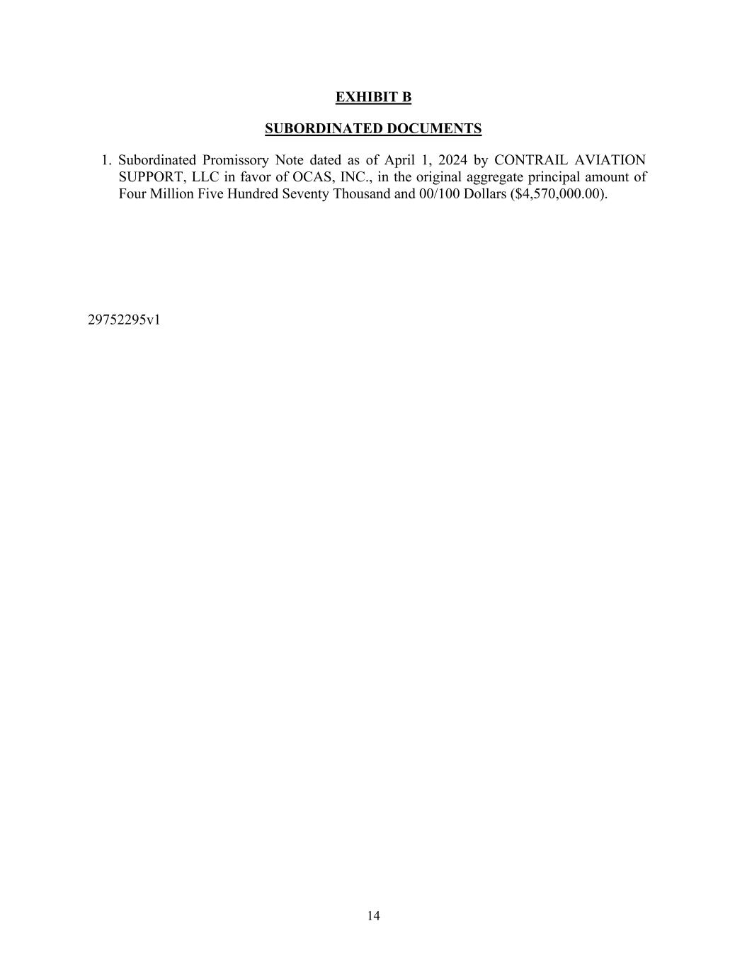 14 EXHIBIT B SUBORDINATED DOCUMENTS 1. Subordinated Promissory Note dated as of April 1, 2024 by CONTRAIL AVIATION SUPPORT, LLC in favor of OCAS, INC., in the original aggregate principal amount of Four Million Five Hundred Seventy Thousand and 00/100 Dollars ($4,570,000.00). 29752295v1