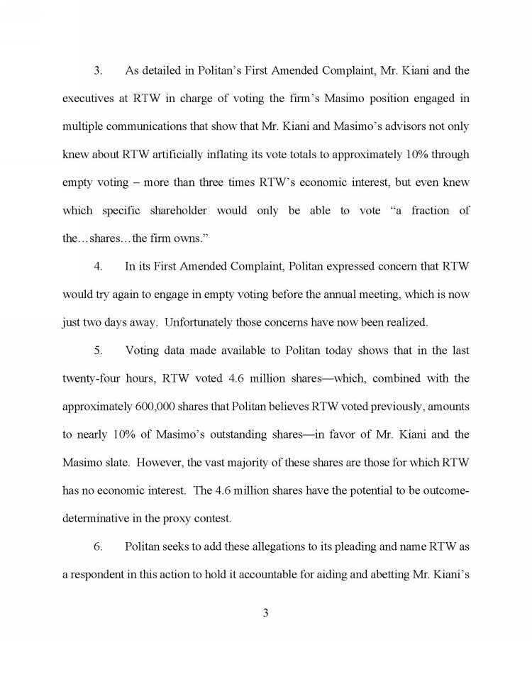 POLITAN STRONGLY ADVISES ALL STOCKHOLDERS OF MASIMO TO READ ITS DEFINITIVE PROXY STATEMENT, ANY AMENDMENTS OR SUPPLEMENTS TO SUCH PROXY STATEMENT AND OTHER PROXY MATERIALS FILED BY POLITAN WITH THE SEC AS THEY BECOME AVAILABLE BECAUSE THEY WILL CONTAIN IMPORTANT INFORMATION. SUCH PROXY MATERIALS WILL BE AVAILABLE AT NO CHARGE ON THE SEC’S WEBSITE AT WWW.SEC.GOV. THE DEFINITIVE PROXY STATEMENT AND OTHER RELEVANT DOCUMENTS ARE ALSO AVAILABLE ON THE SEC WEBSITE, FREE OF CHARGE, OR BY DIRECTING A REQUEST TO THE PARTICIPANTS’ PROXY SOLICITOR, D.F. KING & CO., INC., 48 WALL STREET, 22ND FLOOR, NEW YORK, NEW YORK 10005 STOCKHOLDERS CAN CALL TOLL-FREE: (888) 628-8208.
