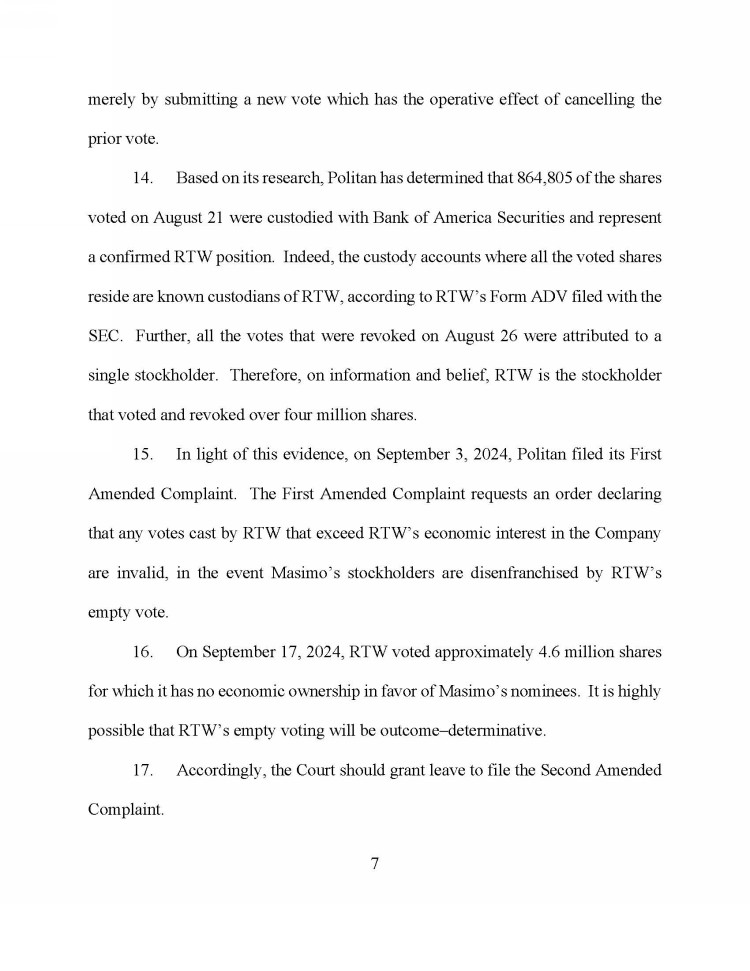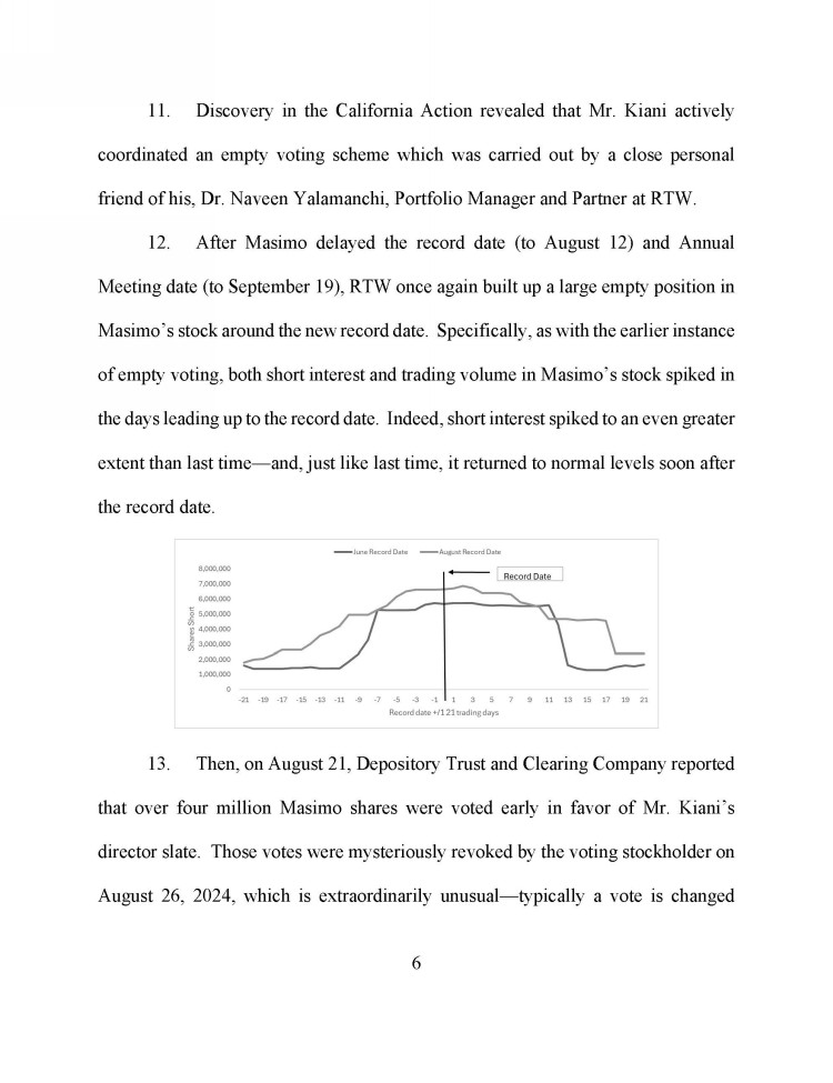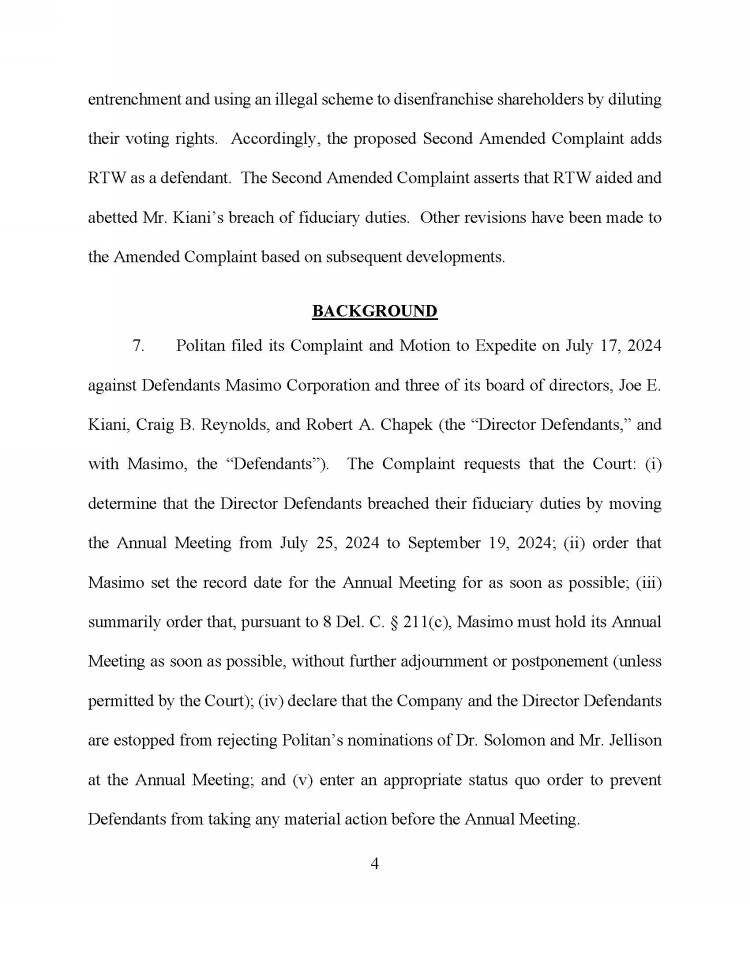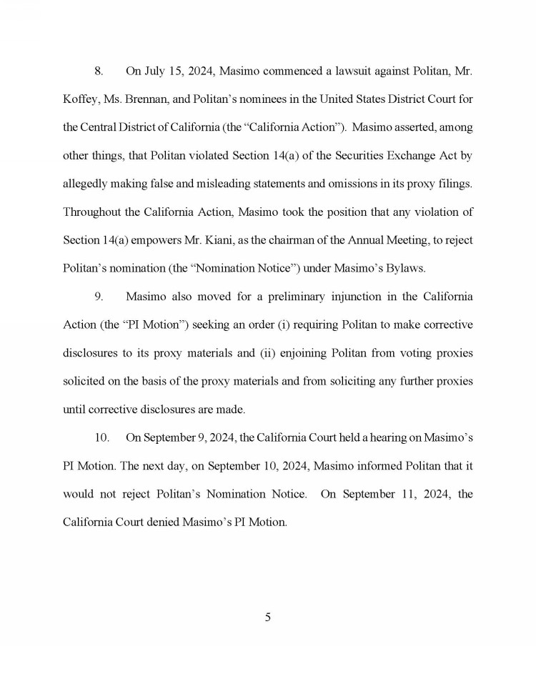 | · | “Among other things, we note the following: (i) Masimo failed to establish the spin-off was the idea of Mr. Koffey, rather than Mr. Kiani, undermining a key defensive narrative; (ii) Masimo failed to establish Politan misrepresented the selection of advisors by the special committee; (iii) Masimo failed to establish Mr. Koffey attempted to expand his committee powers beyond the bounds of the committee's authority to purposely craft a non-viable term sheet; (iv) the Court concluded members of the committee were ‘made aware’ of the terms underpinning the early February 2024 term sheet, and that evidence shows such members, ‘even without being provided the term sheet, comprehended the proposed terms of the spin-off’; (v) Masimo failed to convincingly support the claim that Politan sought to secretly secure information damaging to Masimo, which claim Masimo continues to make, including as recently as September 15, 2024; (vi) the prior presentation of certain materials by CFO Micah Young to the board ‘[did] not appear to be a budget’, reinforcing concern that board-level information flows are atypical and inadequate.; (vii) Mr. Kiani failed to provide the name of the prospective joint venture partner to Mr. Koffey and Ms. Brennan, despite having provided it to the remaining members of the board weeks prior; and (viii) ‘from the Court's perspective, a reasonable shareholder would be more concerned with [Mr.] Kiani signing a term sheet, albeit a non-binding one, with a potential joint-venture partner without consulting Masimo's complete Board’ (emphasis added).” |