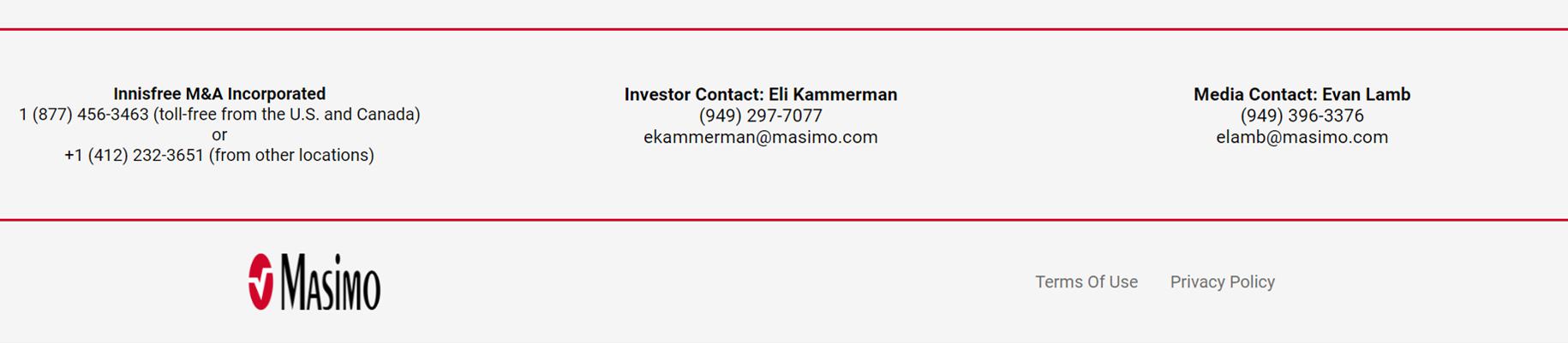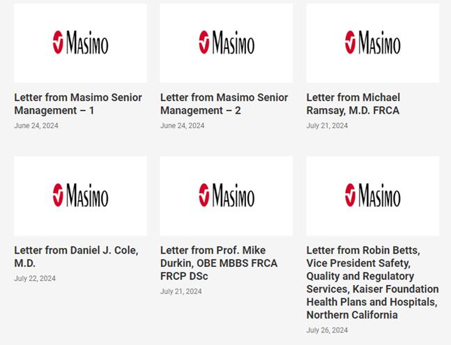 This communication includes forward-looking statements as defined in Section 27A of the Securities Act of 1933, as amended, and Section 21E of the Securities Exchange Act of 1934, as amended, in connection with the Private Securities Litigation Reform Act of 1995. These forward-looking statements include, among others, statements regarding the 2024 Annual Meeting of Stockholders (the “2024 Annual Meeting”) of Masimo and the potential stockholder approval of the Board’s nominees. These forward-looking statements are based on current expectations about future events affecting Masimo and are subject to risks and uncertainties, all of which are difficult to predict and many of which are beyond Masimo’s control and could cause its actual results to differ materially and adversely from those expressed in its forward-looking statements as a result of various risk factors, including, but not limited to (i) uncertainties regarding future actions that may be taken by Politan Capital Management LP (“Politan”) in furtherance of its nomination of director candidates for election at the 2024 Annual Meeting, (ii) the potential cost and management distraction attendant to Politan’s nomination of director nominees at the 2024 Annual Meeting and (iii) factors discussed in the “Risk Factors” section of Masimo’s most recent periodic reports filed with the Securities and Exchange Commission (“SEC”), which may be obtained for free at the SEC’s website at www.sec.gov. Although Masimo believes that the expectations reflected in its forward-looking statements are reasonable, the Company does not know whether its expectations will prove correct. All forward-looking statements included in this communication are expressly qualified in their entirety by the foregoing cautionary statements. You are cautioned not to place undue reliance on these forward-looking statements, which speak only as of today’s date. Masimo does not undertake any obligation to update, amend or clarify these statements or the “Risk Factors” contained in the Company’s most recent reports filed with the SEC, whether as a result of new information, future events or otherwise, except as may be required under the applicable securities laws.