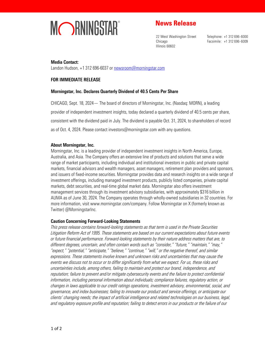 1 of 2 Media Contact: Landon Hudson, +1 312 696-6037 or newsroom@morningstar.com FOR IMMEDIATE RELEASE Morningstar, Inc. Declares Quarterly Dividend of 40.5 Cents Per Share CHICAGO, Sept. 18, 2024— The board of directors of Morningstar, Inc. (Nasdaq: MORN), a leading provider of independent investment insights, today declared a quarterly dividend of 40.5 cents per share, consistent with the dividend paid in July. The dividend is payable Oct. 31, 2024, to shareholders of record as of Oct. 4, 2024. Please contact investors@morningstar.com with any questions. About Morningstar, Inc. Morningstar, Inc. is a leading provider of independent investment insights in North America, Europe, Australia, and Asia. The Company offers an extensive line of products and solutions that serve a wide range of market participants, including individual and institutional investors in public and private capital markets, financial advisors and wealth managers, asset managers, retirement plan providers and sponsors, and issuers of fixed-income securities. Morningstar provides data and research insights on a wide range of investment offerings, including managed investment products, publicly listed companies, private capital markets, debt securities, and real-time global market data. Morningstar also offers investment management services through its investment advisory subsidiaries, with approximately $316 billion in AUMA as of June 30, 2024. The Company operates through wholly-owned subsidiaries in 32 countries. For more information, visit www.morningstar.com/company. Follow Morningstar on X (formerly known as Twitter) @MorningstarInc. Caution Concerning Forward-Looking Statements This press release contains forward-looking statements as that term is used in the Private Securities Litigation Reform Act of 1995. These statements are based on our current expectations about future events or future financial performance. Forward-looking statements by their nature address matters that are, to different degrees, uncertain, and often contain words such as “consider,” “future,” “maintain,” “may,” “expect,” “potential,” “anticipate,” “believe,” “continue,” “will,” or the negative thereof, and similar expressions. These statements involve known and unknown risks and uncertainties that may cause the events we discuss not to occur or to differ significantly from what we expect. For us, these risks and uncertainties include, among others, failing to maintain and protect our brand, independence, and reputation; failure to prevent and/or mitigate cybersecurity events and the failure to protect confidential information, including personal information about individuals; compliance failures, regulatory action, or changes in laws applicable to our credit ratings operations, investment advisory, environmental, social, and governance, and index businesses; failing to innovate our product and service offerings, or anticipate our clients’ changing needs; the impact of artificial intelligence and related technologies on our business, legal, and regulatory exposure profile and reputation; failing to detect errors in our products or the failure of our