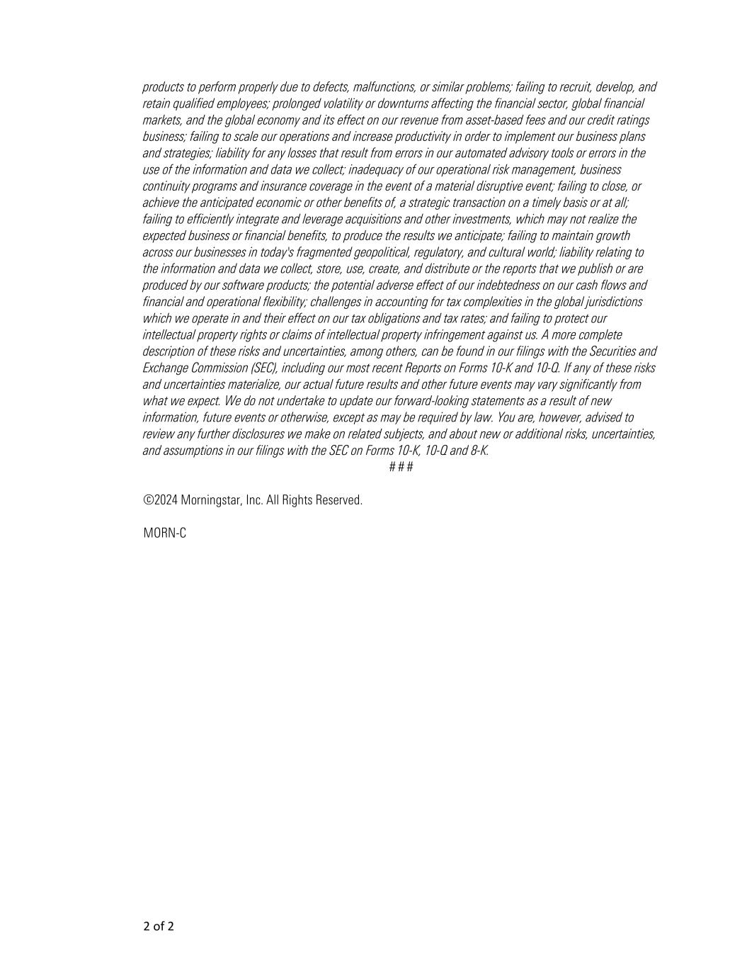 2 of 2 products to perform properly due to defects, malfunctions, or similar problems; failing to recruit, develop, and retain qualified employees; prolonged volatility or downturns affecting the financial sector, global financial markets, and the global economy and its effect on our revenue from asset-based fees and our credit ratings business; failing to scale our operations and increase productivity in order to implement our business plans and strategies; liability for any losses that result from errors in our automated advisory tools or errors in the use of the information and data we collect; inadequacy of our operational risk management, business continuity programs and insurance coverage in the event of a material disruptive event; failing to close, or achieve the anticipated economic or other benefits of, a strategic transaction on a timely basis or at all; failing to efficiently integrate and leverage acquisitions and other investments, which may not realize the expected business or financial benefits, to produce the results we anticipate; failing to maintain growth across our businesses in today's fragmented geopolitical, regulatory, and cultural world; liability relating to the information and data we collect, store, use, create, and distribute or the reports that we publish or are produced by our software products; the potential adverse effect of our indebtedness on our cash flows and financial and operational flexibility; challenges in accounting for tax complexities in the global jurisdictions which we operate in and their effect on our tax obligations and tax rates; and failing to protect our intellectual property rights or claims of intellectual property infringement against us. A more complete description of these risks and uncertainties, among others, can be found in our filings with the Securities and Exchange Commission (SEC), including our most recent Reports on Forms 10-K and 10-Q. If any of these risks and uncertainties materialize, our actual future results and other future events may vary significantly from what we expect. We do not undertake to update our forward-looking statements as a result of new information, future events or otherwise, except as may be required by law. You are, however, advised to review any further disclosures we make on related subjects, and about new or additional risks, uncertainties, and assumptions in our filings with the SEC on Forms 10-K, 10-Q and 8-K. # # # ©2024 Morningstar, Inc. All Rights Reserved. MORN-C