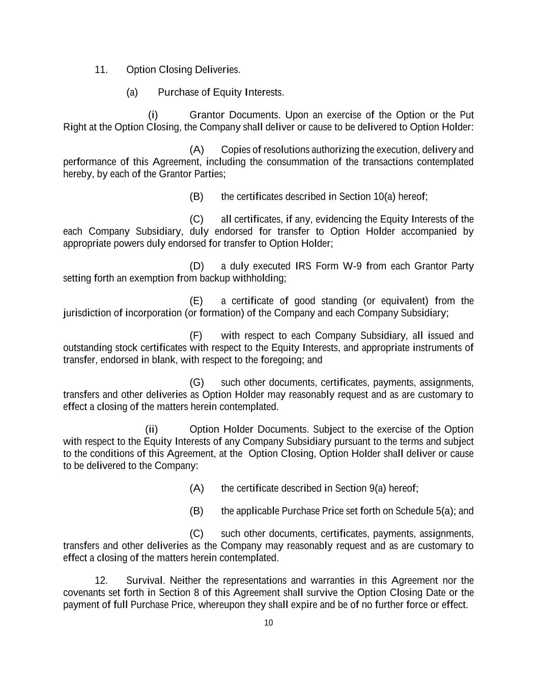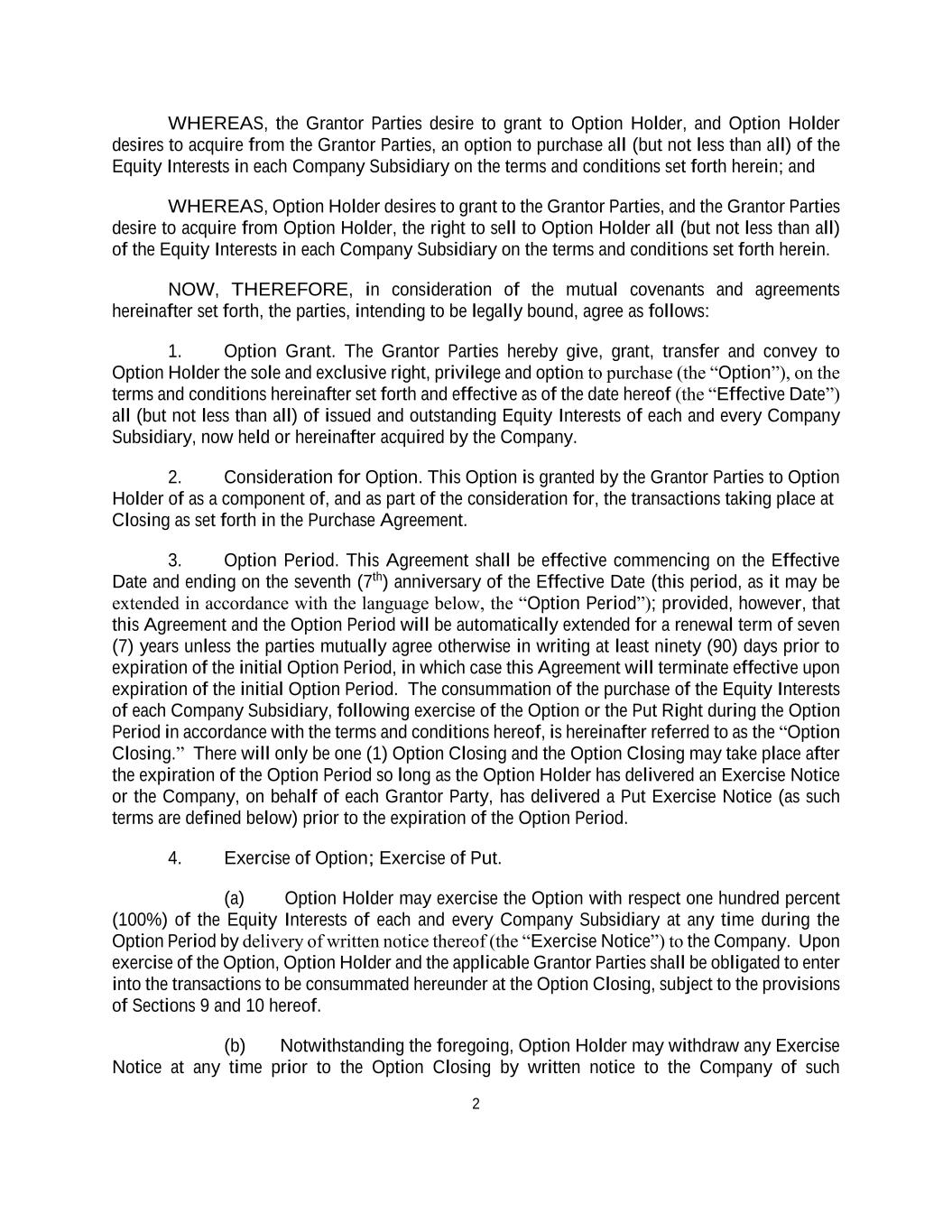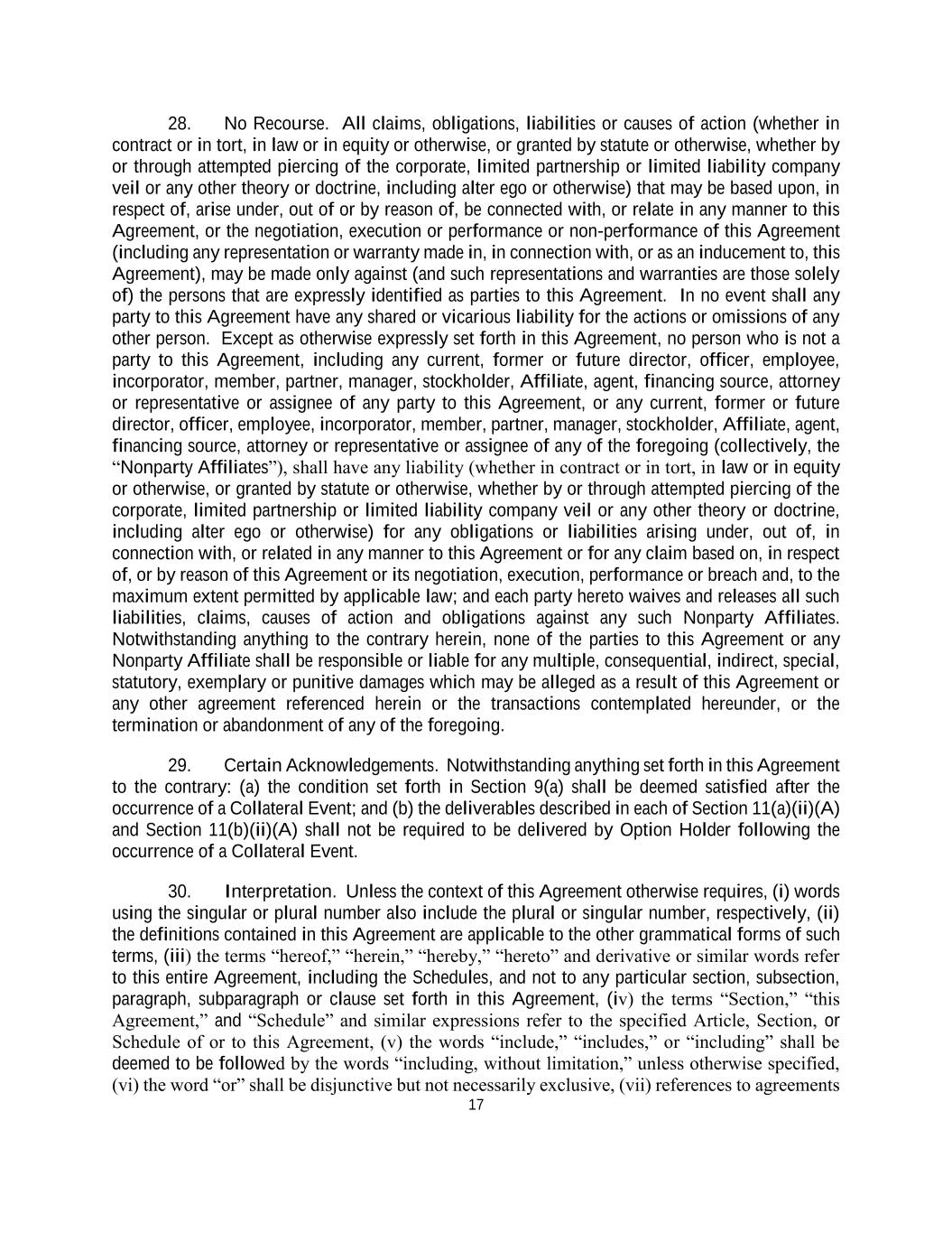 17 28. No Recourse. All claims, obligations, liabilities or causes of action (whether in contract or in tort, in law or in equity or otherwise, or granted by statute or otherwise, whether by or through attempted piercing of the corporate, limited partnership or limited liability company veil or any other theory or doctrine, including alter ego or otherwise) that may be based upon, in respect of, arise under, out of or by reason of, be connected with, or relate in any manner to this Agreement, or the negotiation, execution or performance or non-performance of this Agreement (including any representation or warranty made in, in connection with, or as an inducement to, this Agreement), may be made only against (and such representations and warranties are those solely of) the persons that are expressly identified as parties to this Agreement. In no event shall any party to this Agreement have any shared or vicarious liability for the actions or omissions of any other person. Except as otherwise expressly set forth in this Agreement, no person who is not a party to this Agreement, including any current, former or future director, officer, employee, incorporator, member, partner, manager, stockholder, Affiliate, agent, financing source, attorney or representative or assignee of any party to this Agreement, or any current, former or future director, officer, employee, incorporator, member, partner, manager, stockholder, Affiliate, agent, financing source, attorney or representative or assignee of any of the foregoing (collectively, the “Nonparty Affiliates”), shall have any liability (whether in contract or in tort, in law or in equity or otherwise, or granted by statute or otherwise, whether by or through attempted piercing of the corporate, limited partnership or limited liability company veil or any other theory or doctrine, including alter ego or otherwise) for any obligations or liabilities arising under, out of, in connection with, or related in any manner to this Agreement or for any claim based on, in respect of, or by reason of this Agreement or its negotiation, execution, performance or breach and, to the maximum extent permitted by applicable law; and each party hereto waives and releases all such liabilities, claims, causes of action and obligations against any such Nonparty Affiliates. Notwithstanding anything to the contrary herein, none of the parties to this Agreement or any Nonparty Affiliate shall be responsible or liable for any multiple, consequential, indirect, special, statutory, exemplary or punitive damages which may be alleged as a result of this Agreement or any other agreement referenced herein or the transactions contemplated hereunder, or the termination or abandonment of any of the foregoing. 29. Certain Acknowledgements. Notwithstanding anything set forth in this Agreement to the contrary: (a) the condition set forth in Section 9(a) shall be deemed satisfied after the occurrence of a Collateral Event; and (b) the deliverables described in each of Section 11(a)(ii)(A) and Section 11(b)(ii)(A) shall not be required to be delivered by Option Holder following the occurrence of a Collateral Event. 30. Interpretation. Unless the context of this Agreement otherwise requires, (i) words using the singular or plural number also include the plural or singular number, respectively, (ii) the definitions contained in this Agreement are applicable to the other grammatical forms of such terms, (iii) the terms “hereof,” “herein,” “hereby,” “hereto” and derivative or similar words refer to this entire Agreement, including the Schedules, and not to any particular section, subsection, paragraph, subparagraph or clause set forth in this Agreement, (iv) the terms “Section,” “this Agreement,” and “Schedule” and similar expressions refer to the specified Article, Section, or Schedule of or to this Agreement, (v) the words “include,” “includes,” or “including” shall be deemed to be followed by the words “including, without limitation,” unless otherwise specified, (vi) the word “or” shall be disjunctive but not necessarily exclusive, (vii) references to agreements