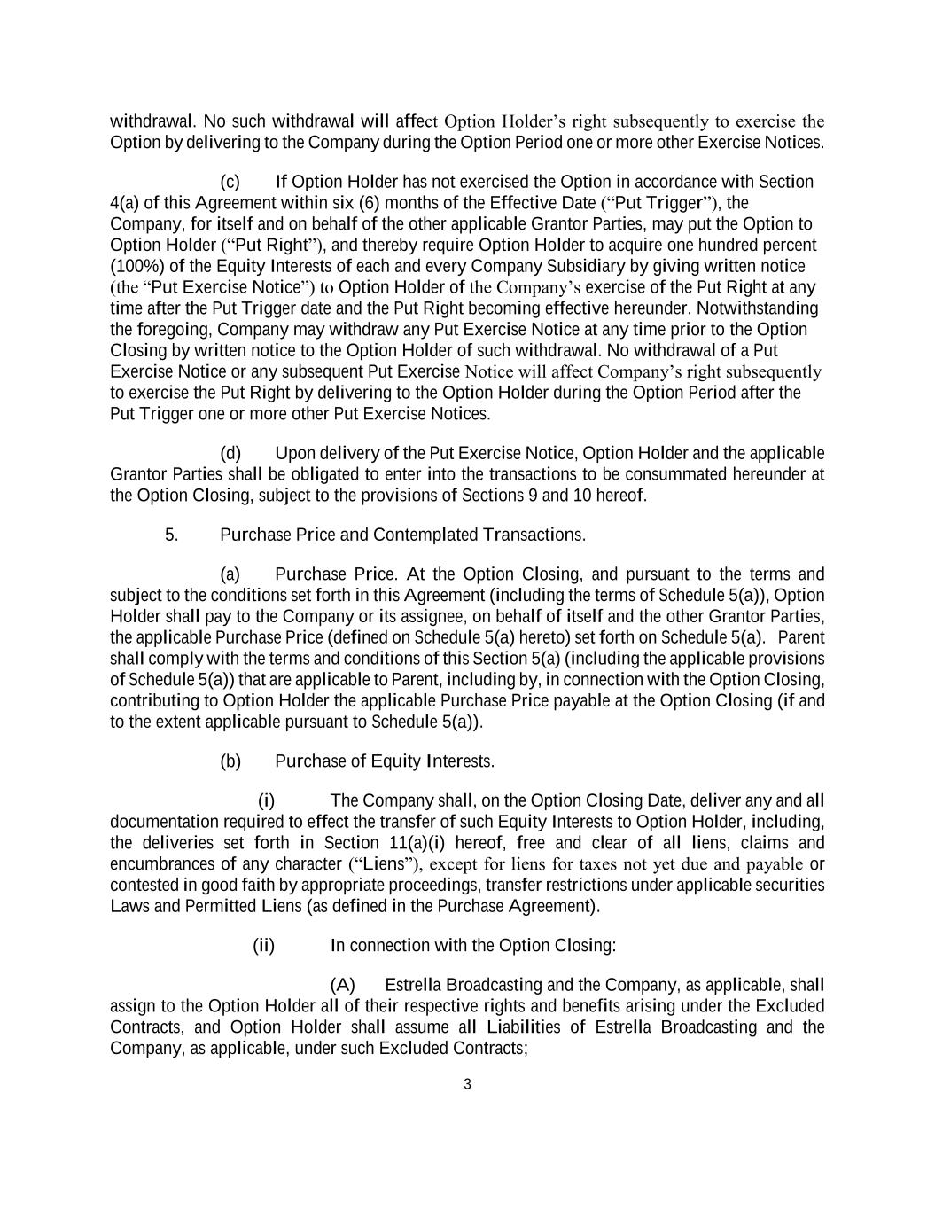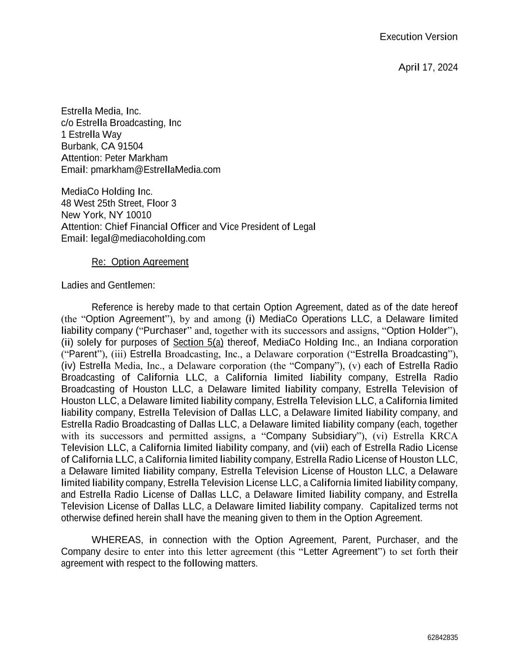 Execution Version 62842835 April 17, 2024 Estrella Media, Inc. c/o Estrella Broadcasting, Inc 1 Estrella Way Burbank, CA 91504 Attention: Peter Markham Email: pmarkham@EstrellaMedia.com MediaCo Holding Inc. 48 West 25th Street, Floor 3 New York, NY 10010 Attention: Chief Financial Officer and Vice President of Legal Email: legal@mediacoholding.com Re: Option Agreement Ladies and Gentlemen: Reference is hereby made to that certain Option Agreement, dated as of the date hereof (the “Option Agreement”), by and among (i) MediaCo Operations LLC, a Delaware limited liability company (“Purchaser” and, together with its successors and assigns, “Option Holder”), (ii) solely for purposes of Section 5(a) thereof, MediaCo Holding Inc., an Indiana corporation (“Parent”), (iii) Estrella Broadcasting, Inc., a Delaware corporation (“Estrella Broadcasting”), (iv) Estrella Media, Inc., a Delaware corporation (the “Company”), (v) each of Estrella Radio Broadcasting of California LLC, a California limited liability company, Estrella Radio Broadcasting of Houston LLC, a Delaware limited liability company, Estrella Television of Houston LLC, a Delaware limited liability company, Estrella Television LLC, a California limited liability company, Estrella Television of Dallas LLC, a Delaware limited liability company, and Estrella Radio Broadcasting of Dallas LLC, a Delaware limited liability company (each, together with its successors and permitted assigns, a “Company Subsidiary”), (vi) Estrella KRCA Television LLC, a California limited liability company, and (vii) each of Estrella Radio License of California LLC, a California limited liability company, Estrella Radio License of Houston LLC, a Delaware limited liability company, Estrella Television License of Houston LLC, a Delaware limited liability company, Estrella Television License LLC, a California limited liability company, and Estrella Radio License of Dallas LLC, a Delaware limited liability company, and Estrella Television License of Dallas LLC, a Delaware limited liability company. Capitalized terms not otherwise defined herein shall have the meaning given to them in the Option Agreement. WHEREAS, in connection with the Option Agreement, Parent, Purchaser, and the Company desire to enter into this letter agreement (this “Letter Agreement”) to set forth their agreement with respect to the following matters.