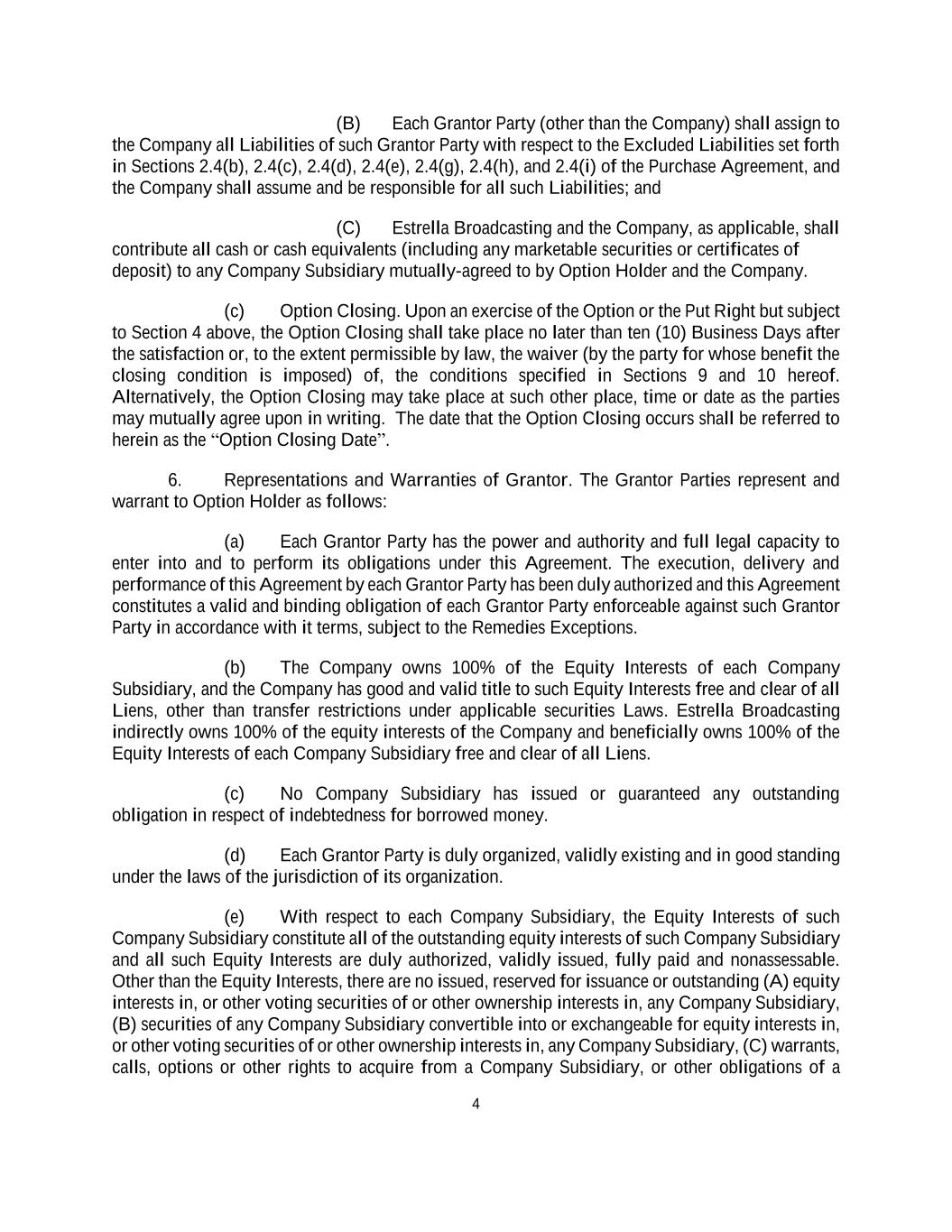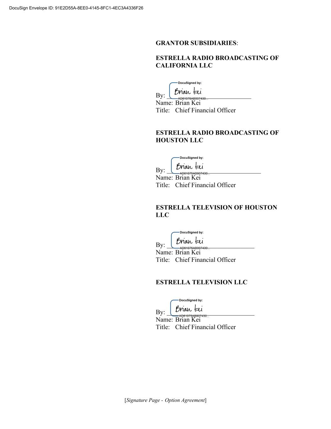[Signature Page - Option Agreement] GRANTOR SUBSIDIARIES: ESTRELLA RADIO BROADCASTING OF CALIFORNIA LLC By: __________________________ Name: Brian Kei Title: Chief Financial Officer ESTRELLA RADIO BROADCASTING OF HOUSTON LLC By: _____________________________ Name: Brian Kei Title: Chief Financial Officer ESTRELLA TELEVISION OF HOUSTON LLC By: ___________________________ Name: Brian Kei Title: Chief Financial Officer ESTRELLA TELEVISION LLC By: ___________________________ Name: Brian Kei Title: Chief Financial Officer DocuSign Envelope ID: 91E2D55A-8EE0-4145-8FC1-4EC3A4336F26