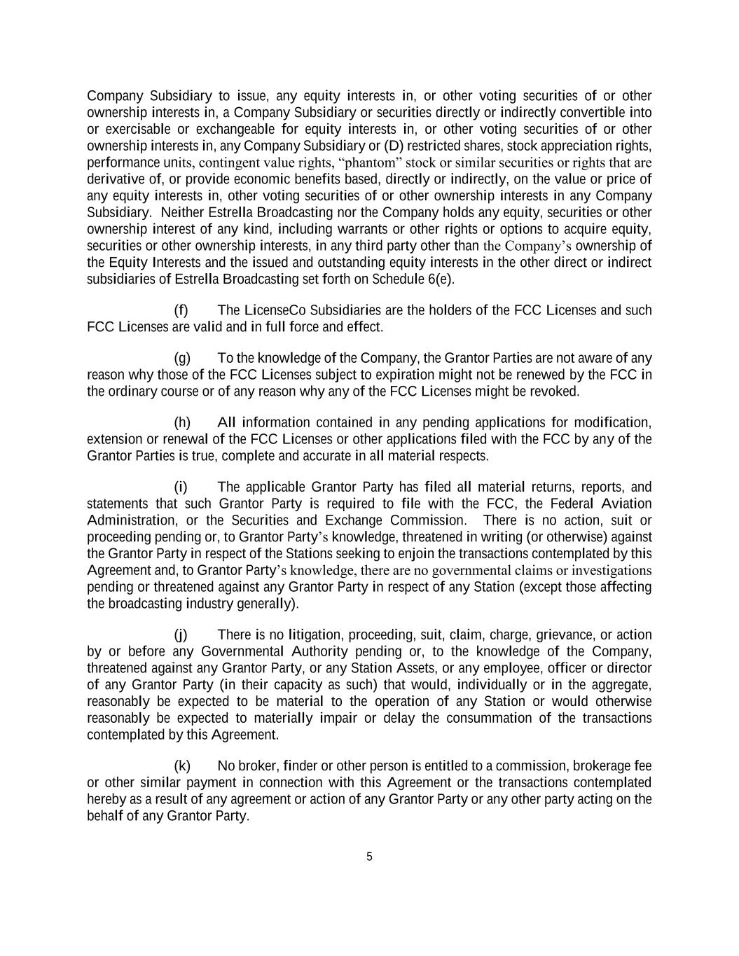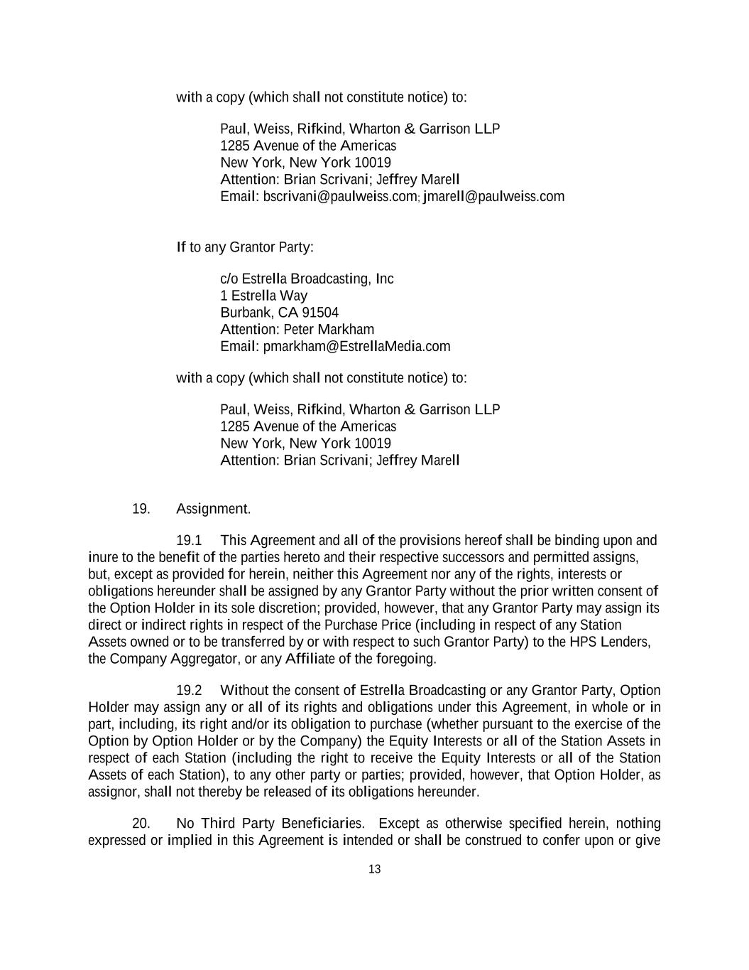 13 Estrella Broadcasting, Inc 1 Estrella Way Burbank, CA 91504 Attention: Peter Markham Email: pmarkham@EstrellaMedia.com with a copy (which shall not constitute notice) to: Paul, Weiss, Rifkind, Wharton & Garrison LLP 1285 Avenue of the Americas New York, New York 10019 Attention: Brian Scrivani; Jeffrey Marell Email: bscrivani@paulweiss.com; jmarell@paulweiss.com [END OF PAGE] [SIGNATURE PAGE FOLLOWS]