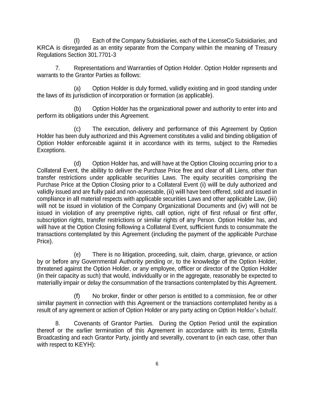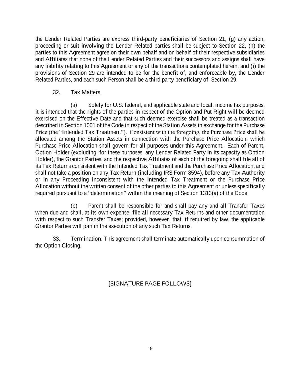 19 the Lender Related Parties are express third-party beneficiaries of Section 21, (g) any action, proceeding or suit involving the Lender Related parties shall be subject to Section 22, (h) the parties to this Agreement agree on their own behalf and on behalf of their respective subsidiaries and Affiliates that none of the Lender Related Parties and their successors and assigns shall have any liability relating to this Agreement or any of the transactions contemplated herein, and (i) the provisions of Section 29 are intended to be for the benefit of, and enforceable by, the Lender Related Parties, and each such Person shall be a third party beneficiary of Section 29. 32. Tax Matters. (a) Solely for U.S. federal, and applicable state and local, income tax purposes, it is intended that the rights of the parties in respect of the Option and Put Right will be deemed exercised on the Effective Date and that such deemed exercise shall be treated as a transaction described in Section 1001 of the Code in respect of the Station Assets in exchange for the Purchase Price (the “Intended Tax Treatment”). Consistent with the foregoing, the Purchase Price shall be allocated among the Station Assets in connection with the Purchase Price Allocation, which Purchase Price Allocation shall govern for all purposes under this Agreement. Each of Parent, Option Holder (excluding, for these purposes, any Lender Related Party in its capacity as Option Holder), the Grantor Parties, and the respective Affiliates of each of the foregoing shall file all of its Tax Returns consistent with the Intended Tax Treatment and the Purchase Price Allocation, and shall not take a position on any Tax Return (including IRS Form 8594), before any Tax Authority or in any Proceeding inconsistent with the Intended Tax Treatment or the Purchase Price Allocation without the written consent of the other parties to this Agreement or unless specifically required pursuant to a “determination” within the meaning of Section 1313(a) of the Code. (b) Parent shall be responsible for and shall pay any and all Transfer Taxes when due and shall, at its own expense, file all necessary Tax Returns and other documentation with respect to such Transfer Taxes; provided, however, that, if required by law, the applicable Grantor Parties will join in the execution of any such Tax Returns. 33. Termination. This agreement shall terminate automatically upon consummation of the Option Closing. [SIGNATURE PAGE FOLLOWS]