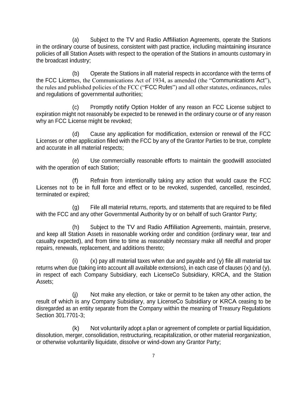 transactions contemplated under this Agreement and other related transactions, together with their respective Affiliates, and the respective officers, directors, employees, partners, trustees, shareholders, controlling persons, agents and Representatives of the foregoing, and their respective successors and assigns. “Letter Agreement” means that certain letter agreement, dated the date hereof, by and among the Company, the Option Holder as of the date hereof, and Parent, attached hereto as Annex B to Schedule 5(a). “Specified Provisions” means the terms set forth on Annex A to Schedule 5(a). “Station Assets” means all of the assets of each Station, including tangible and intangible personal property, licenses, authorizations and leases, contracts and agreements, owned or held by the Grantor Parties or in which a controlled Affiliate of a Grantor Party holds an interest, relating to the operation of any such Station, including (i) all of the licenses, permits and other authorizations issued by the FCC to the Grantor Parties (including, all licenses, permits and other authorizations of LicenseCo Subsidiaries) in respect of each Station, including any renewals, extensions or modifications thereof and additions thereto between the date hereof and the Option Closing (collectively, the “FCC Licenses”) and (ii) all other assignable licenses, permits, construction permits, approvals, concessions, franchises, certificates, consents, qualifications, registrations, privileges and other authorizations and other rights, from any Governmental Authority, to any Grantor Party used in connection with such Station, including any renewals, extensions or modifications thereof and additions thereto between the Effective Date and the Option Closing (collectively, the “Permits”). “Term Agent” means the “Term Agent” under and as defined in the Term Loan Agreement or any successor or assign thereof. “Term Loan Agreement” means that certain Term Loan Agreement, dated the date hereof, by and among Parent, the other persons party thereto as “Borrowers”, the financial institutions party thereto as “Lenders”, and Whitehawk Capital Partners LP in its capacity as Term Agent thereunder, as amended and in effect from time to time or any refinancing thereof. “Term Loan Documents” shall have the meaning ascribed to “Loan Documents” in the Term Loan Agreement or any similar term in any refinancing thereof. “Warrants” means warrants to purchase shares of Parent Class A Common Stock, each exercisable at an exercise price of $0.01 per share of Parent Class A Common Stock.