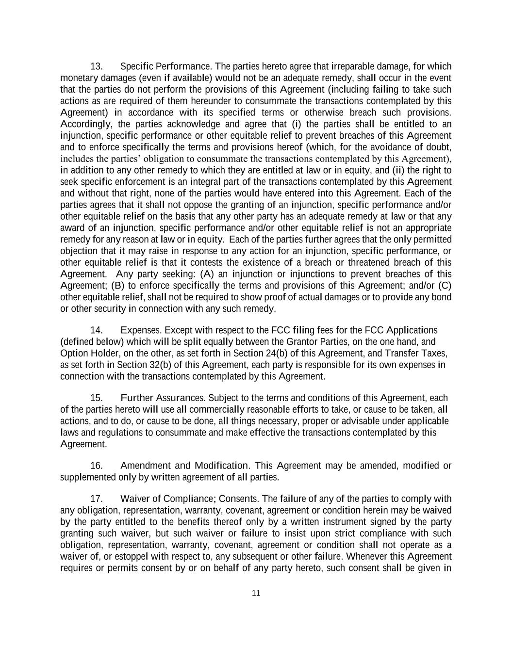 16 other filing (together with the FCC Application(s), the “FCC Filings”); (ii) file any appropriate amendment or modification to the FCC Filings; (iii) provide to Option Holder or Grantor Party any information, documents or other materials reasonably requested by it in connection with the preparation of any such FCC Filings; (iv) absent a Dismissal Filing (defined below), prosecute the FCC Applications with commercially reasonable diligence and otherwise use their commercially reasonable efforts to obtain the written consent of the FCC requested in the FCC Applications (the “FCC Consent”); (v) otherwise take any other action with respect to the FCC as may be reasonably necessary or reasonably requested by Option Holder or Grantor Party in connection with the transactions contemplated hereby (including, upon the request of Option Holder with regard to an Exercise Notice, the preparation, filing, and prosecution of any motion or other filing seeking to withdraw or dismiss any FCC Filings made by the parties in connection with the transactions contemplated by this Agreement (a “Dismissal Filing”)); and (vi) cooperate in good faith with the other applicable parties with respect to the foregoing covenants, all as may be determined by Option Holder or Grantor Party to be reasonably necessary or appropriate or advisable in order to consummate the transactions contemplated hereby. Each applicable party shall promptly provide the other with a copy of any pleading, order or other document served on it relating to the FCC Filings or any Dismissal Filing, shall furnish all information required by the FCC and shall be represented at all meetings or hearings scheduled to consider the FCC Filings. The parties each agree to comply with any condition imposed on them by any FCC Consent, except that no party shall be required to comply with any materially adverse condition, including, any condition that requires such party to divest any of its direct or indirect assets in a manner not contemplated in the FCC Filings. The parties shall oppose any petitions to deny or other objections filed with respect to the FCC Filings, as well as any requests for reconsideration or review of any FCC Consent or Dismissal Filing. Option Holder and Grantor Parties shall each pay their own costs and expenses in connection with the preparation and prosecution of the FCC Filings or any Dismissal Filing, and shall each pay one-half (1/2) of all filing fees relating to the transactions contemplated hereby irrespective of whether the transactions contemplated by this Agreement are consummated. 25. Headings. The section headings contained in this Agreement are solely for the purpose of reference, are not part of the agreement of the parties and shall not in any way affect the meaning or interpretation of this Agreement. 26. Counterparts. This Agreement may be executed in one or more counterparts, each of which shall be deemed an original, but all of which together shall constitute one and the same instrument. The delivery of an executed counterpart of the Agreement by facsimile or electronic transmission will be deemed to be an original counterpart of the Agreement so transmitted. 27. Entire Agreement. This Agreement, including the documents delivered pursuant to this Agreement or other written agreements referenced in this Agreement, including the Purchase Agreement, embody the entire agreement and understanding of the parties hereto in respect of the subject matter hereof. The Schedule(s) hereto are an integral part of this Agreement and are incorporated by reference herein. This Agreement and the Purchase Agreement supersede all prior negotiations and understandings between the parties with respect to the subject matter hereof, including any other writings executed prior to the date hereof relating to such negotiations, agreements and understandings.