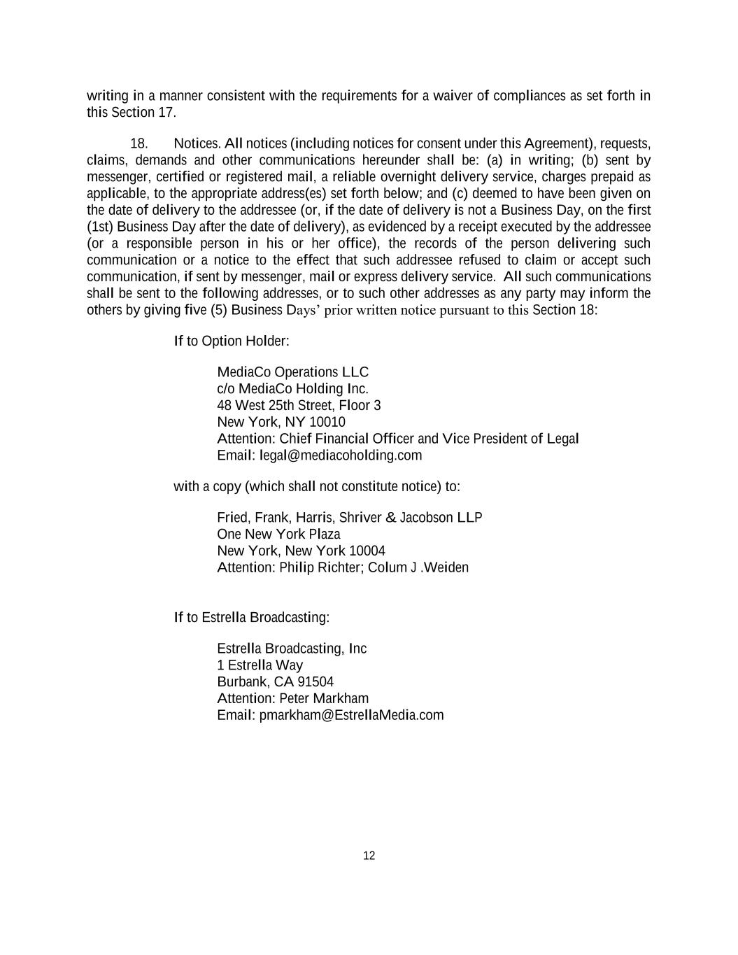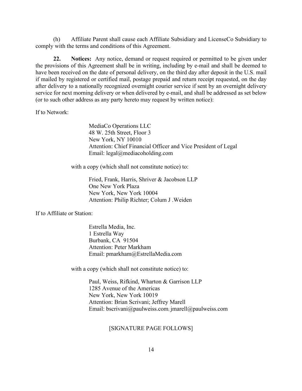 14 (h) Affiliate Parent shall cause each Affiliate Subsidiary and LicenseCo Subsidiary to comply with the terms and conditions of this Agreement. 22. Notices: Any notice, demand or request required or permitted to be given under the provisions of this Agreement shall be in writing, including by e-mail and shall be deemed to have been received on the date of personal delivery, on the third day after deposit in the U.S. mail if mailed by registered or certified mail, postage prepaid and return receipt requested, on the day after delivery to a nationally recognized overnight courier service if sent by an overnight delivery service for next morning delivery or when delivered by e-mail, and shall be addressed as set below (or to such other address as any party hereto may request by written notice): If to Network: MediaCo Operations LLC 48 W. 25th Street, Floor 3 New York, NY 10010 Attention: Chief Financial Officer and Vice President of Legal Email: legal@mediacoholding.com with a copy (which shall not constitute notice) to: Fried, Frank, Harris, Shriver & Jacobson LLP One New York Plaza New York, New York 10004 Attention: Philip Richter; Colum J .Weiden If to Affiliate or Station: Estrella Media, Inc. 1 Estrella Way Burbank, CA 91504 Attention: Peter Markham Email: pmarkham@EstrellaMedia.com with a copy (which shall not constitute notice) to: Paul, Weiss, Rifkind, Wharton & Garrison LLP 1285 Avenue of the Americas New York, New York 10019 Attention: Brian Scrivani; Jeffrey Marell Email: bscrivani@paulweiss.com; jmarell@paulweiss.com [SIGNATURE PAGE FOLLOWS]