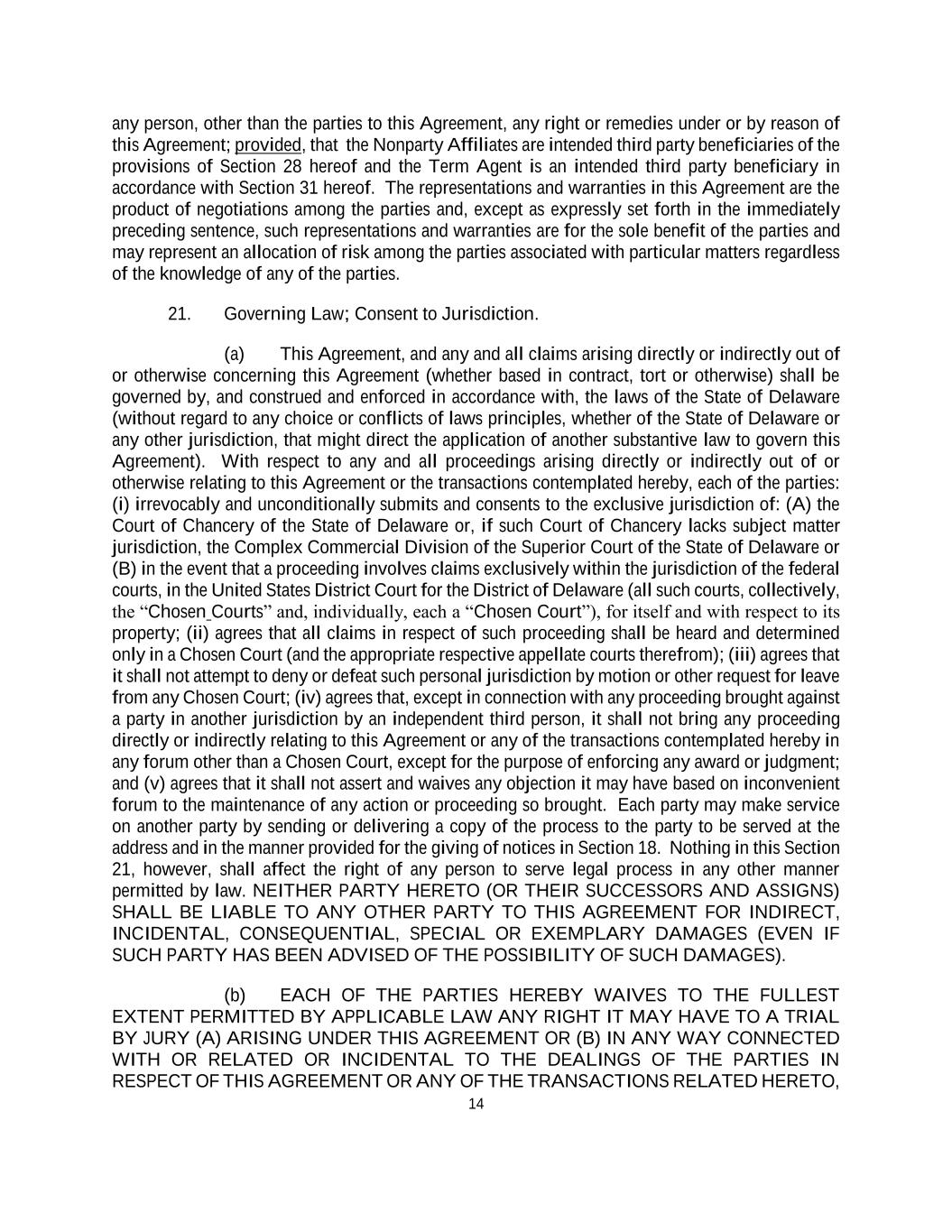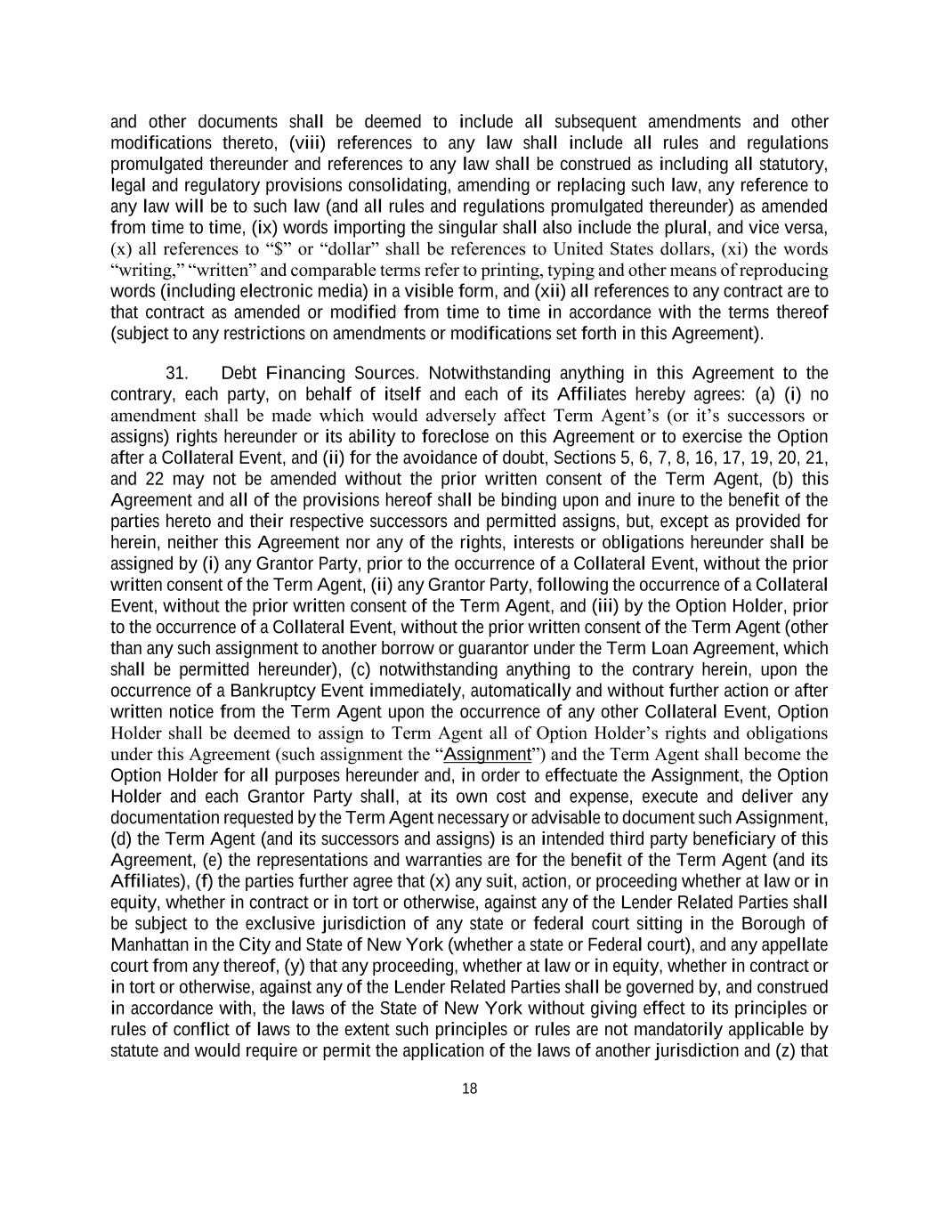 18 and other documents shall be deemed to include all subsequent amendments and other modifications thereto, (viii) references to any law shall include all rules and regulations promulgated thereunder and references to any law shall be construed as including all statutory, legal and regulatory provisions consolidating, amending or replacing such law, any reference to any law will be to such law (and all rules and regulations promulgated thereunder) as amended from time to time, (ix) words importing the singular shall also include the plural, and vice versa, (x) all references to “$” or “dollar” shall be references to United States dollars, (xi) the words “writing,” “written” and comparable terms refer to printing, typing and other means of reproducing words (including electronic media) in a visible form, and (xii) all references to any contract are to that contract as amended or modified from time to time in accordance with the terms thereof (subject to any restrictions on amendments or modifications set forth in this Agreement). 31. Debt Financing Sources. Notwithstanding anything in this Agreement to the contrary, each party, on behalf of itself and each of its Affiliates hereby agrees: (a) (i) no amendment shall be made which would adversely affect Term Agent’s (or it’s successors or assigns) rights hereunder or its ability to foreclose on this Agreement or to exercise the Option after a Collateral Event, and (ii) for the avoidance of doubt, Sections 5, 6, 7, 8, 16, 17, 19, 20, 21, and 22 may not be amended without the prior written consent of the Term Agent, (b) this Agreement and all of the provisions hereof shall be binding upon and inure to the benefit of the parties hereto and their respective successors and permitted assigns, but, except as provided for herein, neither this Agreement nor any of the rights, interests or obligations hereunder shall be assigned by (i) any Grantor Party, prior to the occurrence of a Collateral Event, without the prior written consent of the Term Agent, (ii) any Grantor Party, following the occurrence of a Collateral Event, without the prior written consent of the Term Agent, and (iii) by the Option Holder, prior to the occurrence of a Collateral Event, without the prior written consent of the Term Agent (other than any such assignment to another borrow or guarantor under the Term Loan Agreement, which shall be permitted hereunder), (c) notwithstanding anything to the contrary herein, upon the occurrence of a Bankruptcy Event immediately, automatically and without further action or after written notice from the Term Agent upon the occurrence of any other Collateral Event, Option Holder shall be deemed to assign to Term Agent all of Option Holder’s rights and obligations under this Agreement (such assignment the “Assignment”) and the Term Agent shall become the Option Holder for all purposes hereunder and, in order to effectuate the Assignment, the Option Holder and each Grantor Party shall, at its own cost and expense, execute and deliver any documentation requested by the Term Agent necessary or advisable to document such Assignment, (d) the Term Agent (and its successors and assigns) is an intended third party beneficiary of this Agreement, (e) the representations and warranties are for the benefit of the Term Agent (and its Affiliates), (f) the parties further agree that (x) any suit, action, or proceeding whether at law or in equity, whether in contract or in tort or otherwise, against any of the Lender Related Parties shall be subject to the exclusive jurisdiction of any state or federal court sitting in the Borough of Manhattan in the City and State of New York (whether a state or Federal court), and any appellate court from any thereof, (y) that any proceeding, whether at law or in equity, whether in contract or in tort or otherwise, against any of the Lender Related Parties shall be governed by, and construed in accordance with, the laws of the State of New York without giving effect to its principles or rules of conflict of laws to the extent such principles or rules are not mandatorily applicable by statute and would require or permit the application of the laws of another jurisdiction and (z) that