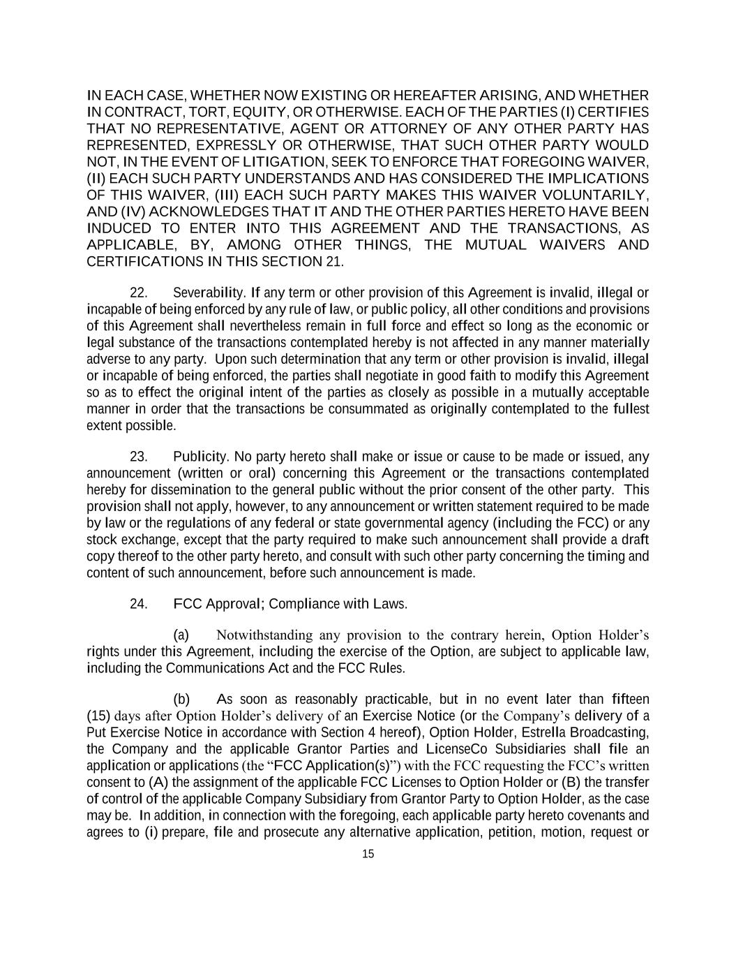 15 IN EACH CASE, WHETHER NOW EXISTING OR HEREAFTER ARISING, AND WHETHER IN CONTRACT, TORT, EQUITY, OR OTHERWISE. EACH OF THE PARTIES (I) CERTIFIES THAT NO REPRESENTATIVE, AGENT OR ATTORNEY OF ANY OTHER PARTY HAS REPRESENTED, EXPRESSLY OR OTHERWISE, THAT SUCH OTHER PARTY WOULD NOT, IN THE EVENT OF LITIGATION, SEEK TO ENFORCE THAT FOREGOING WAIVER, (II) EACH SUCH PARTY UNDERSTANDS AND HAS CONSIDERED THE IMPLICATIONS OF THIS WAIVER, (III) EACH SUCH PARTY MAKES THIS WAIVER VOLUNTARILY, AND (IV) ACKNOWLEDGES THAT IT AND THE OTHER PARTIES HERETO HAVE BEEN INDUCED TO ENTER INTO THIS AGREEMENT AND THE TRANSACTIONS, AS APPLICABLE, BY, AMONG OTHER THINGS, THE MUTUAL WAIVERS AND CERTIFICATIONS IN THIS SECTION 21. 22. Severability. If any term or other provision of this Agreement is invalid, illegal or incapable of being enforced by any rule of law, or public policy, all other conditions and provisions of this Agreement shall nevertheless remain in full force and effect so long as the economic or legal substance of the transactions contemplated hereby is not affected in any manner materially adverse to any party. Upon such determination that any term or other provision is invalid, illegal or incapable of being enforced, the parties shall negotiate in good faith to modify this Agreement so as to effect the original intent of the parties as closely as possible in a mutually acceptable manner in order that the transactions be consummated as originally contemplated to the fullest extent possible. 23. Publicity. No party hereto shall make or issue or cause to be made or issued, any announcement (written or oral) concerning this Agreement or the transactions contemplated hereby for dissemination to the general public without the prior consent of the other party. This provision shall not apply, however, to any announcement or written statement required to be made by law or the regulations of any federal or state governmental agency (including the FCC) or any stock exchange, except that the party required to make such announcement shall provide a draft copy thereof to the other party hereto, and consult with such other party concerning the timing and content of such announcement, before such announcement is made. 24. FCC Approval; Compliance with Laws. (a) Notwithstanding any provision to the contrary herein, Option Holder’s rights under this Agreement, including the exercise of the Option, are subject to applicable law, including the Communications Act and the FCC Rules. (b) As soon as reasonably practicable, but in no event later than fifteen (15) days after Option Holder’s delivery of an Exercise Notice (or the Company’s delivery of a Put Exercise Notice in accordance with Section 4 hereof), Option Holder, Estrella Broadcasting, the Company and the applicable Grantor Parties and LicenseCo Subsidiaries shall file an application or applications (the “FCC Application(s)”) with the FCC requesting the FCC’s written consent to (A) the assignment of the applicable FCC Licenses to Option Holder or (B) the transfer of control of the applicable Company Subsidiary from Grantor Party to Option Holder, as the case may be. In addition, in connection with the foregoing, each applicable party hereto covenants and agrees to (i) prepare, file and prosecute any alternative application, petition, motion, request or