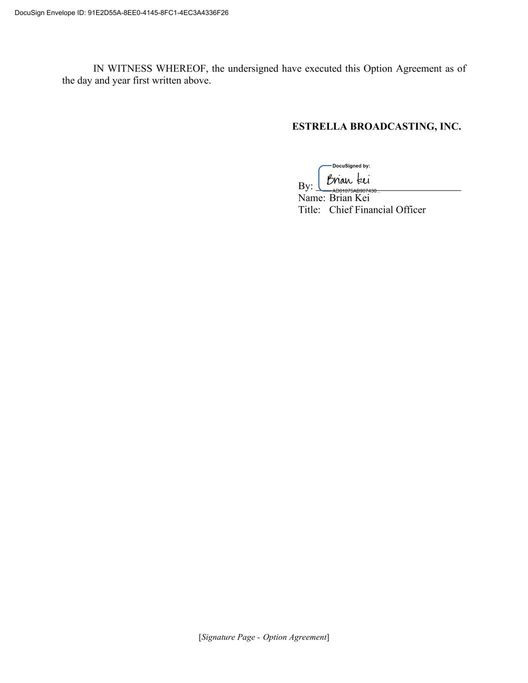 [Signature Page - Option Agreement] IN WITNESS WHEREOF, the undersigned have executed this Option Agreement as of the day and year first written above. ESTRELLA BROADCASTING, INC. By: Name: Brian Kei Title: Chief Financial Officer DocuSign Envelope ID: 91E2D55A-8EE0-4145-8FC1-4EC3A4336F26