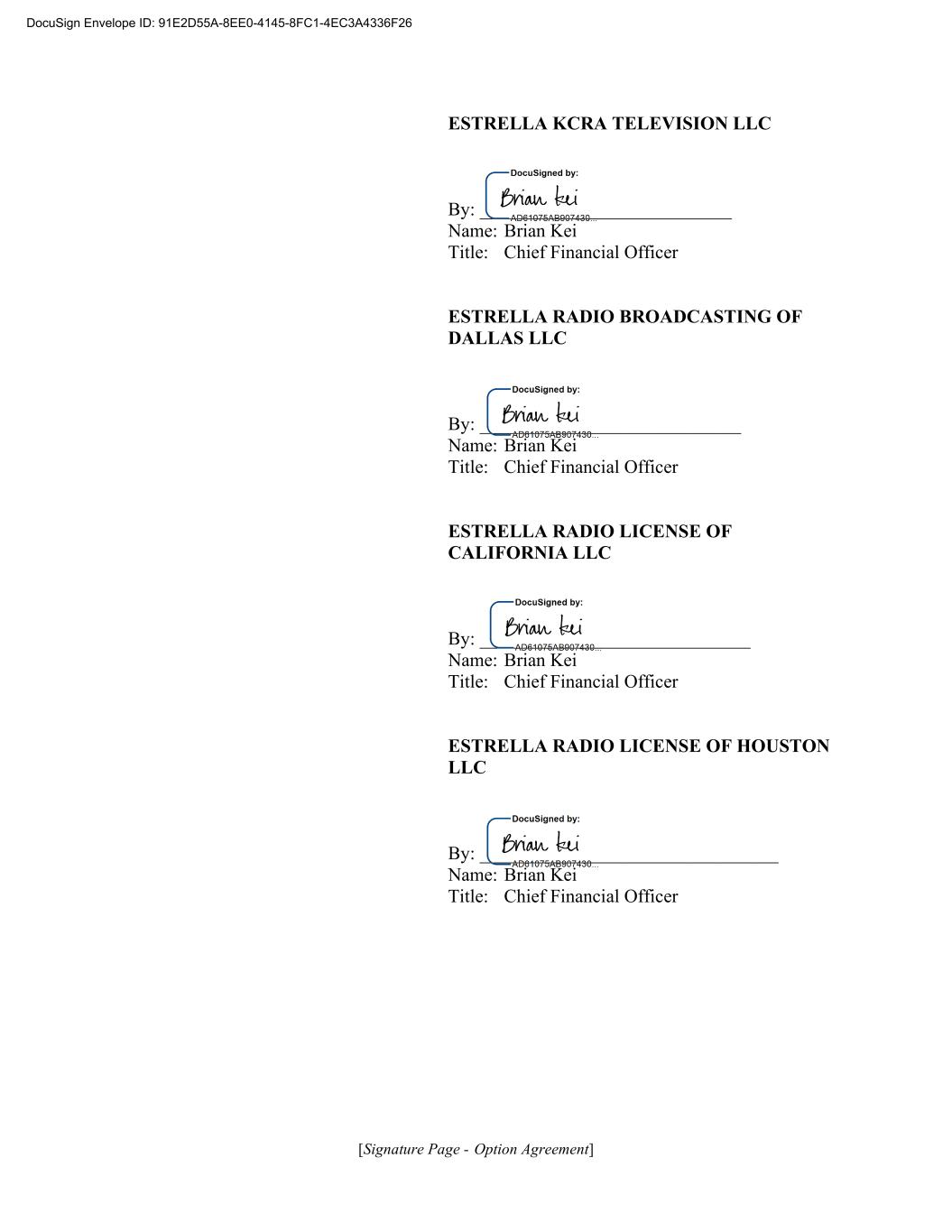 [Signature Page - Option Agreement] ESTRELLA KCRA TELEVISION LLC By: ___________________________ Name: Brian Kei Title: Chief Financial Officer ESTRELLA RADIO BROADCASTING OF DALLAS LLC By: ____________________________ Name: Brian Kei Title: Chief Financial Officer ESTRELLA RADIO LICENSE OF CALIFORNIA LLC By: _____________________________ Name: Brian Kei Title: Chief Financial Officer ESTRELLA RADIO LICENSE OF HOUSTON LLC By: ________________________________ Name: Brian Kei Title: Chief Financial Officer DocuSign Envelope ID: 91E2D55A-8EE0-4145-8FC1-4EC3A4336F26