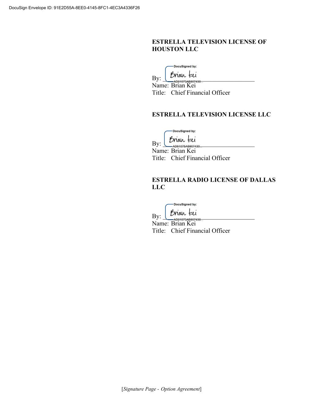 [Signature Page - Option Agreement] ESTRELLA TELEVISION LICENSE OF HOUSTON LLC By: _____________________________ Name: Brian Kei Title: Chief Financial Officer ESTRELLA TELEVISION LICENSE LLC By: _____________________________ Name: Brian Kei Title: Chief Financial Officer ESTRELLA RADIO LICENSE OF DALLAS LLC By: _____________________________ Name: Brian Kei Title: Chief Financial Officer DocuSign Envelope ID: 91E2D55A-8EE0-4145-8FC1-4EC3A4336F26
