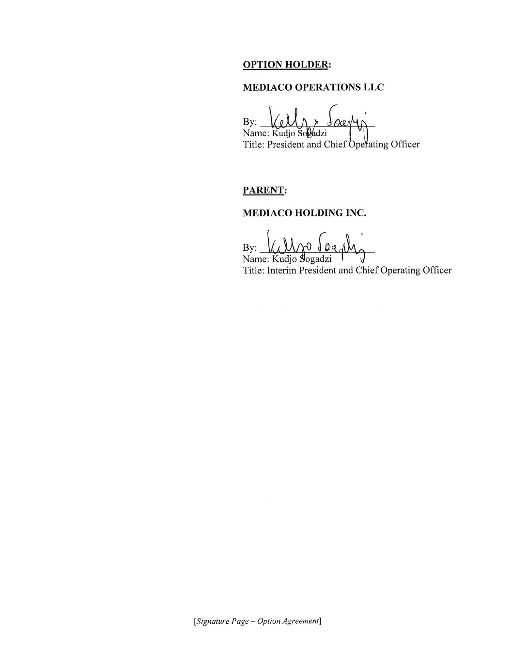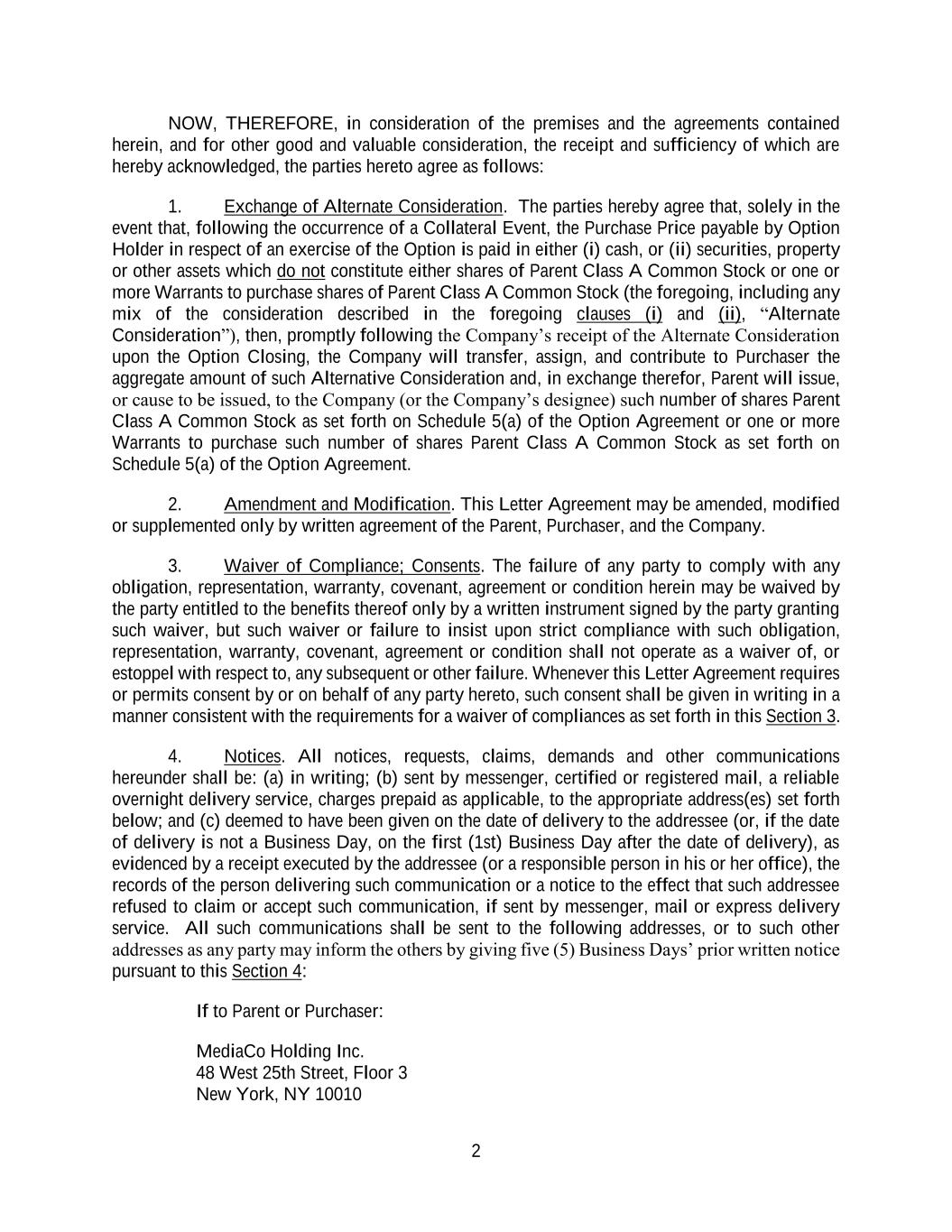 2 NOW, THEREFORE, in consideration of the premises and the agreements contained herein, and for other good and valuable consideration, the receipt and sufficiency of which are hereby acknowledged, the parties hereto agree as follows: 1. Exchange of Alternate Consideration. The parties hereby agree that, solely in the event that, following the occurrence of a Collateral Event, the Purchase Price payable by Option Holder in respect of an exercise of the Option is paid in either (i) cash, or (ii) securities, property or other assets which do not constitute either shares of Parent Class A Common Stock or one or more Warrants to purchase shares of Parent Class A Common Stock (the foregoing, including any mix of the consideration described in the foregoing clauses (i) and (ii), “Alternate Consideration”), then, promptly following the Company’s receipt of the Alternate Consideration upon the Option Closing, the Company will transfer, assign, and contribute to Purchaser the aggregate amount of such Alternative Consideration and, in exchange therefor, Parent will issue, or cause to be issued, to the Company (or the Company’s designee) such number of shares Parent Class A Common Stock as set forth on Schedule 5(a) of the Option Agreement or one or more Warrants to purchase such number of shares Parent Class A Common Stock as set forth on Schedule 5(a) of the Option Agreement. 2. Amendment and Modification. This Letter Agreement may be amended, modified or supplemented only by written agreement of the Parent, Purchaser, and the Company. 3. Waiver of Compliance; Consents. The failure of any party to comply with any obligation, representation, warranty, covenant, agreement or condition herein may be waived by the party entitled to the benefits thereof only by a written instrument signed by the party granting such waiver, but such waiver or failure to insist upon strict compliance with such obligation, representation, warranty, covenant, agreement or condition shall not operate as a waiver of, or estoppel with respect to, any subsequent or other failure. Whenever this Letter Agreement requires or permits consent by or on behalf of any party hereto, such consent shall be given in writing in a manner consistent with the requirements for a waiver of compliances as set forth in this Section 3. 4. Notices. All notices, requests, claims, demands and other communications hereunder shall be: (a) in writing; (b) sent by messenger, certified or registered mail, a reliable overnight delivery service, charges prepaid as applicable, to the appropriate address(es) set forth below; and (c) deemed to have been given on the date of delivery to the addressee (or, if the date of delivery is not a Business Day, on the first (1st) Business Day after the date of delivery), as evidenced by a receipt executed by the addressee (or a responsible person in his or her office), the records of the person delivering such communication or a notice to the effect that such addressee refused to claim or accept such communication, if sent by messenger, mail or express delivery service. All such communications shall be sent to the following addresses, or to such other addresses as any party may inform the others by giving five (5) Business Days’ prior written notice pursuant to this Section 4: If to Parent or Purchaser: MediaCo Holding Inc. 48 West 25th Street, Floor 3 New York, NY 10010