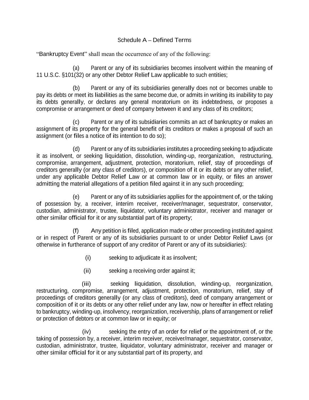 Schedule A – Defined Terms “Bankruptcy Event” shall mean the occurrence of any of the following: (a) Parent or any of its subsidiaries becomes insolvent within the meaning of 11 U.S.C. §101(32) or any other Debtor Relief Law applicable to such entities; (b) Parent or any of its subsidiaries generally does not or becomes unable to pay its debts or meet its liabilities as the same become due, or admits in writing its inability to pay its debts generally, or declares any general moratorium on its indebtedness, or proposes a compromise or arrangement or deed of company between it and any class of its creditors; (c) Parent or any of its subsidiaries commits an act of bankruptcy or makes an assignment of its property for the general benefit of its creditors or makes a proposal of such an assignment (or files a notice of its intention to do so); (d) Parent or any of its subsidiaries institutes a proceeding seeking to adjudicate it as insolvent, or seeking liquidation, dissolution, winding-up, reorganization, restructuring, compromise, arrangement, adjustment, protection, moratorium, relief, stay of proceedings of creditors generally (or any class of creditors), or composition of it or its debts or any other relief, under any applicable Debtor Relief Law or at common law or in equity, or files an answer admitting the material allegations of a petition filed against it in any such proceeding; (e) Parent or any of its subsidiaries applies for the appointment of, or the taking of possession by, a receiver, interim receiver, receiver/manager, sequestrator, conservator, custodian, administrator, trustee, liquidator, voluntary administrator, receiver and manager or other similar official for it or any substantial part of its property; (f) Any petition is filed, application made or other proceeding instituted against or in respect of Parent or any of its subsidiaries pursuant to or under Debtor Relief Laws (or otherwise in furtherance of support of any creditor of Parent or any of its subsidiaries): (i) seeking to adjudicate it as insolvent; (ii) seeking a receiving order against it; (iii) seeking liquidation, dissolution, winding-up, reorganization, restructuring, compromise, arrangement, adjustment, protection, moratorium, relief, stay of proceedings of creditors generally (or any class of creditors), deed of company arrangement or composition of it or its debts or any other relief under any law, now or hereafter in effect relating to bankruptcy, winding-up, insolvency, reorganization, receivership, plans of arrangement or relief or protection of debtors or at common law or in equity; or (iv) seeking the entry of an order for relief or the appointment of, or the taking of possession by, a receiver, interim receiver, receiver/manager, sequestrator, conservator, custodian, administrator, trustee, liquidator, voluntary administrator, receiver and manager or other similar official for it or any substantial part of its property, and
