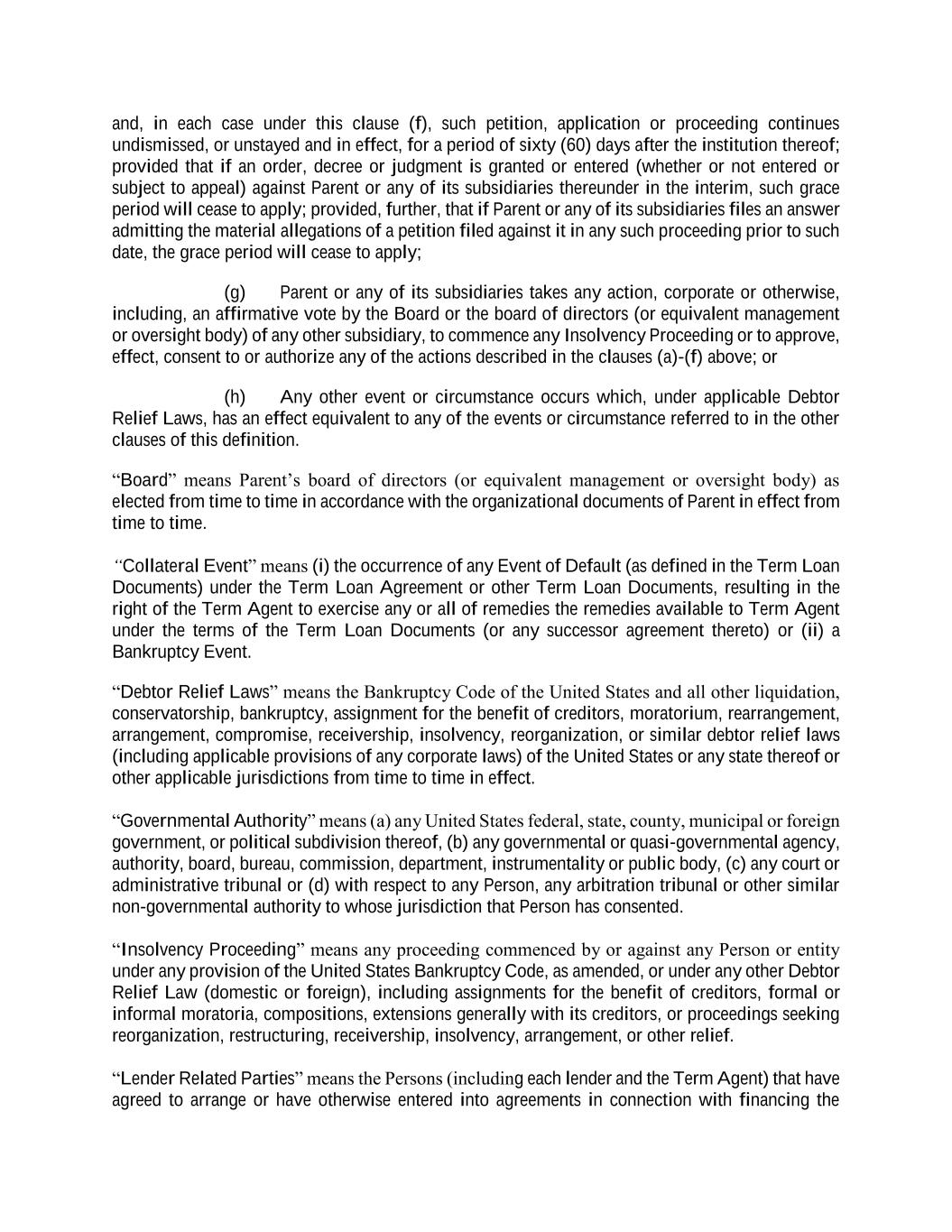 and, in each case under this clause (f), such petition, application or proceeding continues undismissed, or unstayed and in effect, for a period of sixty (60) days after the institution thereof; provided that if an order, decree or judgment is granted or entered (whether or not entered or subject to appeal) against Parent or any of its subsidiaries thereunder in the interim, such grace period will cease to apply; provided, further, that if Parent or any of its subsidiaries files an answer admitting the material allegations of a petition filed against it in any such proceeding prior to such date, the grace period will cease to apply; (g) Parent or any of its subsidiaries takes any action, corporate or otherwise, including, an affirmative vote by the Board or the board of directors (or equivalent management or oversight body) of any other subsidiary, to commence any Insolvency Proceeding or to approve, effect, consent to or authorize any of the actions described in the clauses (a)-(f) above; or (h) Any other event or circumstance occurs which, under applicable Debtor Relief Laws, has an effect equivalent to any of the events or circumstance referred to in the other clauses of this definition. “Board” means Parent’s board of directors (or equivalent management or oversight body) as elected from time to time in accordance with the organizational documents of Parent in effect from time to time. “Collateral Event” means (i) the occurrence of any Event of Default (as defined in the Term Loan Documents) under the Term Loan Agreement or other Term Loan Documents, resulting in the right of the Term Agent to exercise any or all of remedies the remedies available to Term Agent under the terms of the Term Loan Documents (or any successor agreement thereto) or (ii) a Bankruptcy Event. “Debtor Relief Laws” means the Bankruptcy Code of the United States and all other liquidation, conservatorship, bankruptcy, assignment for the benefit of creditors, moratorium, rearrangement, arrangement, compromise, receivership, insolvency, reorganization, or similar debtor relief laws (including applicable provisions of any corporate laws) of the United States or any state thereof or other applicable jurisdictions from time to time in effect. “Governmental Authority” means (a) any United States federal, state, county, municipal or foreign government, or political subdivision thereof, (b) any governmental or quasi-governmental agency, authority, board, bureau, commission, department, instrumentality or public body, (c) any court or administrative tribunal or (d) with respect to any Person, any arbitration tribunal or other similar non-governmental authority to whose jurisdiction that Person has consented. “Insolvency Proceeding” means any proceeding commenced by or against any Person or entity under any provision of the United States Bankruptcy Code, as amended, or under any other Debtor Relief Law (domestic or foreign), including assignments for the benefit of creditors, formal or informal moratoria, compositions, extensions generally with its creditors, or proceedings seeking reorganization, restructuring, receivership, insolvency, arrangement, or other relief. “Lender Related Parties” means the Persons (including each lender and the Term Agent) that have agreed to arrange or have otherwise entered into agreements in connection with financing the