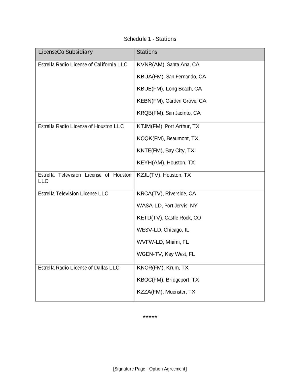 [Signature Page - Option Agreement] Schedule 1 - Stations LicenseCo Subsidiary Stations Estrella Radio License of California LLC KVNR(AM), Santa Ana, CA KBUA(FM), San Fernando, CA KBUE(FM), Long Beach, CA KEBN(FM), Garden Grove, CA KRQB(FM), San Jacinto, CA Estrella Radio License of Houston LLC KTJM(FM), Port Arthur, TX KQQK(FM), Beaumont, TX KNTE(FM), Bay City, TX KEYH(AM), Houston, TX Estrella Television License of Houston LLC KZJL(TV), Houston, TX Estrella Television License LLC KRCA(TV), Riverside, CA WASA-LD, Port Jervis, NY KETD(TV), Castle Rock, CO WESV-LD, Chicago, IL WVFW-LD, Miami, FL WGEN-TV, Key West, FL Estrella Radio License of Dallas LLC KNOR(FM), Krum, TX KBOC(FM), Bridgeport, TX KZZA(FM), Muenster, TX *****