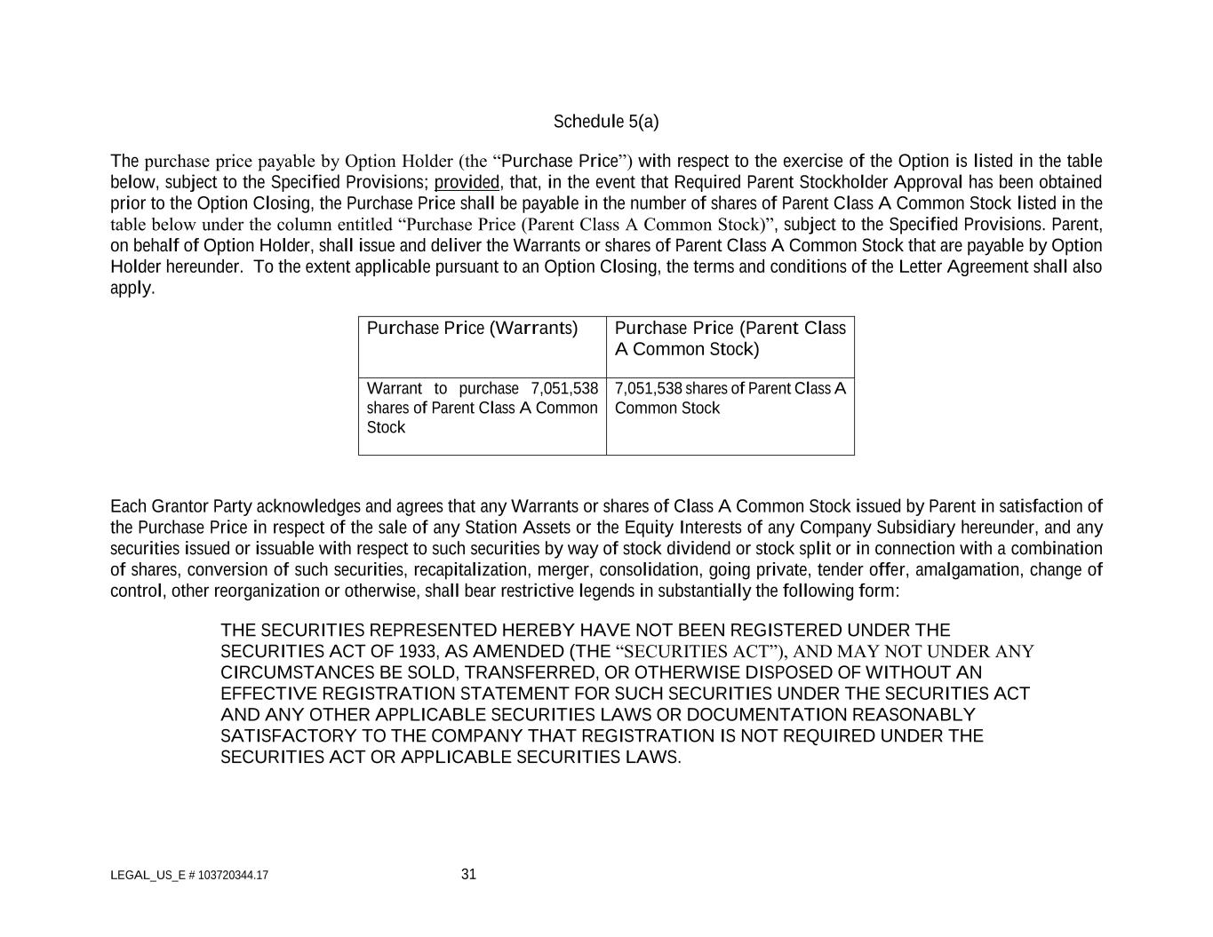 LEGAL_US_E # 103720344.17 31 Schedule 5(a) The purchase price payable by Option Holder (the “Purchase Price”) with respect to the exercise of the Option is listed in the table below, subject to the Specified Provisions; provided, that, in the event that Required Parent Stockholder Approval has been obtained prior to the Option Closing, the Purchase Price shall be payable in the number of shares of Parent Class A Common Stock listed in the table below under the column entitled “Purchase Price (Parent Class A Common Stock)”, subject to the Specified Provisions. Parent, on behalf of Option Holder, shall issue and deliver the Warrants or shares of Parent Class A Common Stock that are payable by Option Holder hereunder. To the extent applicable pursuant to an Option Closing, the terms and conditions of the Letter Agreement shall also apply. Purchase Price (Warrants) Purchase Price (Parent Class A Common Stock) Warrant to purchase 7,051,538 shares of Parent Class A Common Stock 7,051,538 shares of Parent Class A Common Stock Each Grantor Party acknowledges and agrees that any Warrants or shares of Class A Common Stock issued by Parent in satisfaction of the Purchase Price in respect of the sale of any Station Assets or the Equity Interests of any Company Subsidiary hereunder, and any securities issued or issuable with respect to such securities by way of stock dividend or stock split or in connection with a combination of shares, conversion of such securities, recapitalization, merger, consolidation, going private, tender offer, amalgamation, change of control, other reorganization or otherwise, shall bear restrictive legends in substantially the following form: THE SECURITIES REPRESENTED HEREBY HAVE NOT BEEN REGISTERED UNDER THE SECURITIES ACT OF 1933, AS AMENDED (THE “SECURITIES ACT”), AND MAY NOT UNDER ANY CIRCUMSTANCES BE SOLD, TRANSFERRED, OR OTHERWISE DISPOSED OF WITHOUT AN EFFECTIVE REGISTRATION STATEMENT FOR SUCH SECURITIES UNDER THE SECURITIES ACT AND ANY OTHER APPLICABLE SECURITIES LAWS OR DOCUMENTATION REASONABLY SATISFACTORY TO THE COMPANY THAT REGISTRATION IS NOT REQUIRED UNDER THE SECURITIES ACT OR APPLICABLE SECURITIES LAWS.