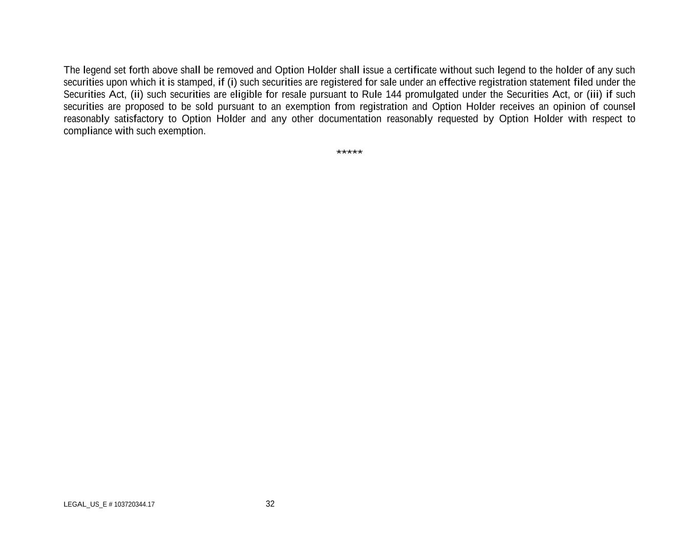 LEGAL_US_E # 103720344.17 32 The legend set forth above shall be removed and Option Holder shall issue a certificate without such legend to the holder of any such securities upon which it is stamped, if (i) such securities are registered for sale under an effective registration statement filed under the Securities Act, (ii) such securities are eligible for resale pursuant to Rule 144 promulgated under the Securities Act, or (iii) if such securities are proposed to be sold pursuant to an exemption from registration and Option Holder receives an opinion of counsel reasonably satisfactory to Option Holder and any other documentation reasonably requested by Option Holder with respect to compliance with such exemption. *****