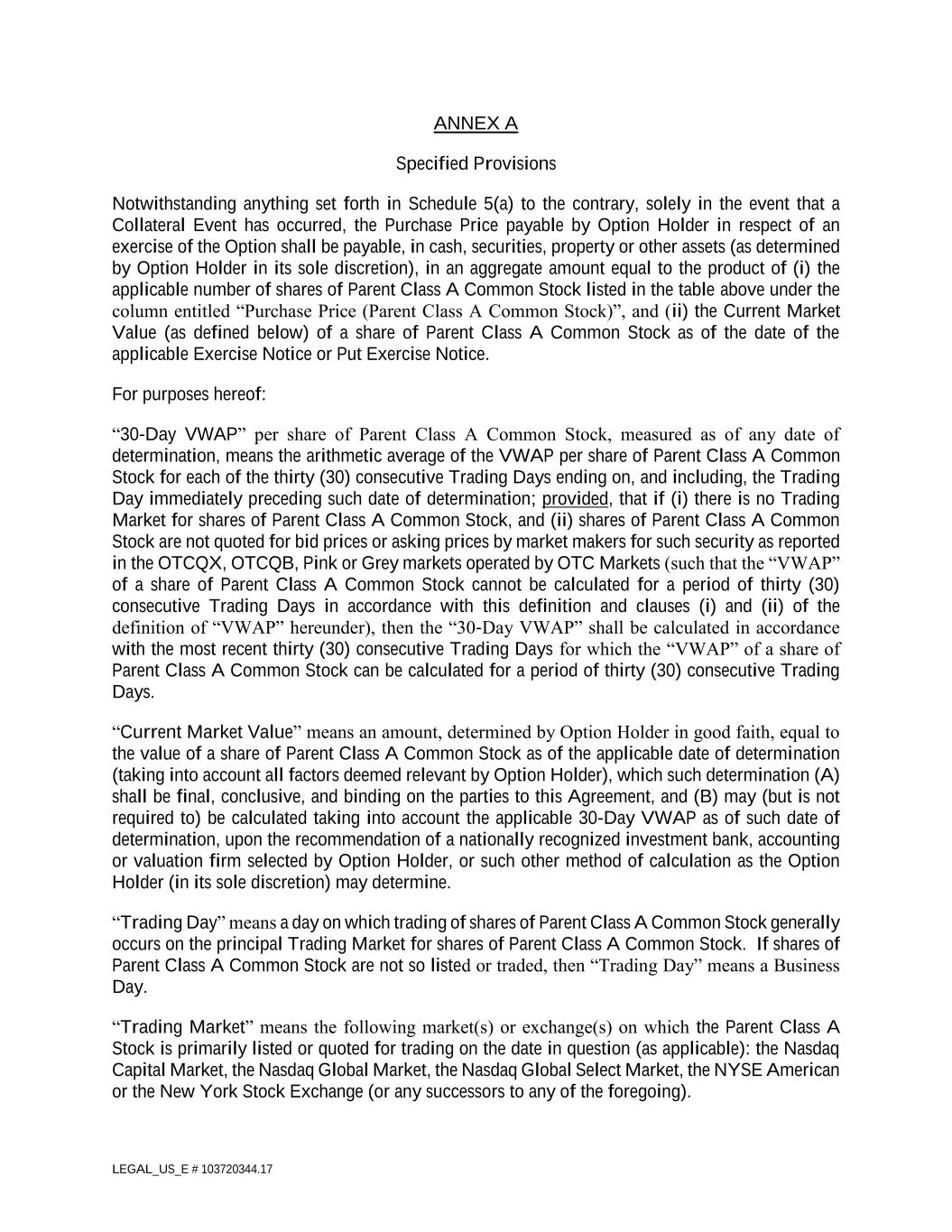 LEGAL_US_E # 103720344.17 ANNEX A Specified Provisions Notwithstanding anything set forth in Schedule 5(a) to the contrary, solely in the event that a Collateral Event has occurred, the Purchase Price payable by Option Holder in respect of an exercise of the Option shall be payable, in cash, securities, property or other assets (as determined by Option Holder in its sole discretion), in an aggregate amount equal to the product of (i) the applicable number of shares of Parent Class A Common Stock listed in the table above under the column entitled “Purchase Price (Parent Class A Common Stock)”, and (ii) the Current Market Value (as defined below) of a share of Parent Class A Common Stock as of the date of the applicable Exercise Notice or Put Exercise Notice. For purposes hereof: “30-Day VWAP” per share of Parent Class A Common Stock, measured as of any date of determination, means the arithmetic average of the VWAP per share of Parent Class A Common Stock for each of the thirty (30) consecutive Trading Days ending on, and including, the Trading Day immediately preceding such date of determination; provided, that if (i) there is no Trading Market for shares of Parent Class A Common Stock, and (ii) shares of Parent Class A Common Stock are not quoted for bid prices or asking prices by market makers for such security as reported in the OTCQX, OTCQB, Pink or Grey markets operated by OTC Markets (such that the “VWAP” of a share of Parent Class A Common Stock cannot be calculated for a period of thirty (30) consecutive Trading Days in accordance with this definition and clauses (i) and (ii) of the definition of “VWAP” hereunder), then the “30-Day VWAP” shall be calculated in accordance with the most recent thirty (30) consecutive Trading Days for which the “VWAP” of a share of Parent Class A Common Stock can be calculated for a period of thirty (30) consecutive Trading Days. “Current Market Value” means an amount, determined by Option Holder in good faith, equal to the value of a share of Parent Class A Common Stock as of the applicable date of determination (taking into account all factors deemed relevant by Option Holder), which such determination (A) shall be final, conclusive, and binding on the parties to this Agreement, and (B) may (but is not required to) be calculated taking into account the applicable 30-Day VWAP as of such date of determination, upon the recommendation of a nationally recognized investment bank, accounting or valuation firm selected by Option Holder, or such other method of calculation as the Option Holder (in its sole discretion) may determine. “Trading Day” means a day on which trading of shares of Parent Class A Common Stock generally occurs on the principal Trading Market for shares of Parent Class A Common Stock. If shares of Parent Class A Common Stock are not so listed or traded, then “Trading Day” means a Business Day. “Trading Market” means the following market(s) or exchange(s) on which the Parent Class A Stock is primarily listed or quoted for trading on the date in question (as applicable): the Nasdaq Capital Market, the Nasdaq Global Market, the Nasdaq Global Select Market, the NYSE American or the New York Stock Exchange (or any successors to any of the foregoing).
