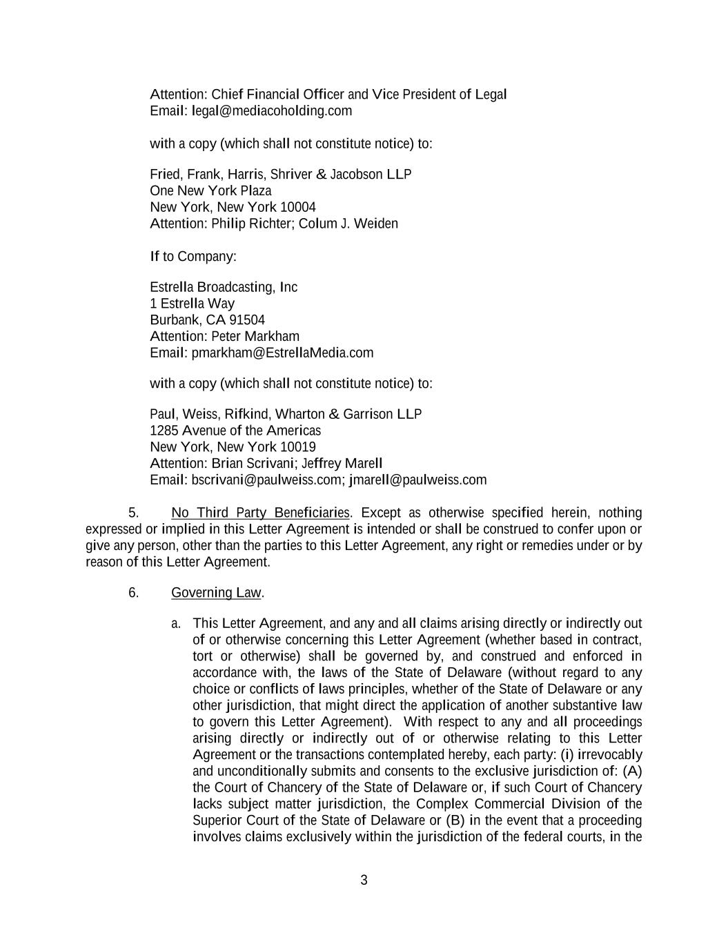 3 Attention: Chief Financial Officer and Vice President of Legal Email: legal@mediacoholding.com with a copy (which shall not constitute notice) to: Fried, Frank, Harris, Shriver & Jacobson LLP One New York Plaza New York, New York 10004 Attention: Philip Richter; Colum J. Weiden If to Company: Estrella Broadcasting, Inc 1 Estrella Way Burbank, CA 91504 Attention: Peter Markham Email: pmarkham@EstrellaMedia.com with a copy (which shall not constitute notice) to: Paul, Weiss, Rifkind, Wharton & Garrison LLP 1285 Avenue of the Americas New York, New York 10019 Attention: Brian Scrivani; Jeffrey Marell Email: bscrivani@paulweiss.com; jmarell@paulweiss.com 5. No Third Party Beneficiaries. Except as otherwise specified herein, nothing expressed or implied in this Letter Agreement is intended or shall be construed to confer upon or give any person, other than the parties to this Letter Agreement, any right or remedies under or by reason of this Letter Agreement. 6. Governing Law. a. This Letter Agreement, and any and all claims arising directly or indirectly out of or otherwise concerning this Letter Agreement (whether based in contract, tort or otherwise) shall be governed by, and construed and enforced in accordance with, the laws of the State of Delaware (without regard to any choice or conflicts of laws principles, whether of the State of Delaware or any other jurisdiction, that might direct the application of another substantive law to govern this Letter Agreement). With respect to any and all proceedings arising directly or indirectly out of or otherwise relating to this Letter Agreement or the transactions contemplated hereby, each party: (i) irrevocably and unconditionally submits and consents to the exclusive jurisdiction of: (A) the Court of Chancery of the State of Delaware or, if such Court of Chancery lacks subject matter jurisdiction, the Complex Commercial Division of the Superior Court of the State of Delaware or (B) in the event that a proceeding involves claims exclusively within the jurisdiction of the federal courts, in the