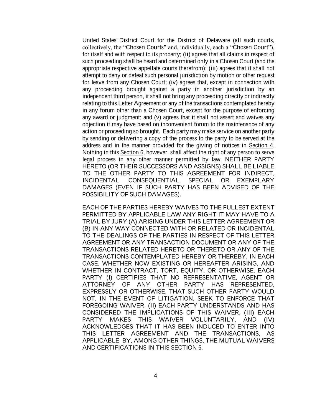 4 United States District Court for the District of Delaware (all such courts, collectively, the “Chosen Courts” and, individually, each a “Chosen Court”), for itself and with respect to its property; (ii) agrees that all claims in respect of such proceeding shall be heard and determined only in a Chosen Court (and the appropriate respective appellate courts therefrom); (iii) agrees that it shall not attempt to deny or defeat such personal jurisdiction by motion or other request for leave from any Chosen Court; (iv) agrees that, except in connection with any proceeding brought against a party in another jurisdiction by an independent third person, it shall not bring any proceeding directly or indirectly relating to this Letter Agreement or any of the transactions contemplated hereby in any forum other than a Chosen Court, except for the purpose of enforcing any award or judgment; and (v) agrees that it shall not assert and waives any objection it may have based on inconvenient forum to the maintenance of any action or proceeding so brought. Each party may make service on another party by sending or delivering a copy of the process to the party to be served at the address and in the manner provided for the giving of notices in Section 4. Nothing in this Section 6, however, shall affect the right of any person to serve legal process in any other manner permitted by law. NEITHER PARTY HERETO (OR THEIR SUCCESSORS AND ASSIGNS) SHALL BE LIABLE TO THE OTHER PARTY TO THIS AGREEMENT FOR INDIRECT, INCIDENTAL, CONSEQUENTIAL, SPECIAL OR EXEMPLARY DAMAGES (EVEN IF SUCH PARTY HAS BEEN ADVISED OF THE POSSIBILITY OF SUCH DAMAGES). EACH OF THE PARTIES HEREBY WAIVES TO THE FULLEST EXTENT PERMITTED BY APPLICABLE LAW ANY RIGHT IT MAY HAVE TO A TRIAL BY JURY (A) ARISING UNDER THIS LETTER AGREEMENT OR (B) IN ANY WAY CONNECTED WITH OR RELATED OR INCIDENTAL TO THE DEALINGS OF THE PARTIES IN RESPECT OF THIS LETTER AGREEMENT OR ANY TRANSACTION DOCUMENT OR ANY OF THE TRANSACTIONS RELATED HERETO OR THERETO OR ANY OF THE TRANSACTIONS CONTEMPLATED HEREBY OR THEREBY, IN EACH CASE, WHETHER NOW EXISTING OR HEREAFTER ARISING, AND WHETHER IN CONTRACT, TORT, EQUITY, OR OTHERWISE. EACH PARTY (I) CERTIFIES THAT NO REPRESENTATIVE, AGENT OR ATTORNEY OF ANY OTHER PARTY HAS REPRESENTED, EXPRESSLY OR OTHERWISE, THAT SUCH OTHER PARTY WOULD NOT, IN THE EVENT OF LITIGATION, SEEK TO ENFORCE THAT FOREGOING WAIVER, (II) EACH PARTY UNDERSTANDS AND HAS CONSIDERED THE IMPLICATIONS OF THIS WAIVER, (III) EACH PARTY MAKES THIS WAIVER VOLUNTARILY, AND (IV) ACKNOWLEDGES THAT IT HAS BEEN INDUCED TO ENTER INTO THIS LETTER AGREEMENT AND THE TRANSACTIONS, AS APPLICABLE, BY, AMONG OTHER THINGS, THE MUTUAL WAIVERS AND CERTIFICATIONS IN THIS SECTION 6.