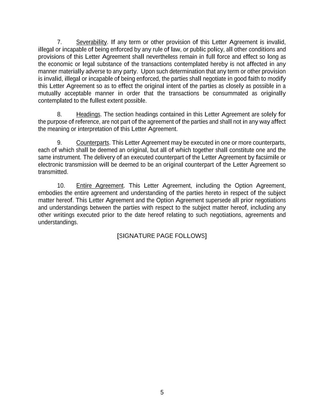 5 7. Severability. If any term or other provision of this Letter Agreement is invalid, illegal or incapable of being enforced by any rule of law, or public policy, all other conditions and provisions of this Letter Agreement shall nevertheless remain in full force and effect so long as the economic or legal substance of the transactions contemplated hereby is not affected in any manner materially adverse to any party. Upon such determination that any term or other provision is invalid, illegal or incapable of being enforced, the parties shall negotiate in good faith to modify this Letter Agreement so as to effect the original intent of the parties as closely as possible in a mutually acceptable manner in order that the transactions be consummated as originally contemplated to the fullest extent possible. 8. Headings. The section headings contained in this Letter Agreement are solely for the purpose of reference, are not part of the agreement of the parties and shall not in any way affect the meaning or interpretation of this Letter Agreement. 9. Counterparts. This Letter Agreement may be executed in one or more counterparts, each of which shall be deemed an original, but all of which together shall constitute one and the same instrument. The delivery of an executed counterpart of the Letter Agreement by facsimile or electronic transmission will be deemed to be an original counterpart of the Letter Agreement so transmitted. 10. Entire Agreement. This Letter Agreement, including the Option Agreement, embodies the entire agreement and understanding of the parties hereto in respect of the subject matter hereof. This Letter Agreement and the Option Agreement supersede all prior negotiations and understandings between the parties with respect to the subject matter hereof, including any other writings executed prior to the date hereof relating to such negotiations, agreements and understandings. [SIGNATURE PAGE FOLLOWS]