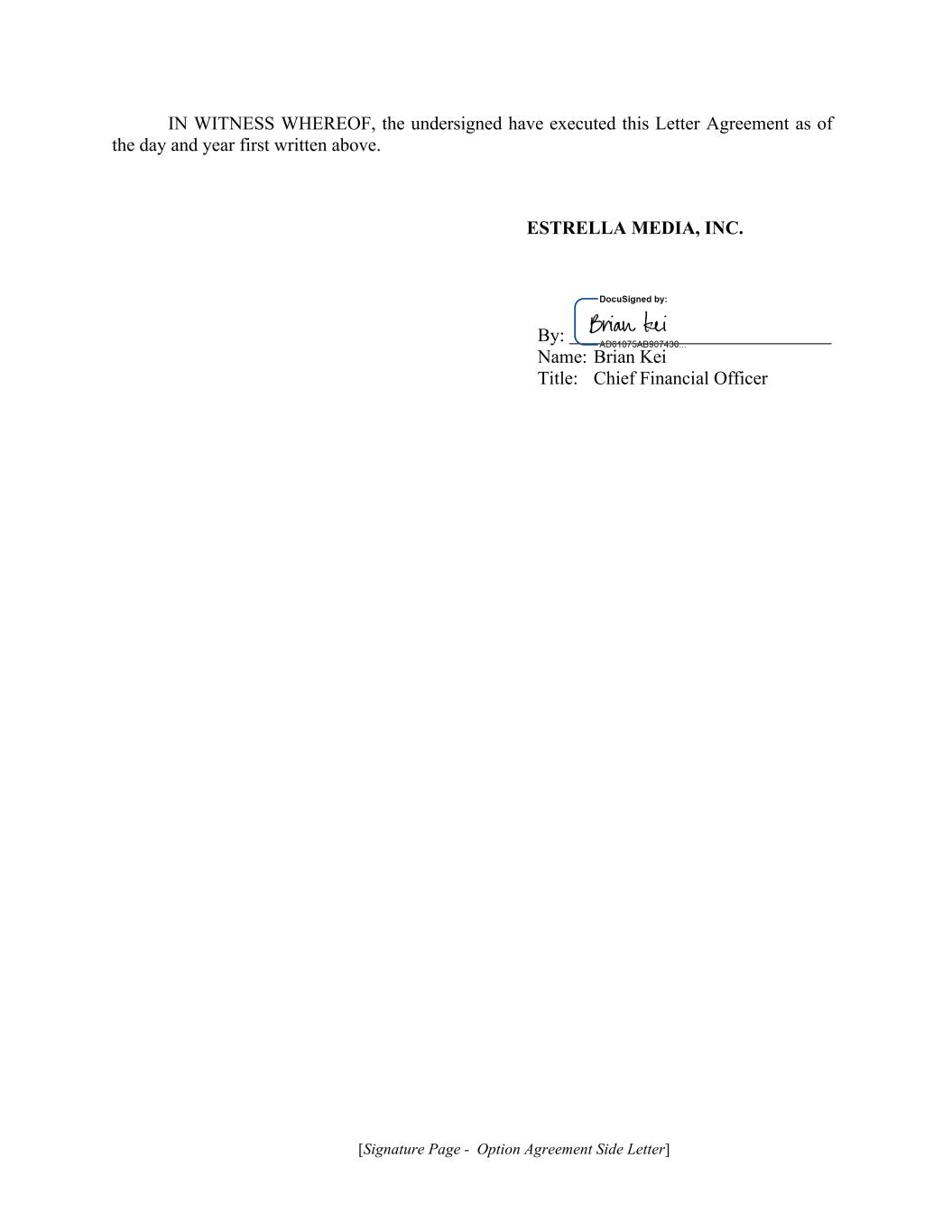 [Signature Page - Option Agreement Side Letter] IN WITNESS WHEREOF, the undersigned have executed this Letter Agreement as of the day and year first written above. ESTRELLA MEDIA, INC. By: Name: Brian Kei Title: Chief Financial Officer