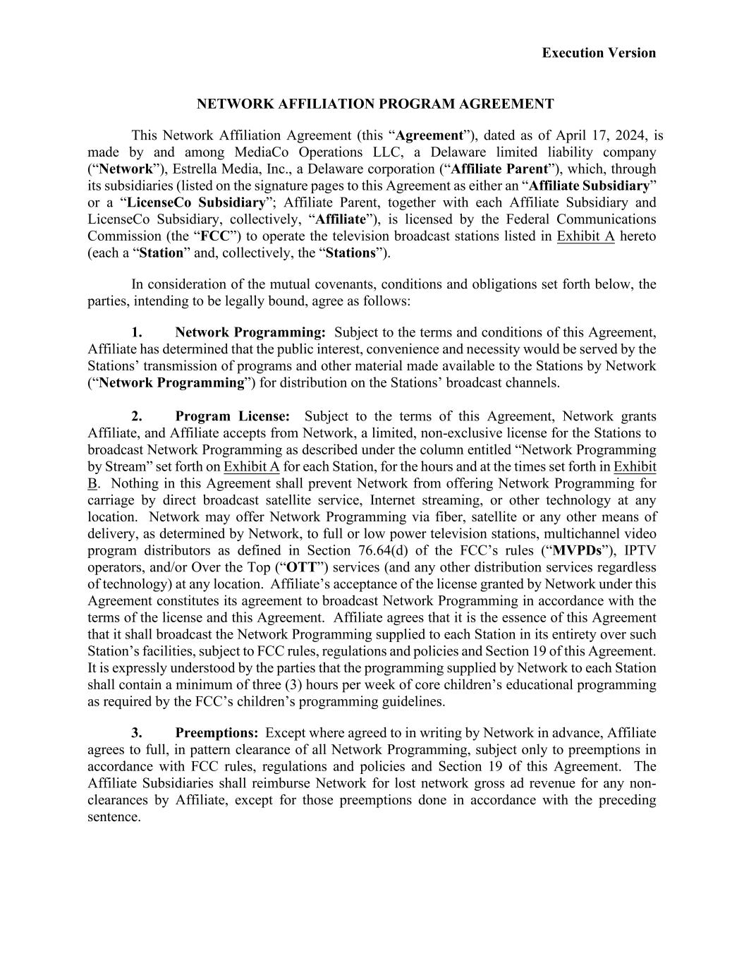 Execution Version NETWORK AFFILIATION PROGRAM AGREEMENT This Network Affiliation Agreement (this “Agreement”), dated as of April 17, 2024, is made by and among MediaCo Operations LLC, a Delaware limited liability company (“Network”), Estrella Media, Inc., a Delaware corporation (“Affiliate Parent”), which, through its subsidiaries (listed on the signature pages to this Agreement as either an “Affiliate Subsidiary” or a “LicenseCo Subsidiary”; Affiliate Parent, together with each Affiliate Subsidiary and LicenseCo Subsidiary, collectively, “Affiliate”), is licensed by the Federal Communications Commission (the “FCC”) to operate the television broadcast stations listed in Exhibit A hereto (each a “Station” and, collectively, the “Stations”). In consideration of the mutual covenants, conditions and obligations set forth below, the parties, intending to be legally bound, agree as follows: 1. Network Programming: Subject to the terms and conditions of this Agreement, Affiliate has determined that the public interest, convenience and necessity would be served by the Stations’ transmission of programs and other material made available to the Stations by Network (“Network Programming”) for distribution on the Stations’ broadcast channels. 2. Program License: Subject to the terms of this Agreement, Network grants Affiliate, and Affiliate accepts from Network, a limited, non-exclusive license for the Stations to broadcast Network Programming as described under the column entitled “Network Programming by Stream” set forth on Exhibit A for each Station, for the hours and at the times set forth in Exhibit B. Nothing in this Agreement shall prevent Network from offering Network Programming for carriage by direct broadcast satellite service, Internet streaming, or other technology at any location. Network may offer Network Programming via fiber, satellite or any other means of delivery, as determined by Network, to full or low power television stations, multichannel video program distributors as defined in Section 76.64(d) of the FCC’s rules (“MVPDs”), IPTV operators, and/or Over the Top (“OTT”) services (and any other distribution services regardless of technology) at any location. Affiliate’s acceptance of the license granted by Network under this Agreement constitutes its agreement to broadcast Network Programming in accordance with the terms of the license and this Agreement. Affiliate agrees that it is the essence of this Agreement that it shall broadcast the Network Programming supplied to each Station in its entirety over such Station’s facilities, subject to FCC rules, regulations and policies and Section 19 of this Agreement. It is expressly understood by the parties that the programming supplied by Network to each Station shall contain a minimum of three (3) hours per week of core children’s educational programming as required by the FCC’s children’s programming guidelines. 3. Preemptions: Except where agreed to in writing by Network in advance, Affiliate agrees to full, in pattern clearance of all Network Programming, subject only to preemptions in accordance with FCC rules, regulations and policies and Section 19 of this Agreement. The Affiliate Subsidiaries shall reimburse Network for lost network gross ad revenue for any non- clearances by Affiliate, except for those preemptions done in accordance with the preceding sentence.
