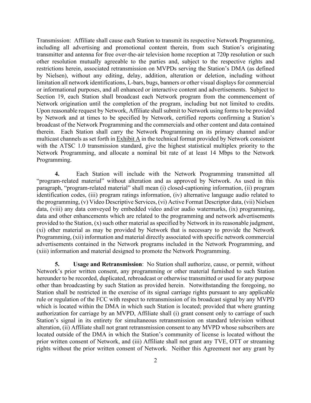 2 Transmission: Affiliate shall cause each Station to transmit its respective Network Programming, including all advertising and promotional content therein, from such Station’s originating transmitter and antenna for free over-the-air television home reception at 720p resolution or such other resolution mutually agreeable to the parties and, subject to the respective rights and restrictions herein, associated retransmission on MVPDs serving the Station’s DMA (as defined by Nielsen), without any editing, delay, addition, alteration or deletion, including without limitation all network identifications, L-bars, bugs, banners or other visual displays for commercial or informational purposes, and all enhanced or interactive content and advertisements. Subject to Section 19, each Station shall broadcast each Network program from the commencement of Network origination until the completion of the program, including but not limited to credits. Upon reasonable request by Network, Affiliate shall submit to Network using forms to be provided by Network and at times to be specified by Network, certified reports confirming a Station’s broadcast of the Network Programming and the commercials and other content and data contained therein. Each Station shall carry the Network Programming on its primary channel and/or multicast channels as set forth in Exhibit A in the technical format provided by Network consistent with the ATSC 1.0 transmission standard, give the highest statistical multiplex priority to the Network Programming, and allocate a nominal bit rate of at least 14 Mbps to the Network Programming. 4. Each Station will include with the Network Programming transmitted all “program-related material” without alteration and as approved by Network. As used in this paragraph, “program-related material” shall mean (i) closed-captioning information, (ii) program identification codes, (iii) program ratings information, (iv) alternative language audio related to the programming, (v) Video Descriptive Services, (vi) Active Format Descriptor data, (vii) Nielsen data, (viii) any data conveyed by embedded video and/or audio watermarks, (ix) programming, data and other enhancements which are related to the programming and network advertisements provided to the Station, (x) such other material as specified by Network in its reasonable judgment, (xi) other material as may be provided by Network that is necessary to provide the Network Programming, (xii) information and material directly associated with specific network commercial advertisements contained in the Network programs included in the Network Programming, and (xiii) information and material designed to promote the Network Programming. 5. Usage and Retransmission: No Station shall authorize, cause, or permit, without Network’s prior written consent, any programming or other material furnished to such Station hereunder to be recorded, duplicated, rebroadcast or otherwise transmitted or used for any purpose other than broadcasting by such Station as provided herein. Notwithstanding the foregoing, no Station shall be restricted in the exercise of its signal carriage rights pursuant to any applicable rule or regulation of the FCC with respect to retransmission of its broadcast signal by any MVPD which is located within the DMA in which such Station is located; provided that where granting authorization for carriage by an MVPD, Affiliate shall (i) grant consent only to carriage of such Station’s signal in its entirety for simultaneous retransmission on standard television without alteration, (ii) Affiliate shall not grant retransmission consent to any MVPD whose subscribers are located outside of the DMA in which the Station’s community of license is located without the prior written consent of Network, and (iii) Affiliate shall not grant any TVE, OTT or streaming rights without the prior written consent of Network. Neither this Agreement nor any grant by