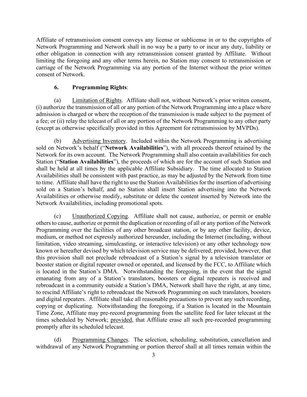 3 Affiliate of retransmission consent conveys any license or sublicense in or to the copyrights of Network Programming and Network shall in no way be a party to or incur any duty, liability or other obligation in connection with any retransmission consent granted by Affiliate. Without limiting the foregoing and any other terms herein, no Station may consent to retransmission or carriage of the Network Programming via any portion of the Internet without the prior written consent of Network. 6. Programming Rights: (a) Limitation of Rights. Affiliate shall not, without Network’s prior written consent, (i) authorize the transmission of all or any portion of the Network Programming into a place where admission is charged or where the reception of the transmission is made subject to the payment of a fee; or (ii) relay the telecast of all or any portion of the Network Programming to any other party (except as otherwise specifically provided in this Agreement for retransmission by MVPDs). (b) Advertising Inventory. Included within the Network Programming is advertising sold on Network’s behalf (“Network Availabilities”), with all proceeds thereof retained by the Network for its own account. The Network Programming shall also contain availabilities for each Station (“Station Availabilities”), the proceeds of which are for the account of such Station and shall be held at all times by the applicable Affiliate Subsidiary. The time allocated to Station Availabilities shall be consistent with past practice, as may be adjusted by the Network from time to time. Affiliate shall have the right to use the Station Availabilities for the insertion of advertising sold on a Station’s behalf, and no Station shall insert Station advertising into the Network Availabilities or otherwise modify, substitute or delete the content inserted by Network into the Network Availabilities, including promotional spots. (c) Unauthorized Copying. Affiliate shall not cause, authorize, or permit or enable others to cause, authorize or permit the duplication or recording of all or any portion of the Network Programming over the facilities of any other broadcast station, or by any other facility, device, medium, or method not expressly authorized hereunder, including the Internet (including, without limitation, video streaming, simulcasting, or interactive television) or any other technology now known or hereafter devised by which television service may be delivered; provided, however, that this provision shall not preclude rebroadcast of a Station’s signal by a television translator or booster station or digital repeater owned or operated, and licensed by the FCC, to Affiliate which is located in the Station’s DMA. Notwithstanding the foregoing, in the event that the signal emanating from any of a Station’s translators, boosters or digital repeaters is received and rebroadcast in a community outside a Station’s DMA, Network shall have the right, at any time, to rescind Affiliate’s right to rebroadcast the Network Programming on such translators, boosters and digital repeaters. Affiliate shall take all reasonable precautions to prevent any such recording, copying or duplicating. Notwithstanding the foregoing, if a Station is located in the Mountain Time Zone, Affiliate may pre-record programming from the satellite feed for later telecast at the times scheduled by Network; provided, that Affiliate erase all such pre-recorded programming promptly after its scheduled telecast. (d) Programming Changes. The selection, scheduling, substitution, cancellation and withdrawal of any Network Programming or portion thereof shall at all times remain within the