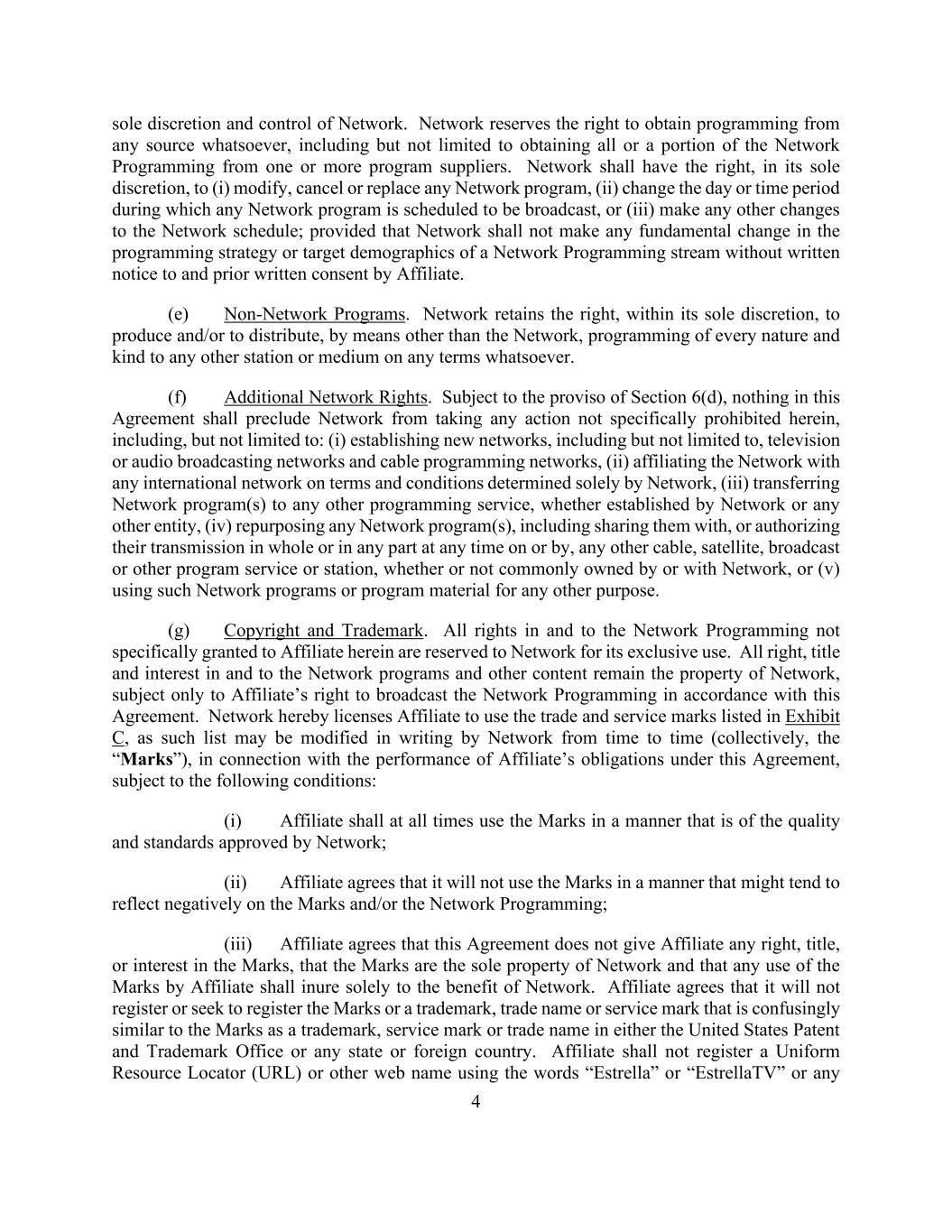 4 sole discretion and control of Network. Network reserves the right to obtain programming from any source whatsoever, including but not limited to obtaining all or a portion of the Network Programming from one or more program suppliers. Network shall have the right, in its sole discretion, to (i) modify, cancel or replace any Network program, (ii) change the day or time period during which any Network program is scheduled to be broadcast, or (iii) make any other changes to the Network schedule; provided that Network shall not make any fundamental change in the programming strategy or target demographics of a Network Programming stream without written notice to and prior written consent by Affiliate. (e) Non-Network Programs. Network retains the right, within its sole discretion, to produce and/or to distribute, by means other than the Network, programming of every nature and kind to any other station or medium on any terms whatsoever. (f) Additional Network Rights. Subject to the proviso of Section 6(d), nothing in this Agreement shall preclude Network from taking any action not specifically prohibited herein, including, but not limited to: (i) establishing new networks, including but not limited to, television or audio broadcasting networks and cable programming networks, (ii) affiliating the Network with any international network on terms and conditions determined solely by Network, (iii) transferring Network program(s) to any other programming service, whether established by Network or any other entity, (iv) repurposing any Network program(s), including sharing them with, or authorizing their transmission in whole or in any part at any time on or by, any other cable, satellite, broadcast or other program service or station, whether or not commonly owned by or with Network, or (v) using such Network programs or program material for any other purpose. (g) Copyright and Trademark. All rights in and to the Network Programming not specifically granted to Affiliate herein are reserved to Network for its exclusive use. All right, title and interest in and to the Network programs and other content remain the property of Network, subject only to Affiliate’s right to broadcast the Network Programming in accordance with this Agreement. Network hereby licenses Affiliate to use the trade and service marks listed in Exhibit C, as such list may be modified in writing by Network from time to time (collectively, the “Marks”), in connection with the performance of Affiliate’s obligations under this Agreement, subject to the following conditions: (i) Affiliate shall at all times use the Marks in a manner that is of the quality and standards approved by Network; (ii) Affiliate agrees that it will not use the Marks in a manner that might tend to reflect negatively on the Marks and/or the Network Programming; (iii) Affiliate agrees that this Agreement does not give Affiliate any right, title, or interest in the Marks, that the Marks are the sole property of Network and that any use of the Marks by Affiliate shall inure solely to the benefit of Network. Affiliate agrees that it will not register or seek to register the Marks or a trademark, trade name or service mark that is confusingly similar to the Marks as a trademark, service mark or trade name in either the United States Patent and Trademark Office or any state or foreign country. Affiliate shall not register a Uniform Resource Locator (URL) or other web name using the words “Estrella” or “EstrellaTV” or any