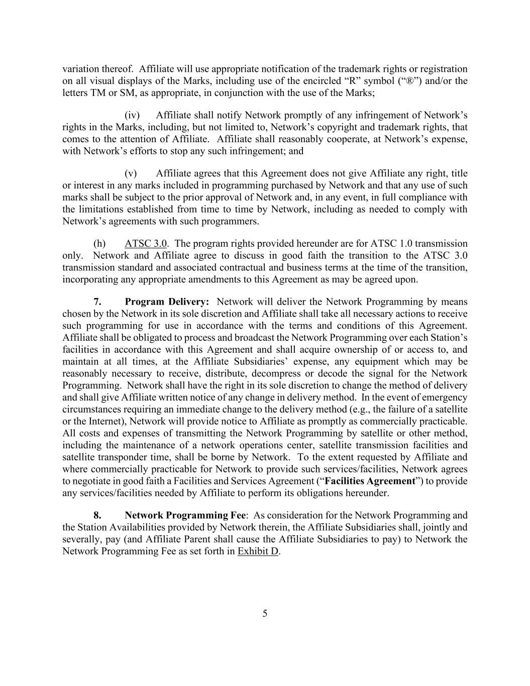 5 variation thereof. Affiliate will use appropriate notification of the trademark rights or registration on all visual displays of the Marks, including use of the encircled “R” symbol (“®”) and/or the letters TM or SM, as appropriate, in conjunction with the use of the Marks; (iv) Affiliate shall notify Network promptly of any infringement of Network’s rights in the Marks, including, but not limited to, Network’s copyright and trademark rights, that comes to the attention of Affiliate. Affiliate shall reasonably cooperate, at Network’s expense, with Network’s efforts to stop any such infringement; and (v) Affiliate agrees that this Agreement does not give Affiliate any right, title or interest in any marks included in programming purchased by Network and that any use of such marks shall be subject to the prior approval of Network and, in any event, in full compliance with the limitations established from time to time by Network, including as needed to comply with Network’s agreements with such programmers. (h) ATSC 3.0. The program rights provided hereunder are for ATSC 1.0 transmission only. Network and Affiliate agree to discuss in good faith the transition to the ATSC 3.0 transmission standard and associated contractual and business terms at the time of the transition, incorporating any appropriate amendments to this Agreement as may be agreed upon. 7. Program Delivery: Network will deliver the Network Programming by means chosen by the Network in its sole discretion and Affiliate shall take all necessary actions to receive such programming for use in accordance with the terms and conditions of this Agreement. Affiliate shall be obligated to process and broadcast the Network Programming over each Station’s facilities in accordance with this Agreement and shall acquire ownership of or access to, and maintain at all times, at the Affiliate Subsidiaries’ expense, any equipment which may be reasonably necessary to receive, distribute, decompress or decode the signal for the Network Programming. Network shall have the right in its sole discretion to change the method of delivery and shall give Affiliate written notice of any change in delivery method. In the event of emergency circumstances requiring an immediate change to the delivery method (e.g., the failure of a satellite or the Internet), Network will provide notice to Affiliate as promptly as commercially practicable. All costs and expenses of transmitting the Network Programming by satellite or other method, including the maintenance of a network operations center, satellite transmission facilities and satellite transponder time, shall be borne by Network. To the extent requested by Affiliate and where commercially practicable for Network to provide such services/facilities, Network agrees to negotiate in good faith a Facilities and Services Agreement (“Facilities Agreement”) to provide any services/facilities needed by Affiliate to perform its obligations hereunder. 8. Network Programming Fee: As consideration for the Network Programming and the Station Availabilities provided by Network therein, the Affiliate Subsidiaries shall, jointly and severally, pay (and Affiliate Parent shall cause the Affiliate Subsidiaries to pay) to Network the Network Programming Fee as set forth in Exhibit D.