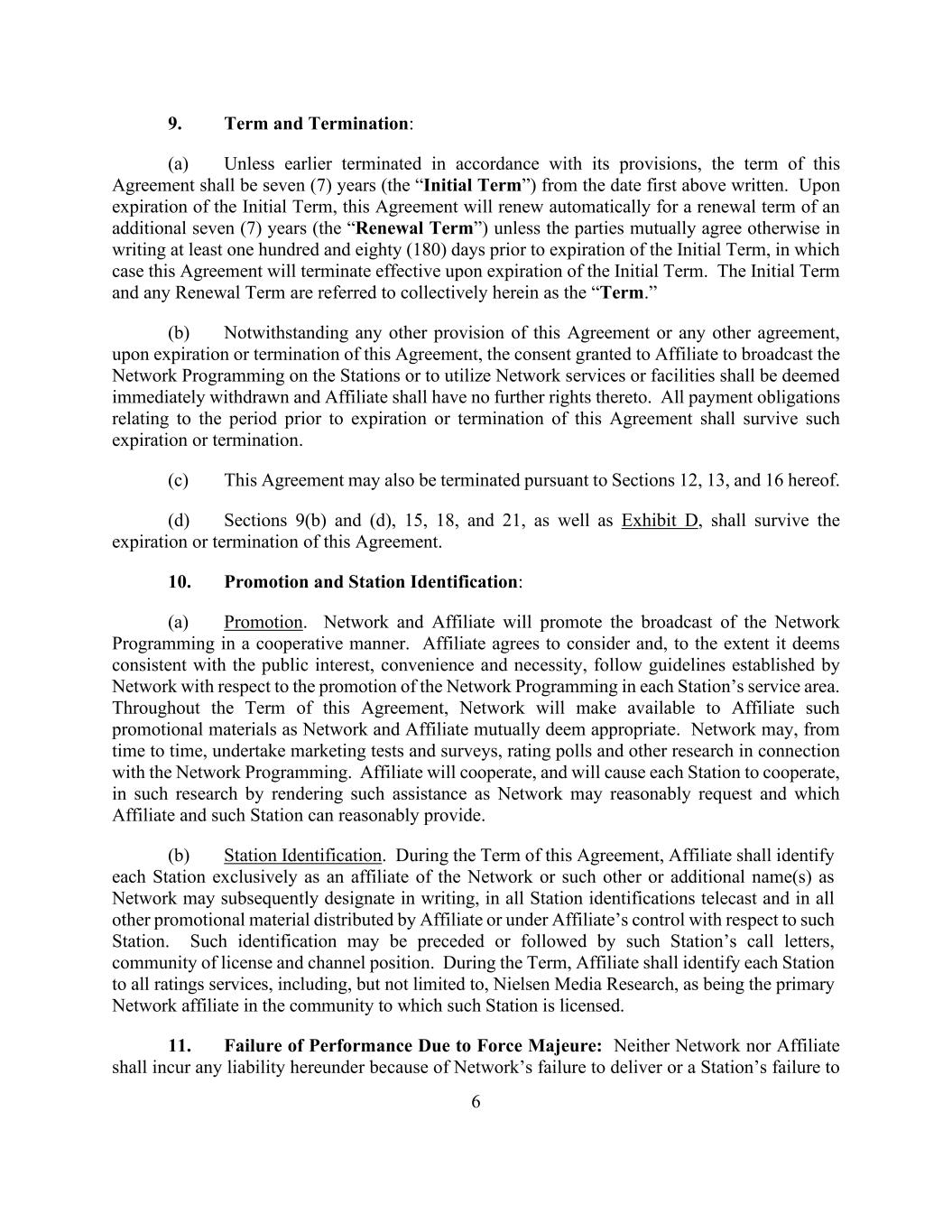 5 9. Term and Termination: (a) Unless earlier terminated in accordance with its provisions, the term of this Agreement shall be seven (7) years (the “Initial Term”) from the date first above written. Upon expiration of the Initial Term, this Agreement will renew automatically for a renewal term of an additional seven (7) years (the “Renewal Term”) unless the parties mutually agree otherwise in writing at least one hundred and eighty (180) days prior to expiration of the Initial Term, in which case this Agreement will terminate effective upon expiration of the Initial Term. The Initial Term and any Renewal Term are referred to collectively herein as the “Term.” (b) Notwithstanding any other provision of this Agreement or any other agreement, upon expiration or termination of this Agreement, the consent granted to Affiliate to broadcast the Network Programming on the Stations or to utilize Network services or facilities shall be deemed immediately withdrawn and Affiliate shall have no further rights thereto. All payment obligations relating to the period prior to expiration or termination of this Agreement shall survive such expiration or termination. (c) This Agreement may also be terminated pursuant to Sections 12, 13, and 16 hereof. (d) Sections 9(b) and (d), 15, 18, and 20, as well as Exhibit D, shall survive the expiration or termination of this Agreement. 10. Promotion and Station Identification: (a) Promotion. Network and Affiliate will promote the broadcast of the Network Programming in a cooperative manner. Affiliate agrees to consider and, to the extent it deems consistent with the public interest, convenience and necessity, follow guidelines established by Network with respect to the promotion of the Network Programming in each Station’s service area. Throughout the Term of this Agreement, Network will make available to Affiliate such promotional materials as Network and Affiliate mutually deem appropriate. Network may, from time to time, undertake marketing tests and surveys, rating polls and other research in connection with the Network Programming. Affiliate will cooperate, and will cause each Station to cooperate, in such research by rendering such assistance as Network may reasonably request and which Affiliate and such Station can reasonably provide. (b) Station Identification. During the Term of this Agreement, Affiliate shall identify each Station as currently branded or by such other or additional name(s) as Network may subsequently designate in writing, in all Station identifications broadcast and in all other promotional material distributed by Affiliate or under Affiliate’s control with respect to such Station. Such identification may be preceded or followed by such Station’s call letters, community of license and frequency. During the Term, Affiliate shall identify each Station to all ratings services, including, but not limited to, Nielsen Media Research, as being the primary Network affiliate in the community to which such Station is licensed. 11. Failure of Performance Due to Force Majeure: Neither Network nor Affiliate shall incur any liability hereunder because of Network’s failure to deliver or a Station’s failure to broadcast the Network Programming due to acts of God, non-delivery by program suppliers, legal
